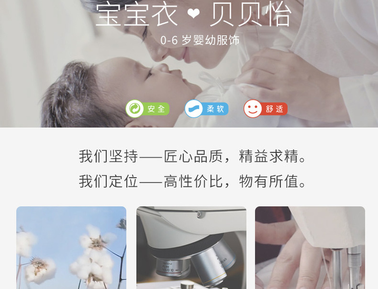 - 贝贝怡专注0-6岁婴幼儿服饰,坚持安全、柔软、舒适的产品理念,为千万中国家庭提供超高品质、安全可靠的婴幼儿服饰产品,妈妈放心,宝宝开心!
