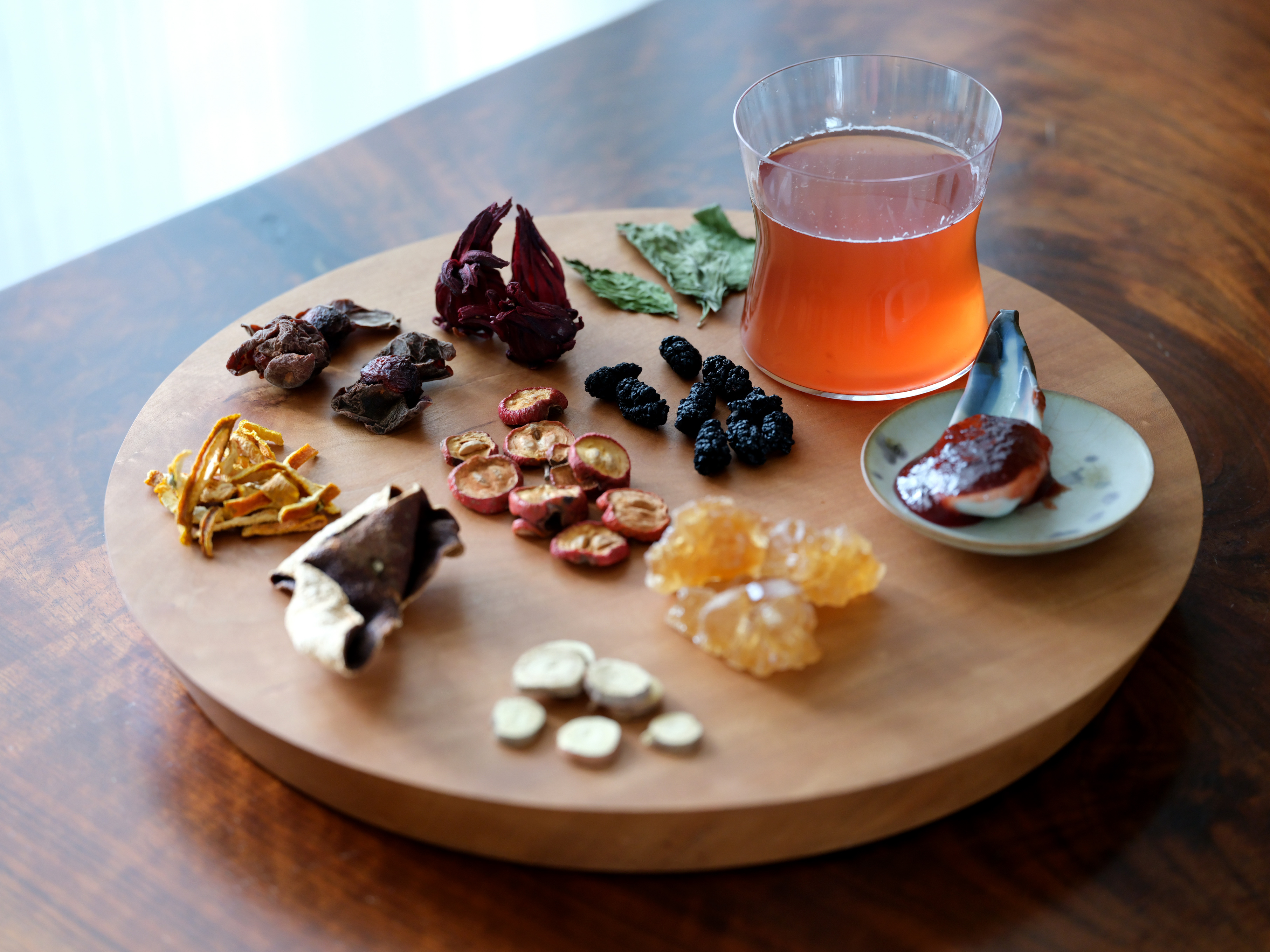 找的是力所能及的好原料:乌梅、山楂、玫瑰茄、桑椹、甘草、陈皮、薄荷、老冰糖。