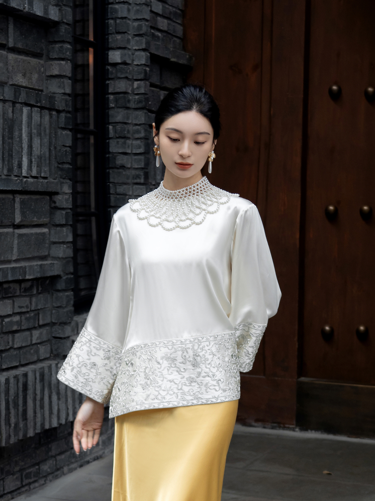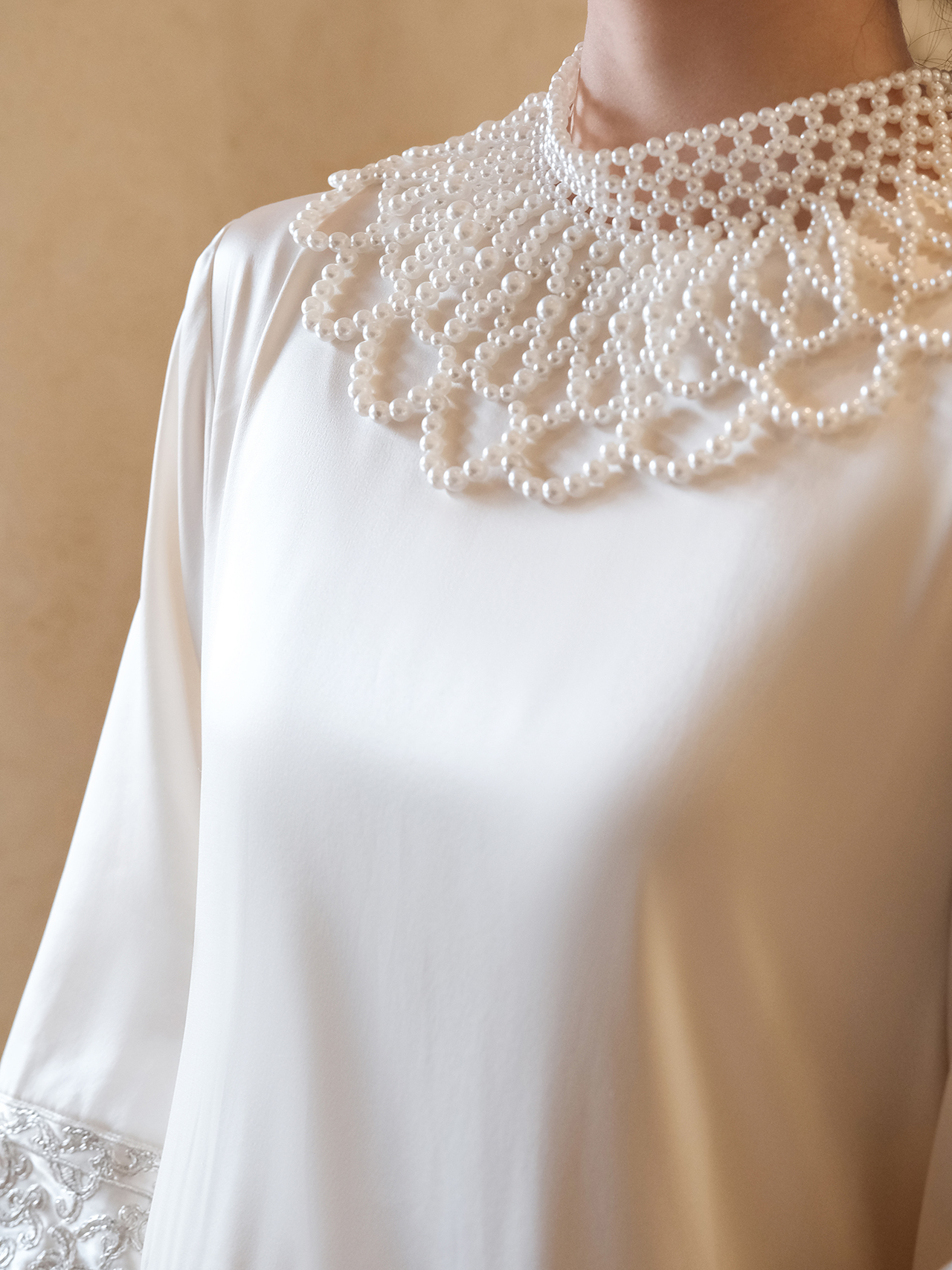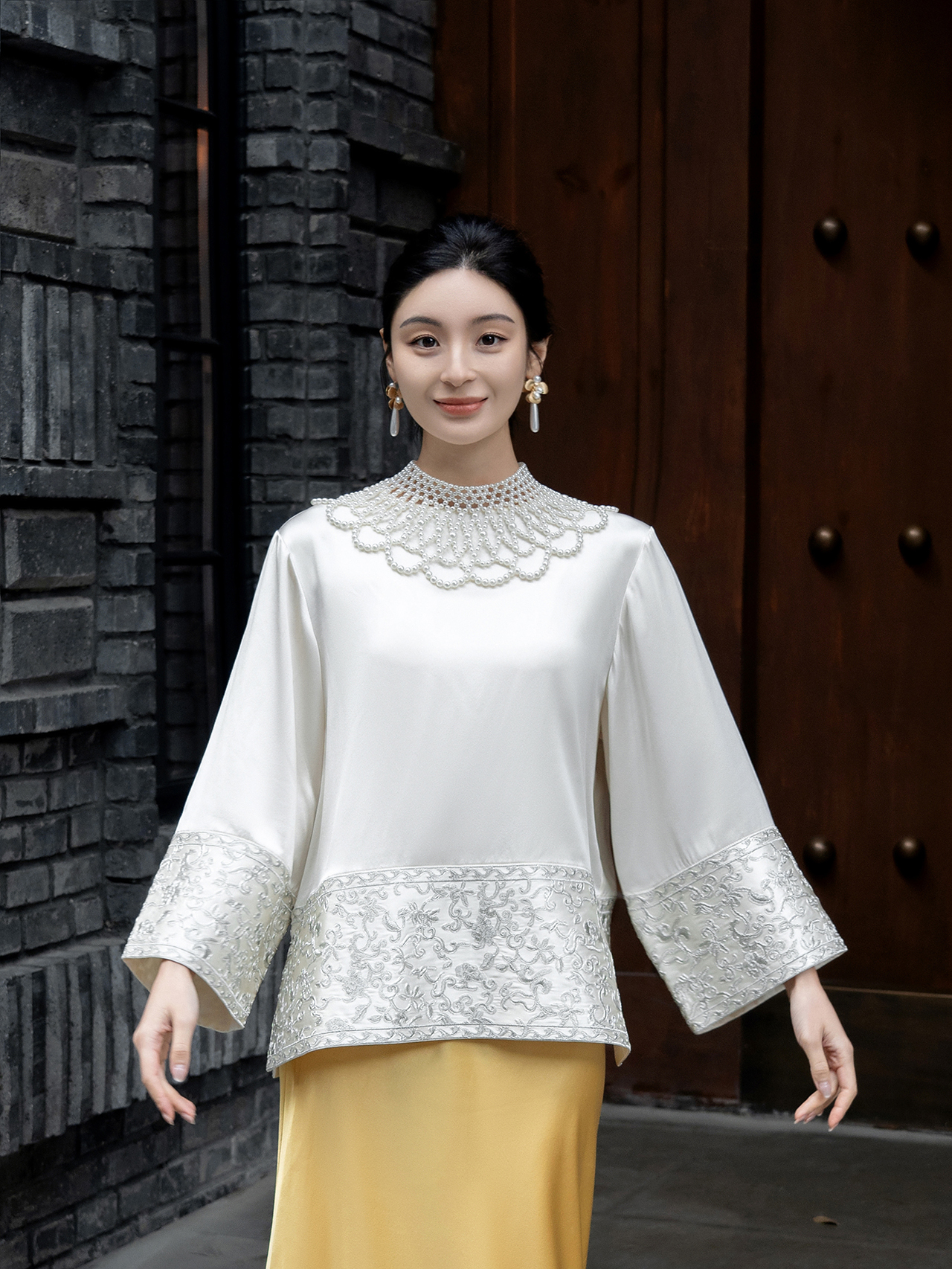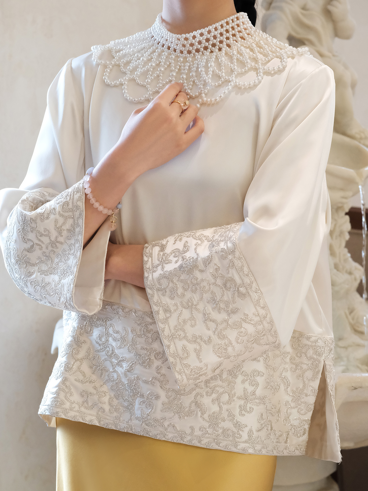 盛唐牡丹 |盘银手推绣真丝上衣+宫廷钉珠装饰云肩/珍珠白