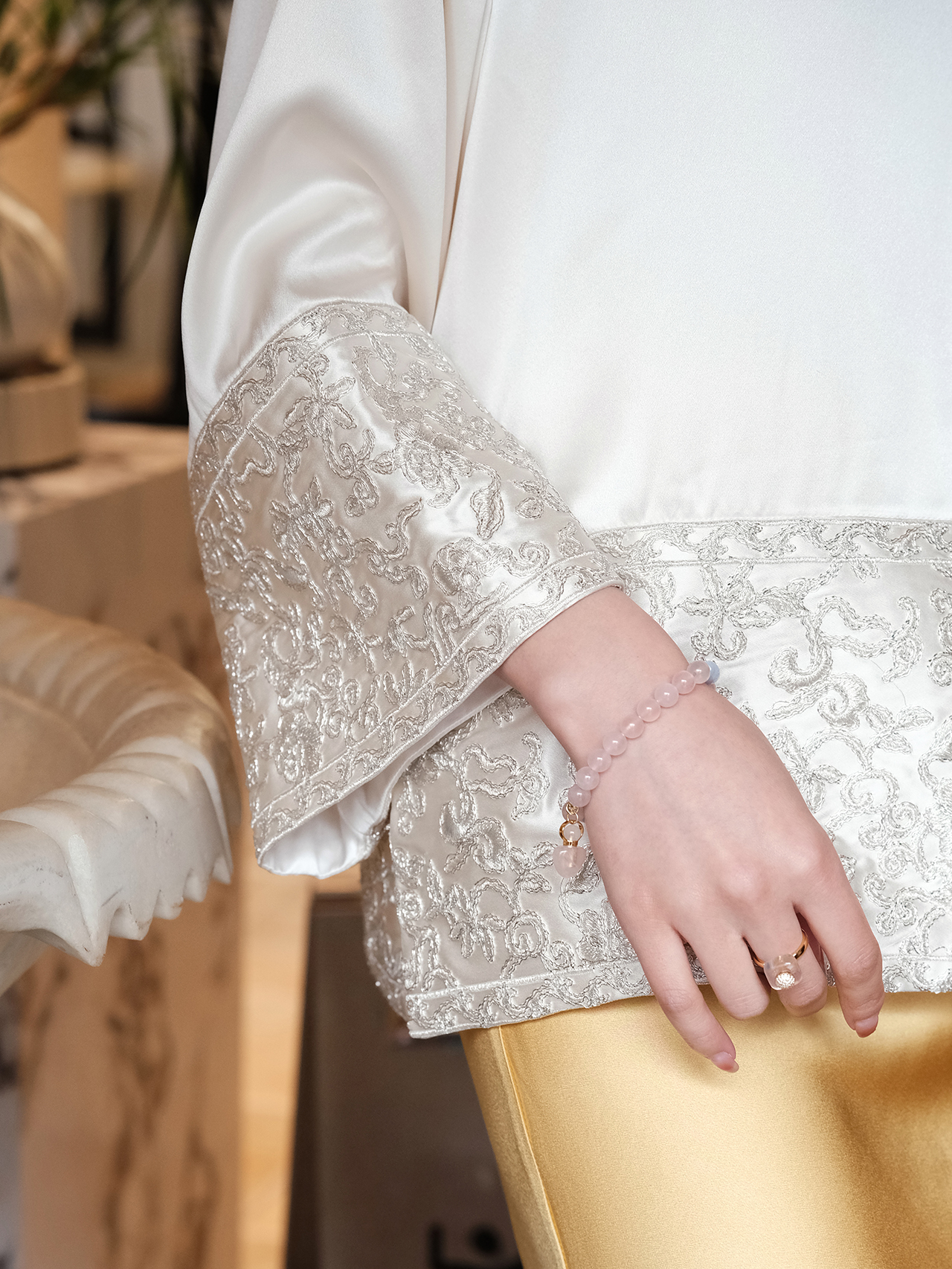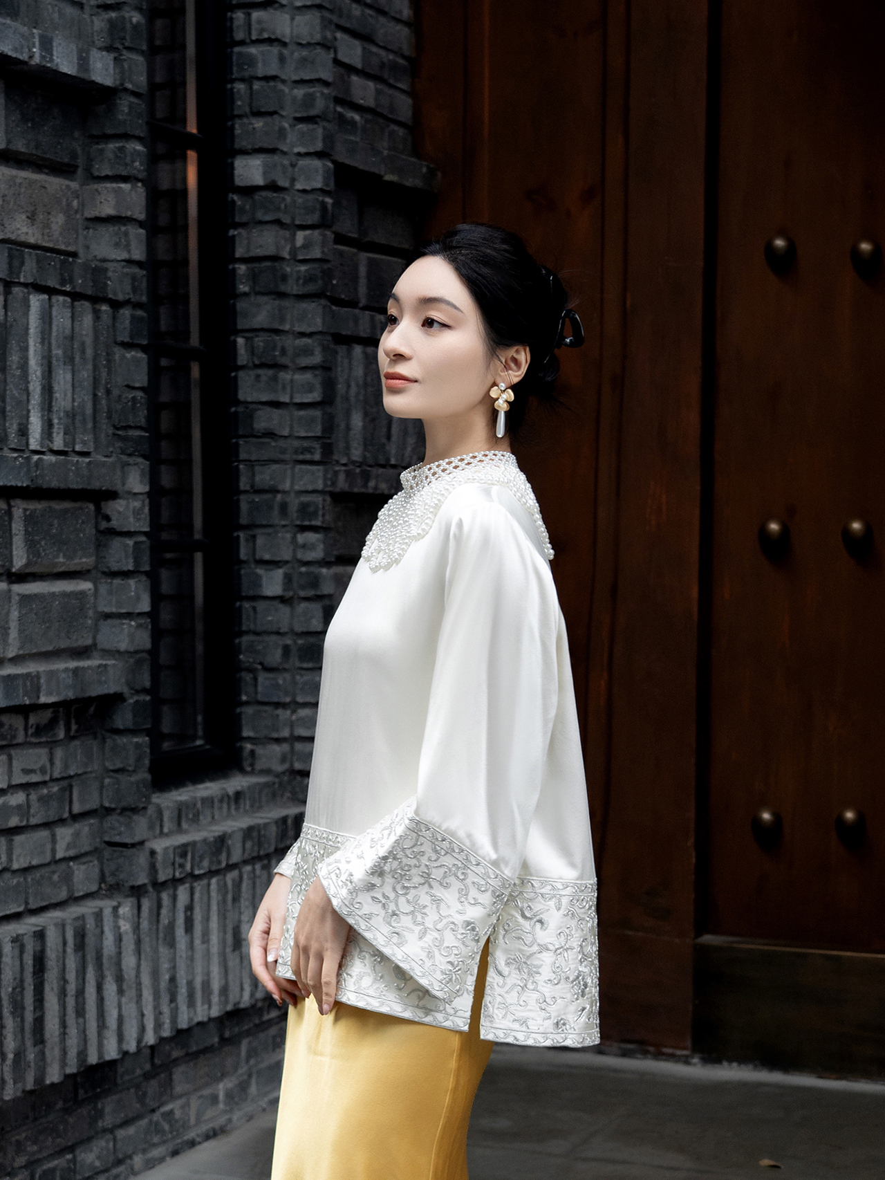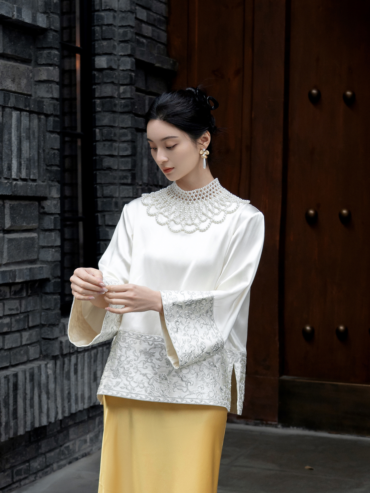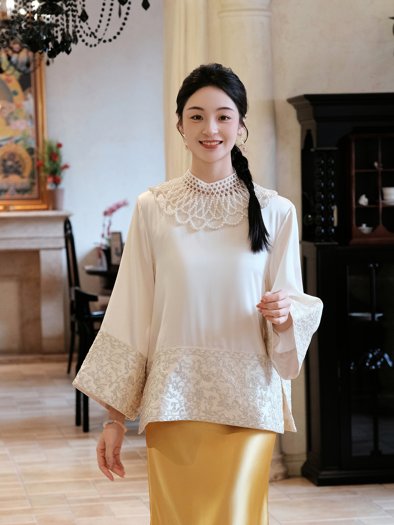 盛唐牡丹 |盘银手推绣真丝上衣+宫廷钉珠装饰云肩/珍珠白