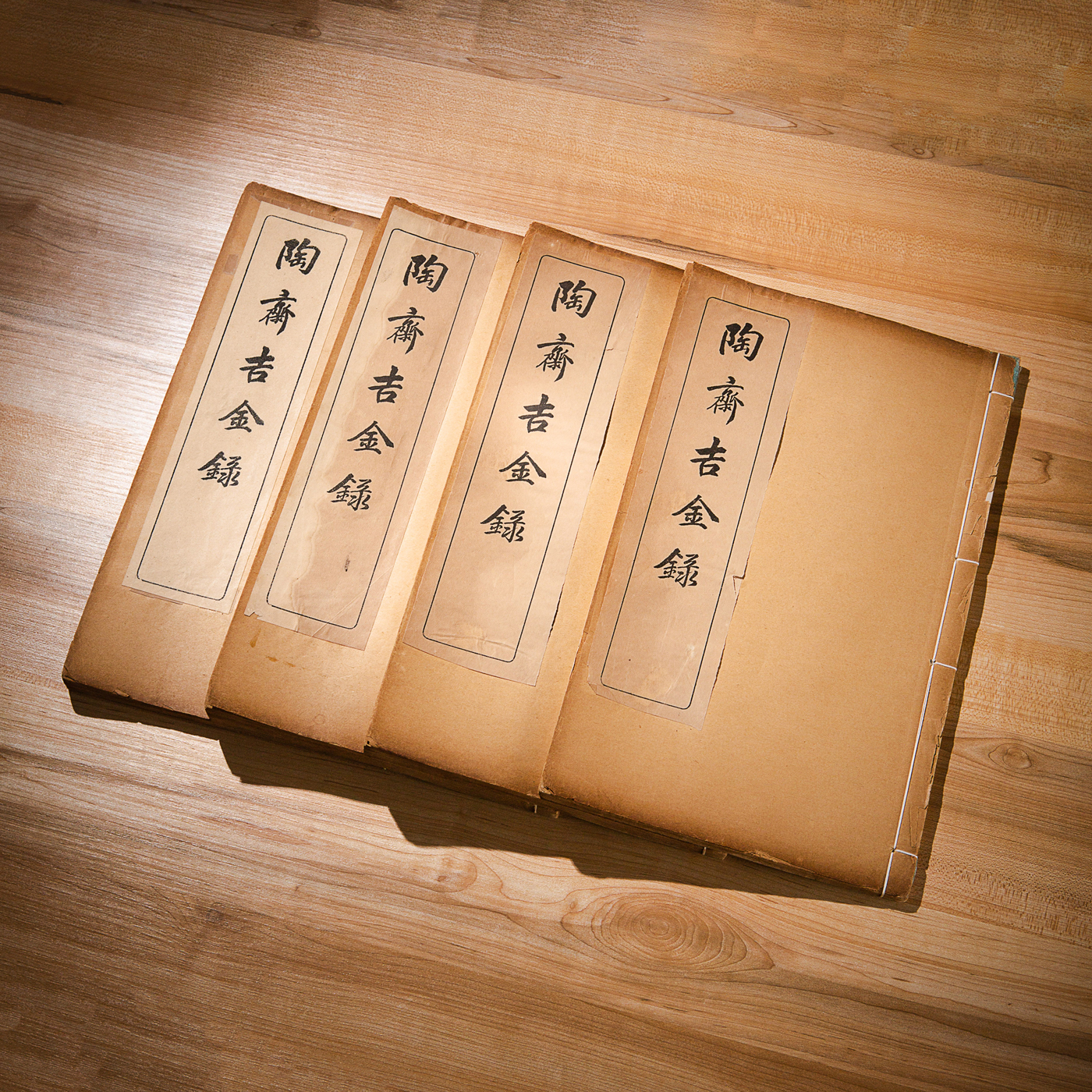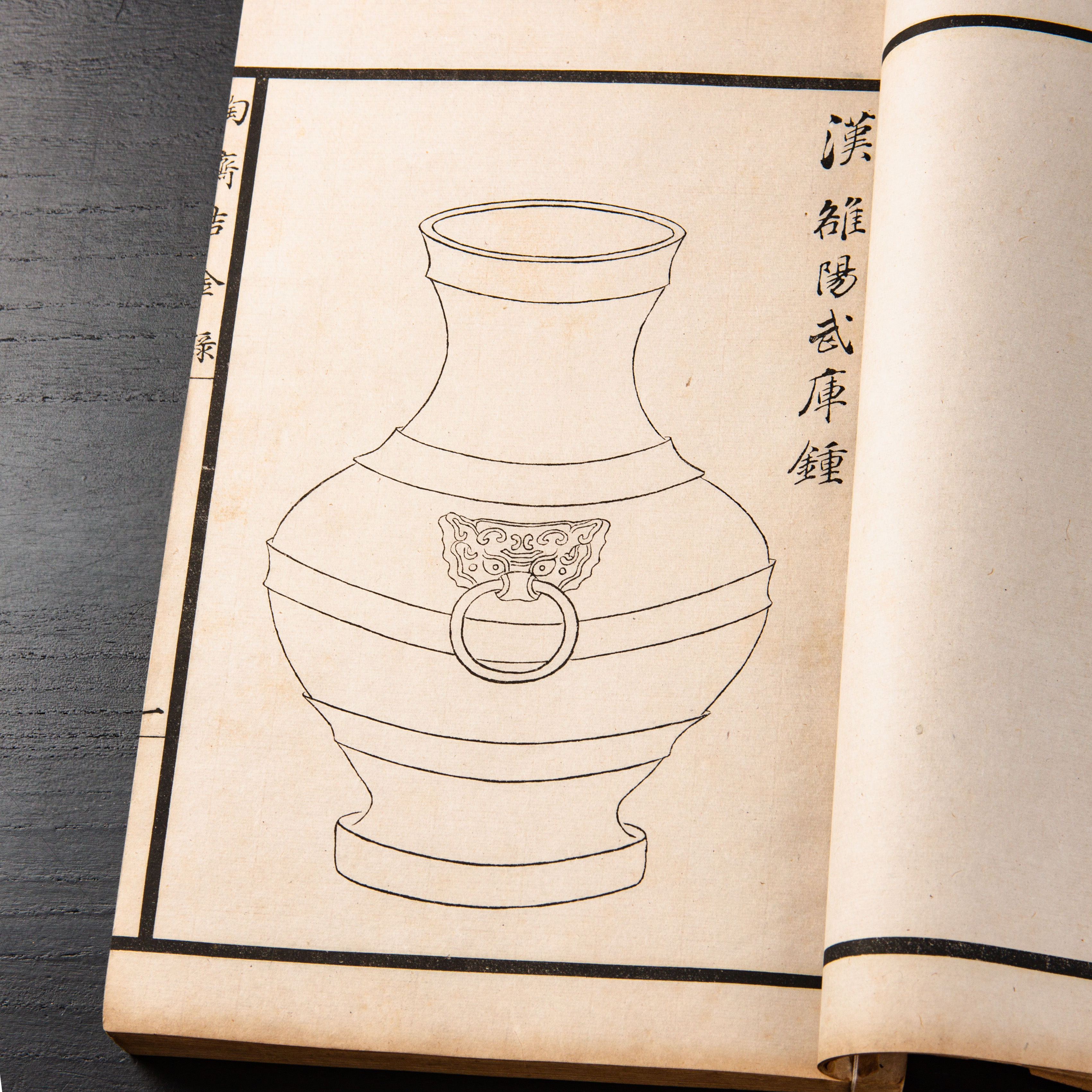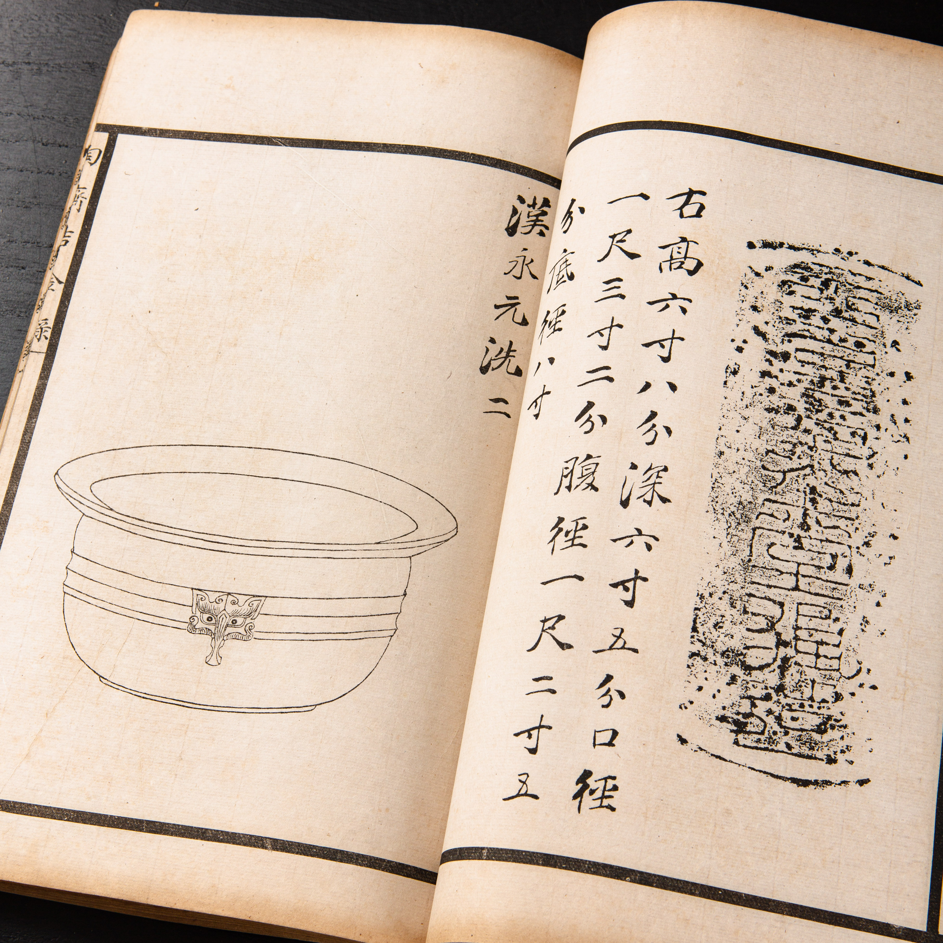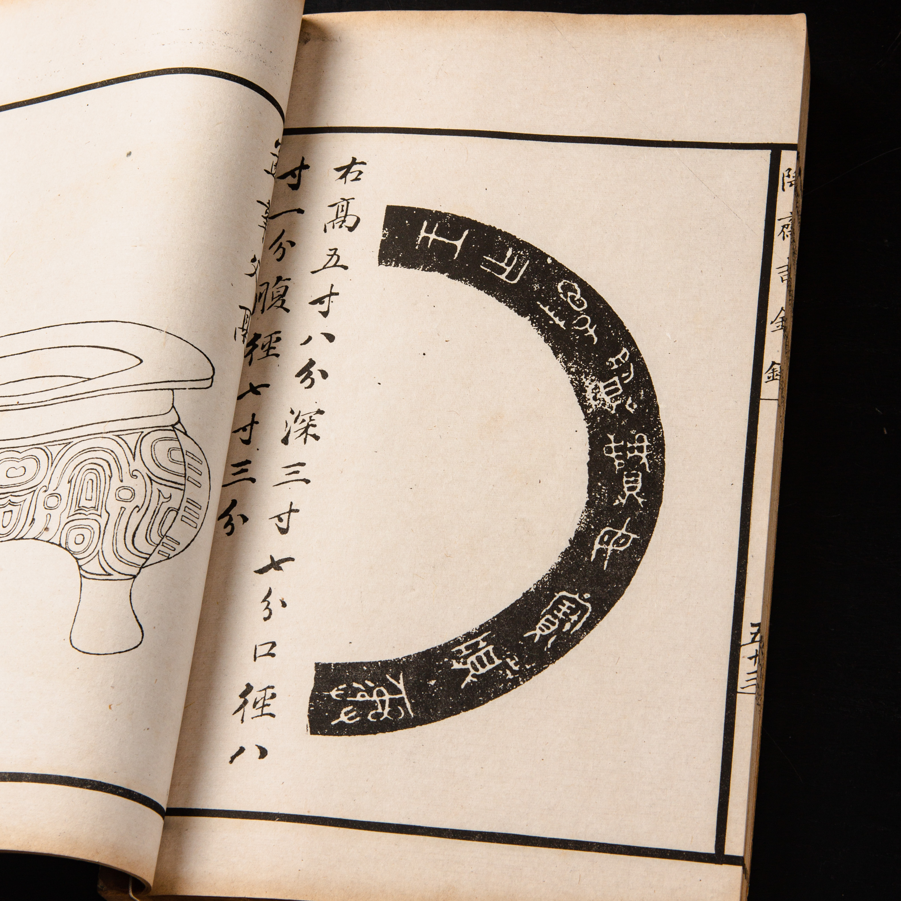《陶斋吉金录》,光绪三十四年由端方编著,该书一函八册,收录了自三代、秦汉以下的彝器及六朝以来的造像,共计359件,对每件器物都勾勒形状、摹写文字,并且都标注了尺寸,全方位展示了器物的细节,该书为研究古代礼器制度、青铜器等提供了重要资料。书中的绘图精美绝伦,是中国古代藏品绘图的巅峰之作,对研究古代绘画艺术和金石雕刻艺术具有重要的参考价值。本书所著录的器物铭文,为金石学研究和书法研究提供了丰富的资料。该书全套品相保存完好,十分难得!