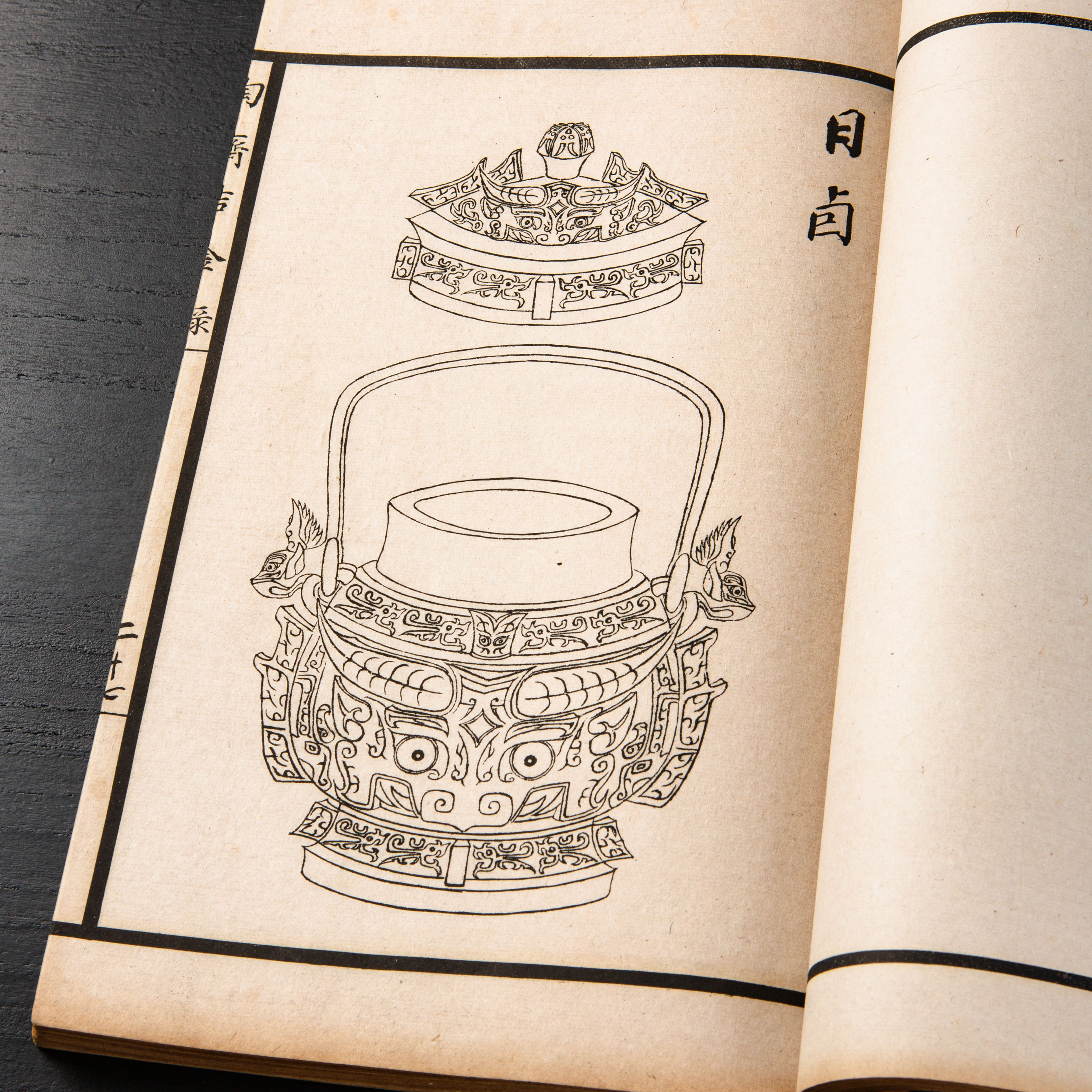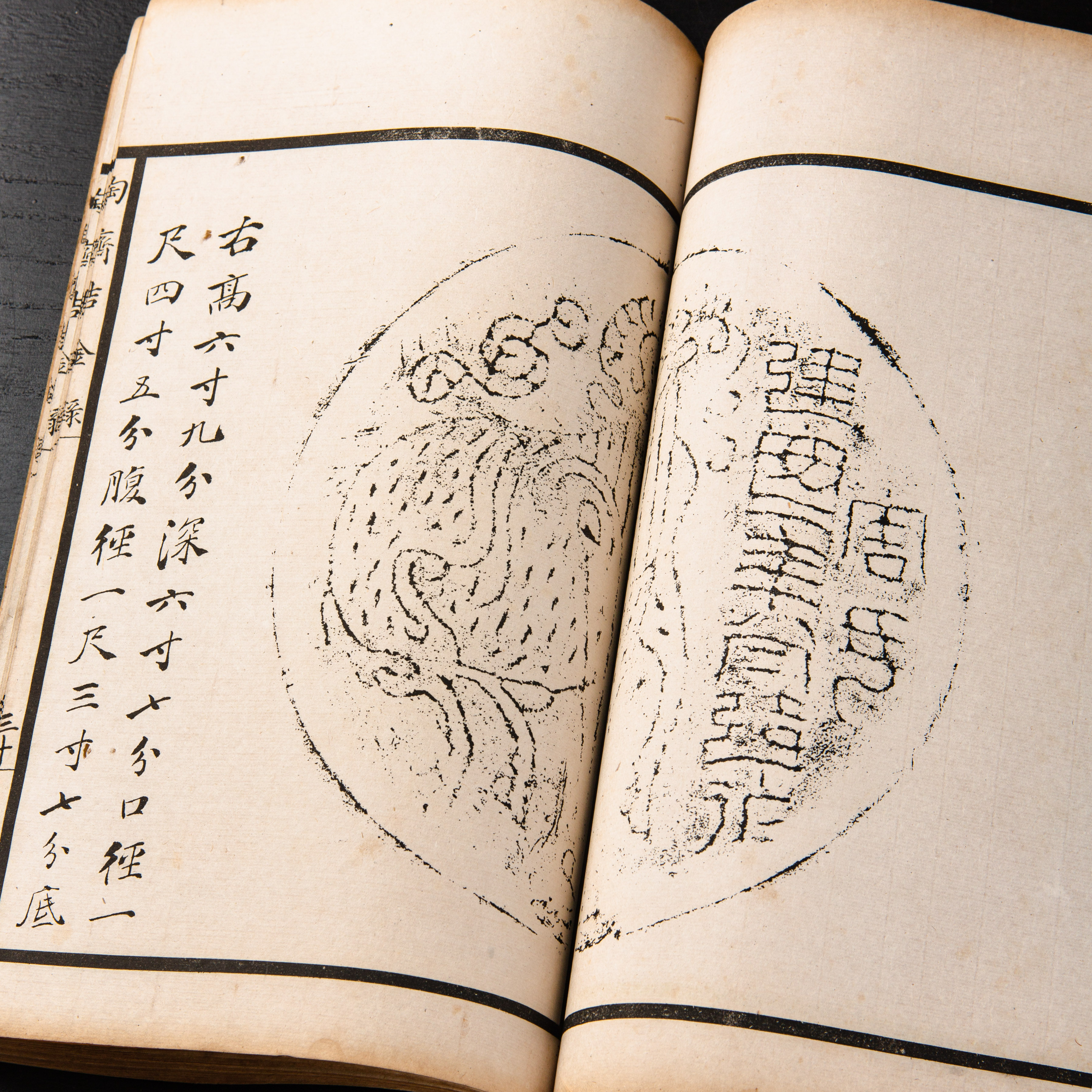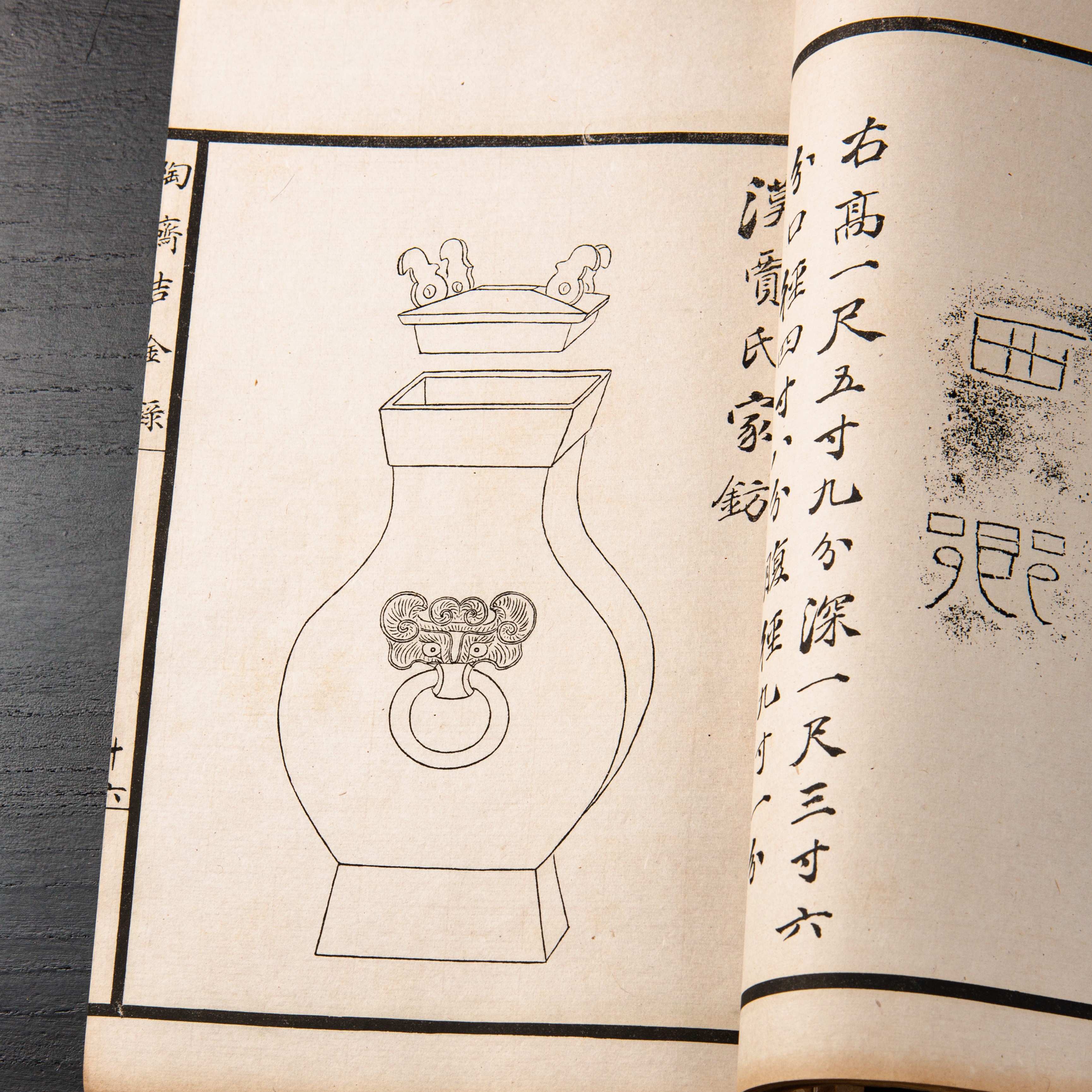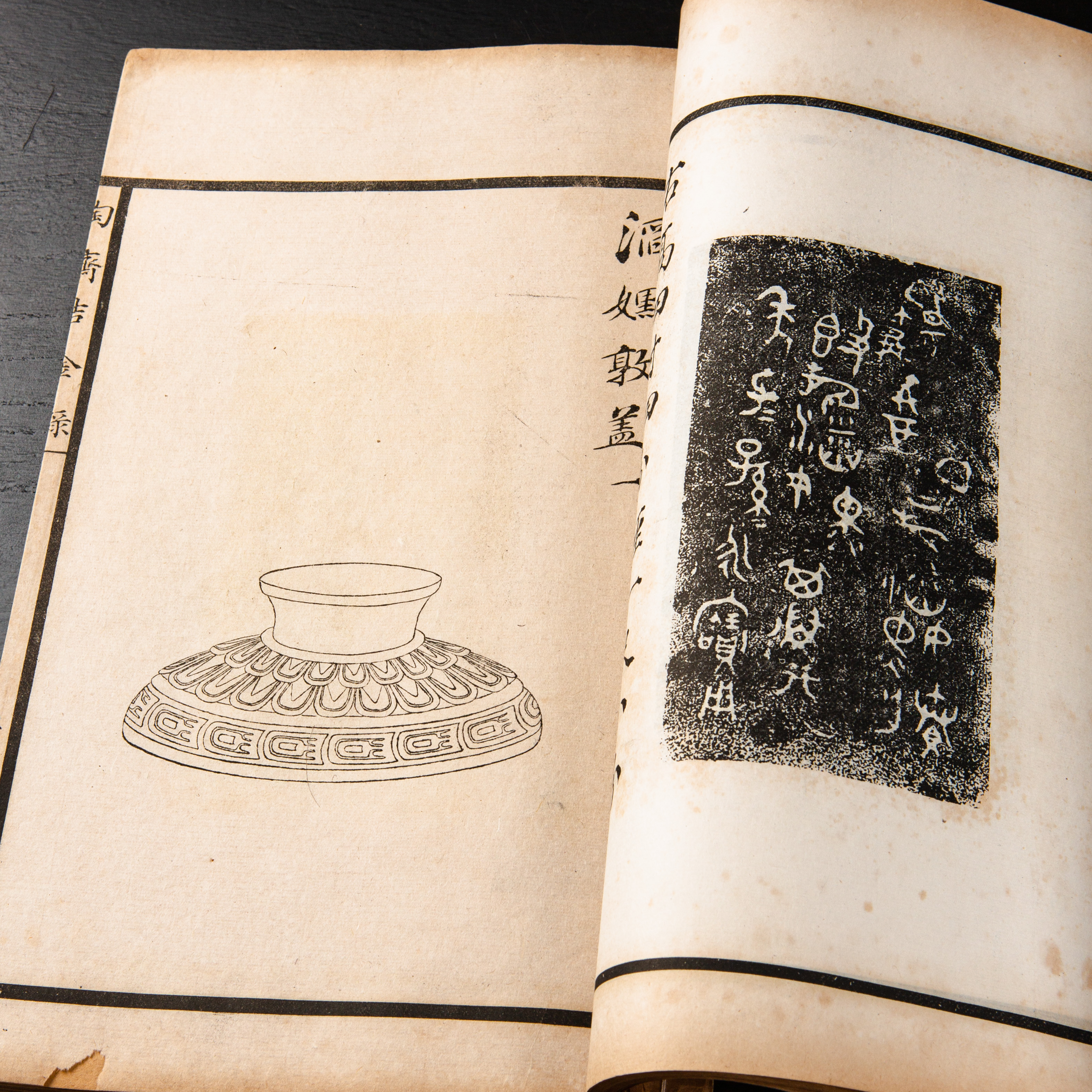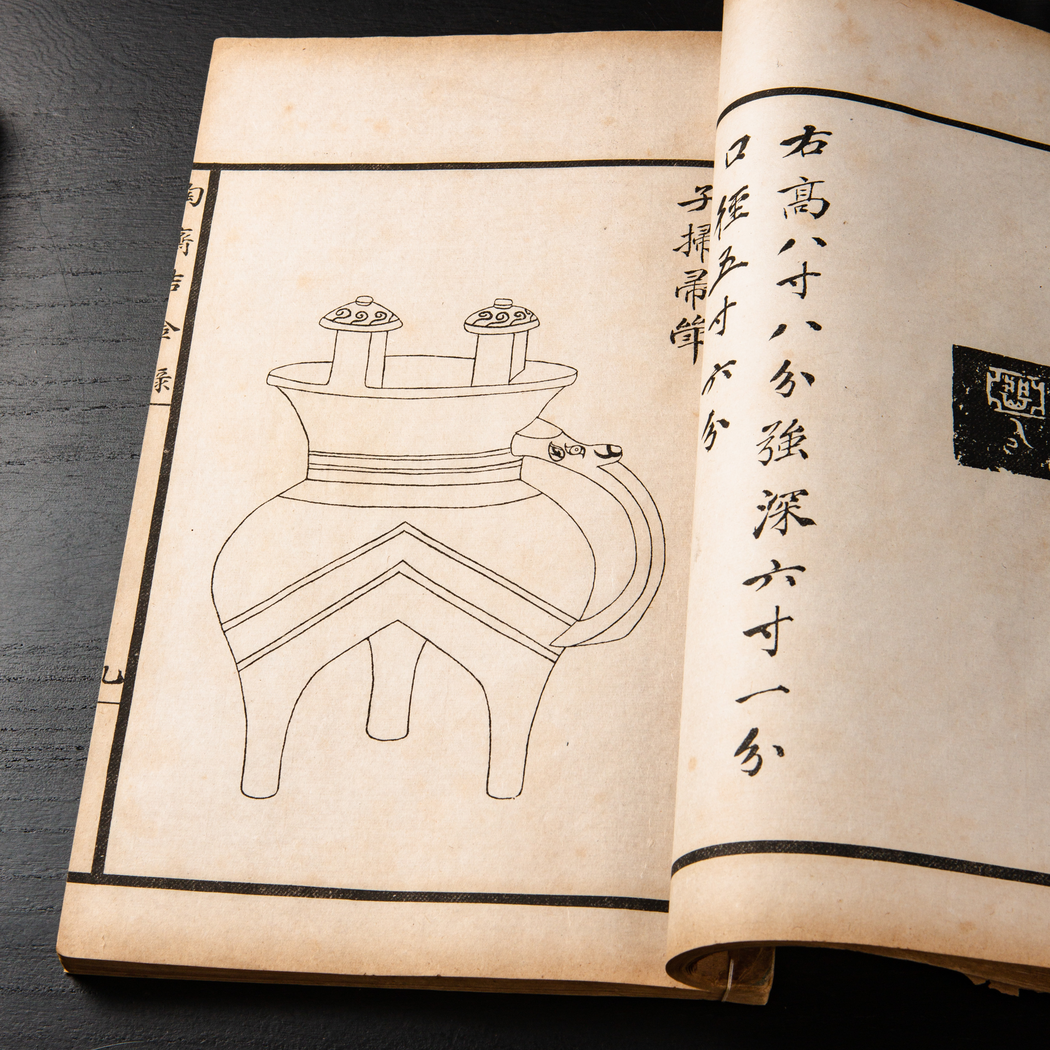 《陶斋吉金录》,光绪三十四年由端方编著,该书一函八册,收录了自三代、秦汉以下的彝器及六朝以来的造像,共计359件,对每件器物都勾勒形状、摹写文字,并且都标注了尺寸,全方位展示了器物的细节,该书为研究古代礼器制度、青铜器等提供了重要资料。书中的绘图精美绝伦,是中国古代藏品绘图的巅峰之作,对研究古代绘画艺术和金石雕刻艺术具有重要的参考价值。本书所著录的器物铭文,为金石学研究和书法研究提供了丰富的资料。该书全套品相保存完好,十分难得!