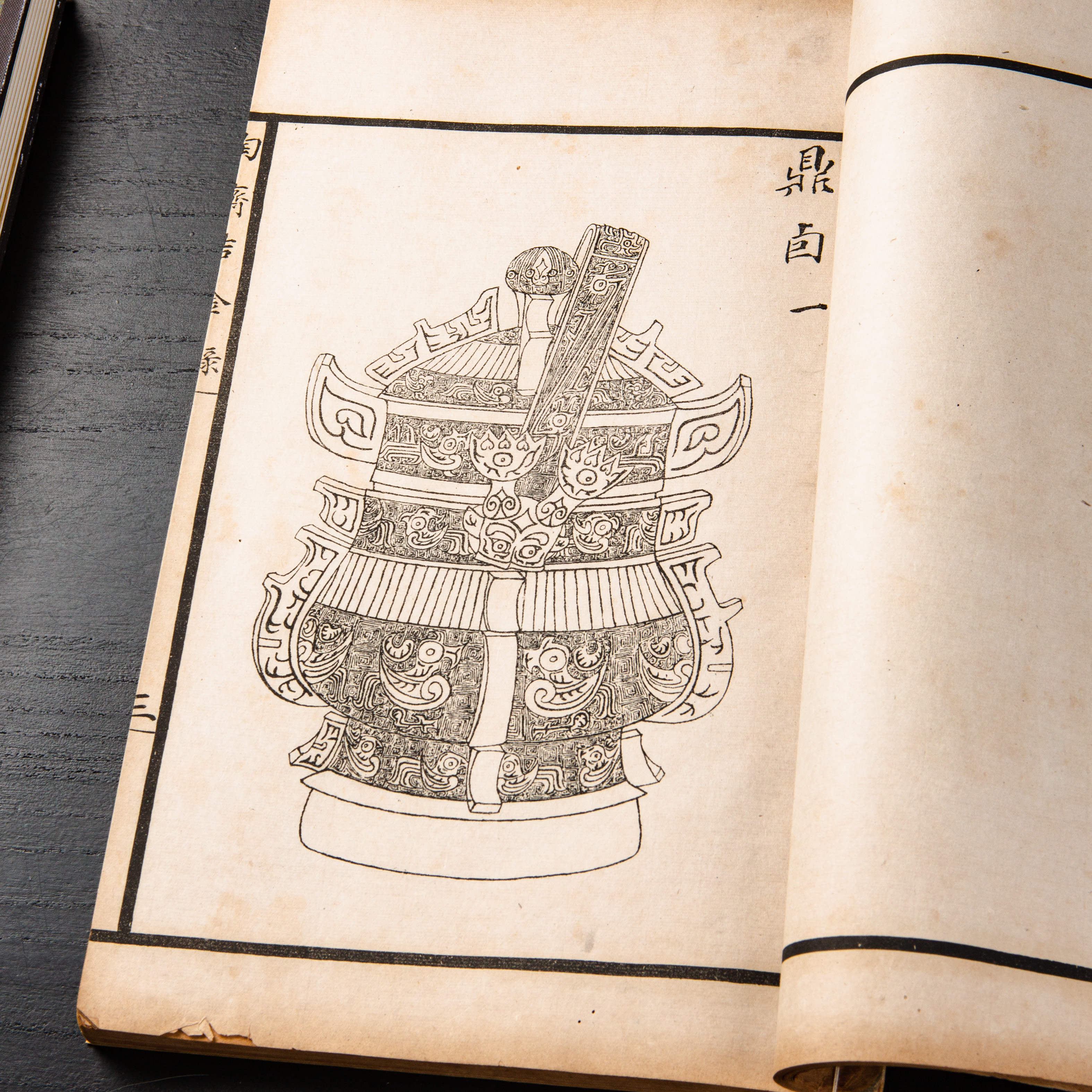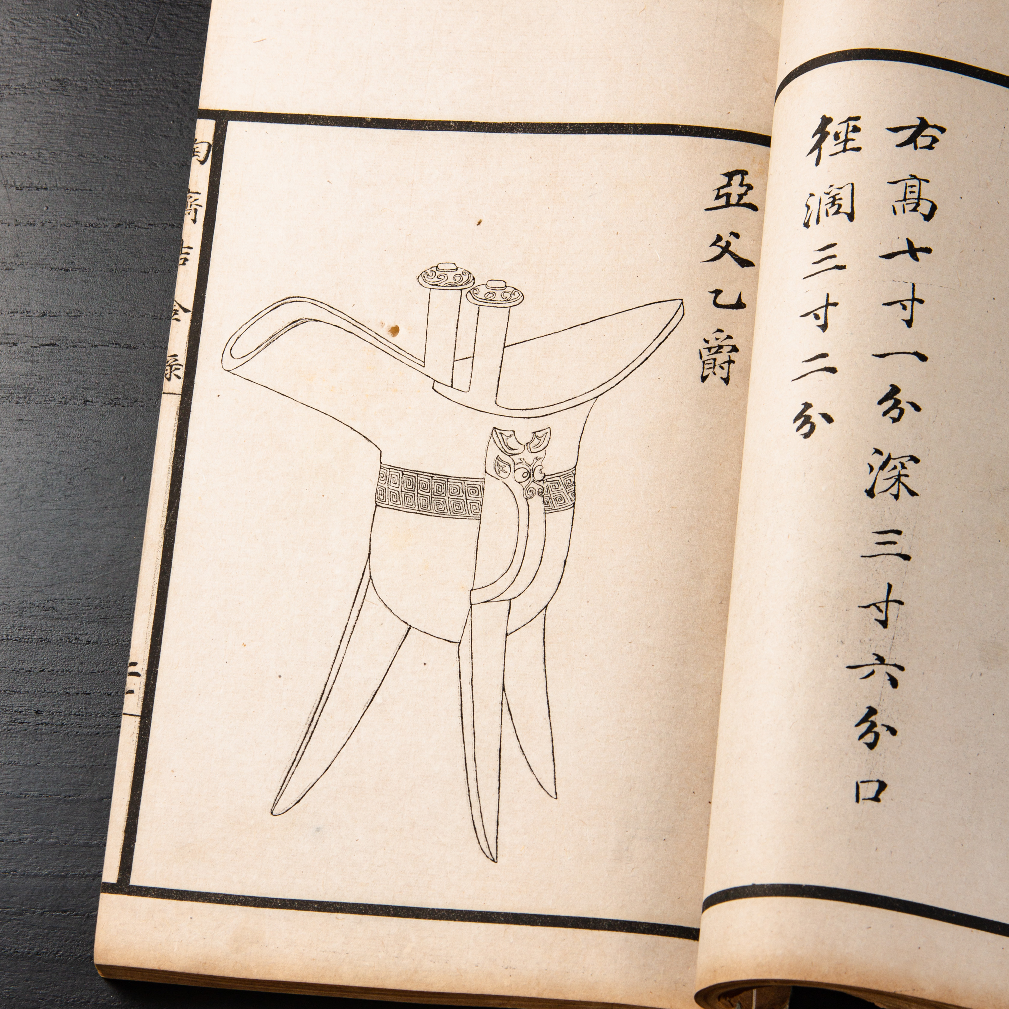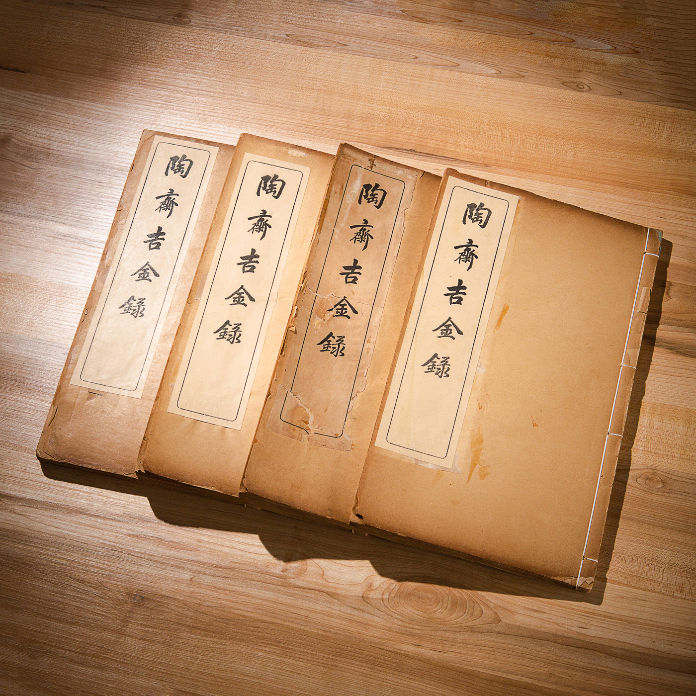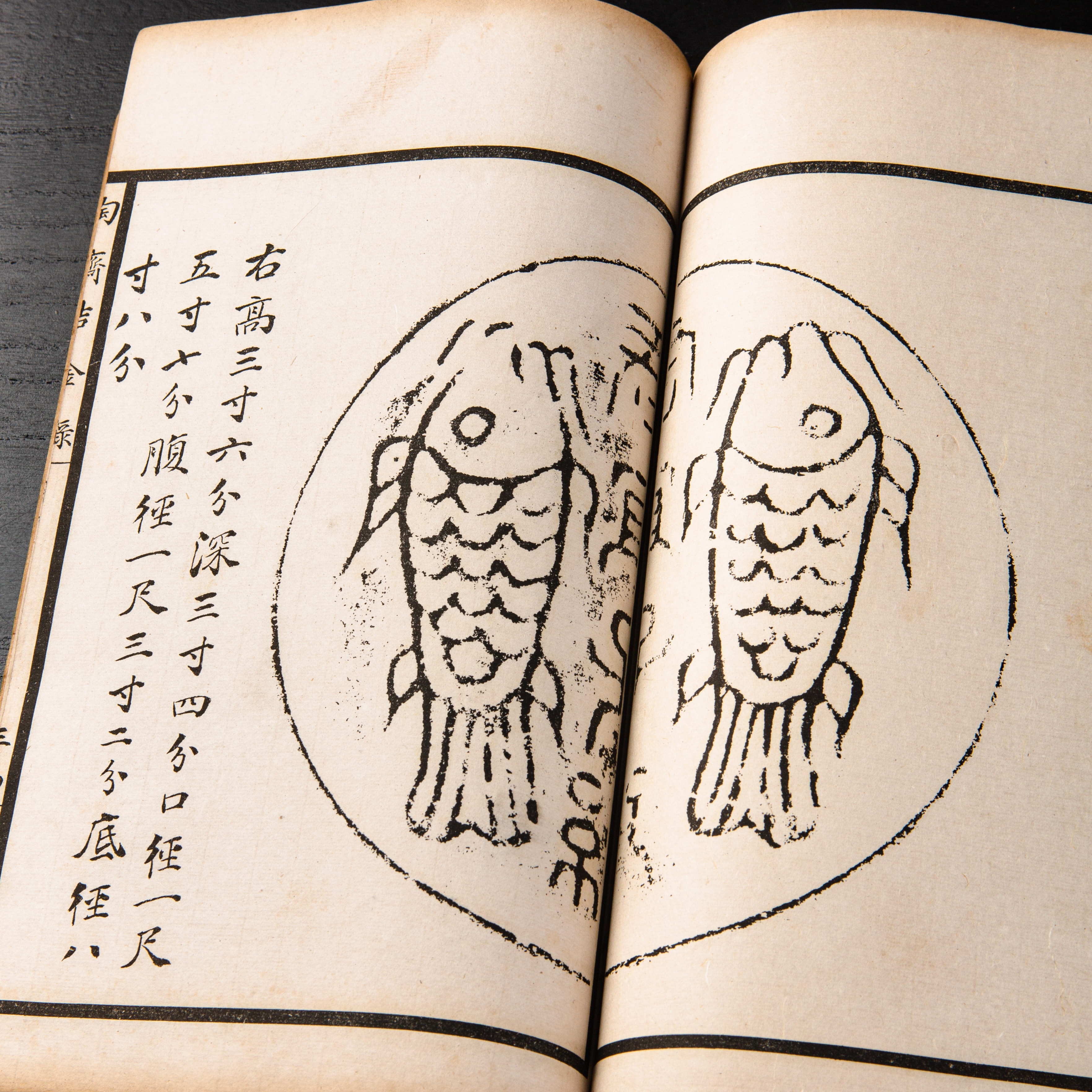 《陶斋吉金录》,光绪三十四年由端方编著,该书一函八册,收录了自三代、秦汉以下的彝器及六朝以来的造像,共计359件,对每件器物都勾勒形状、摹写文字,并且都标注了尺寸,全方位展示了器物的细节,该书为研究古代礼器制度、青铜器等提供了重要资料。书中的绘图精美绝伦,是中国古代藏品绘图的巅峰之作,对研究古代绘画艺术和金石雕刻艺术具有重要的参考价值。本书所著录的器物铭文,为金石学研究和书法研究提供了丰富的资料。该书全套品相保存完好,十分难得!