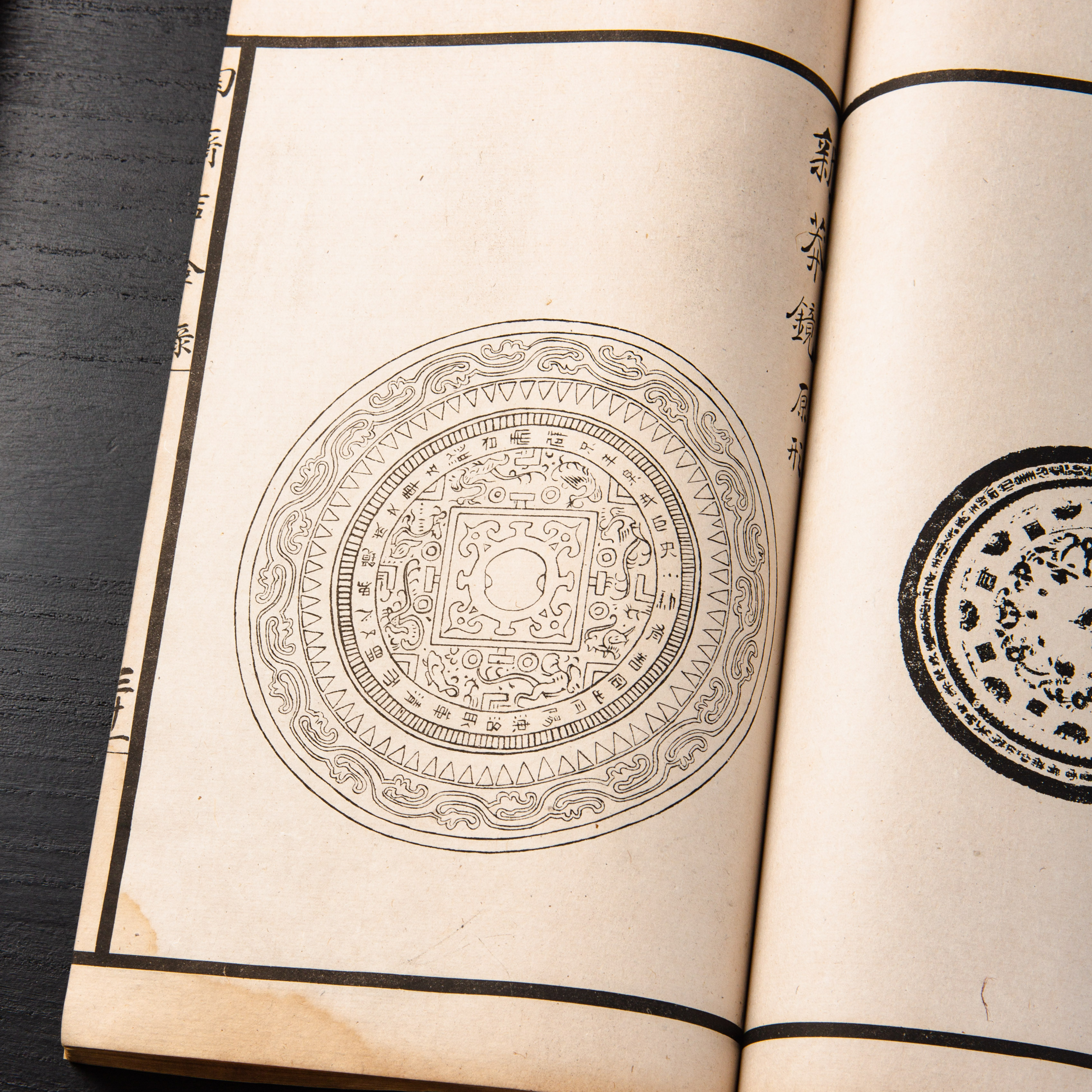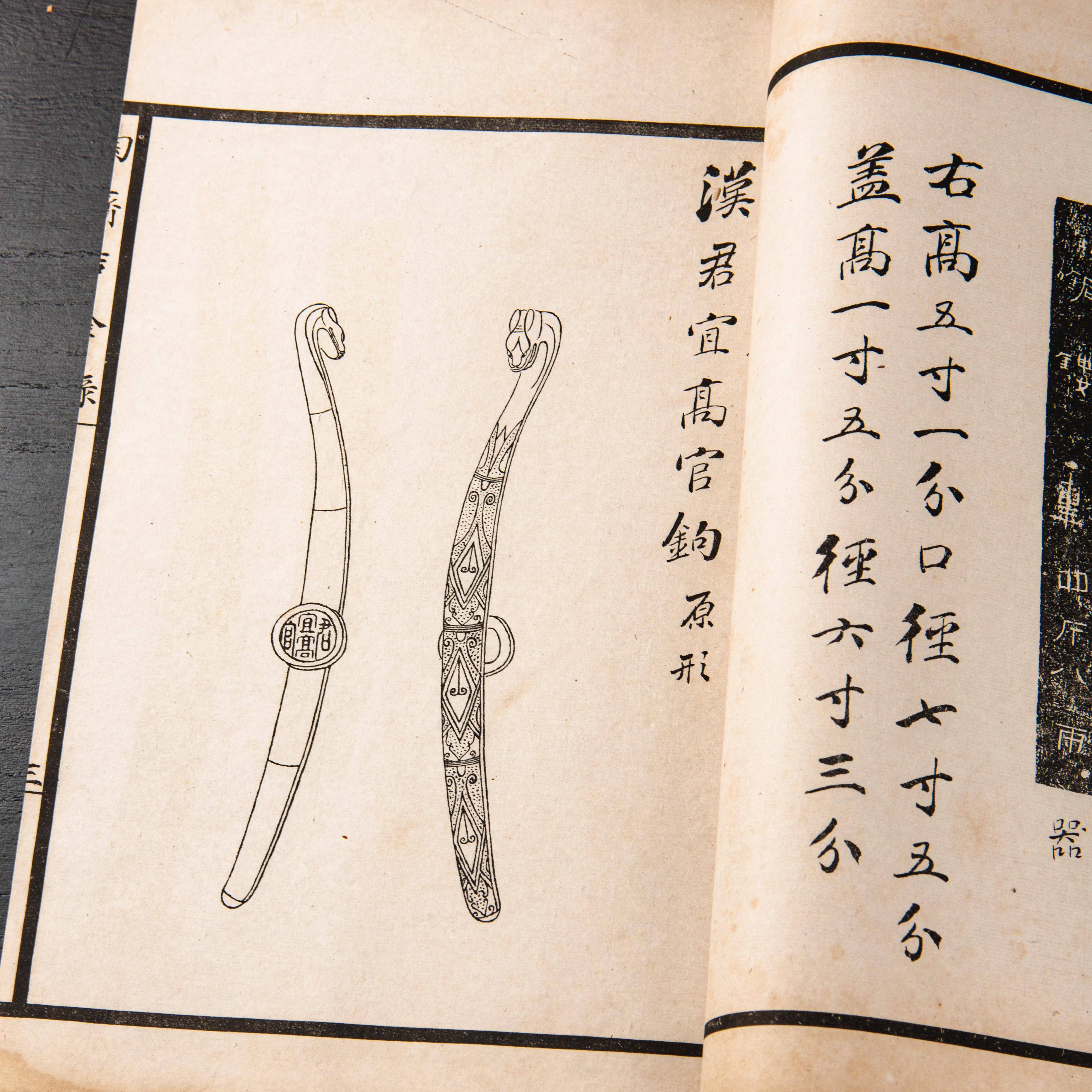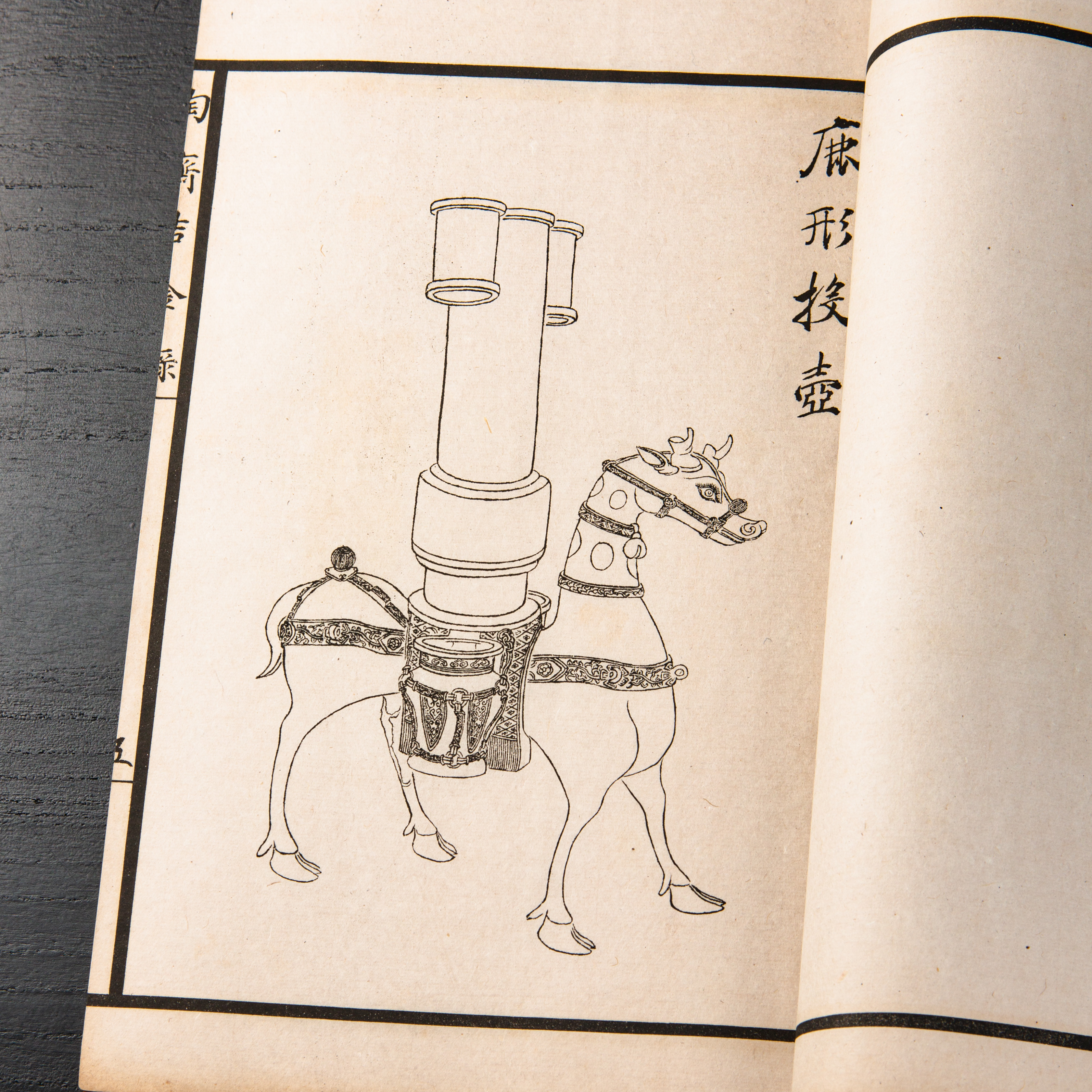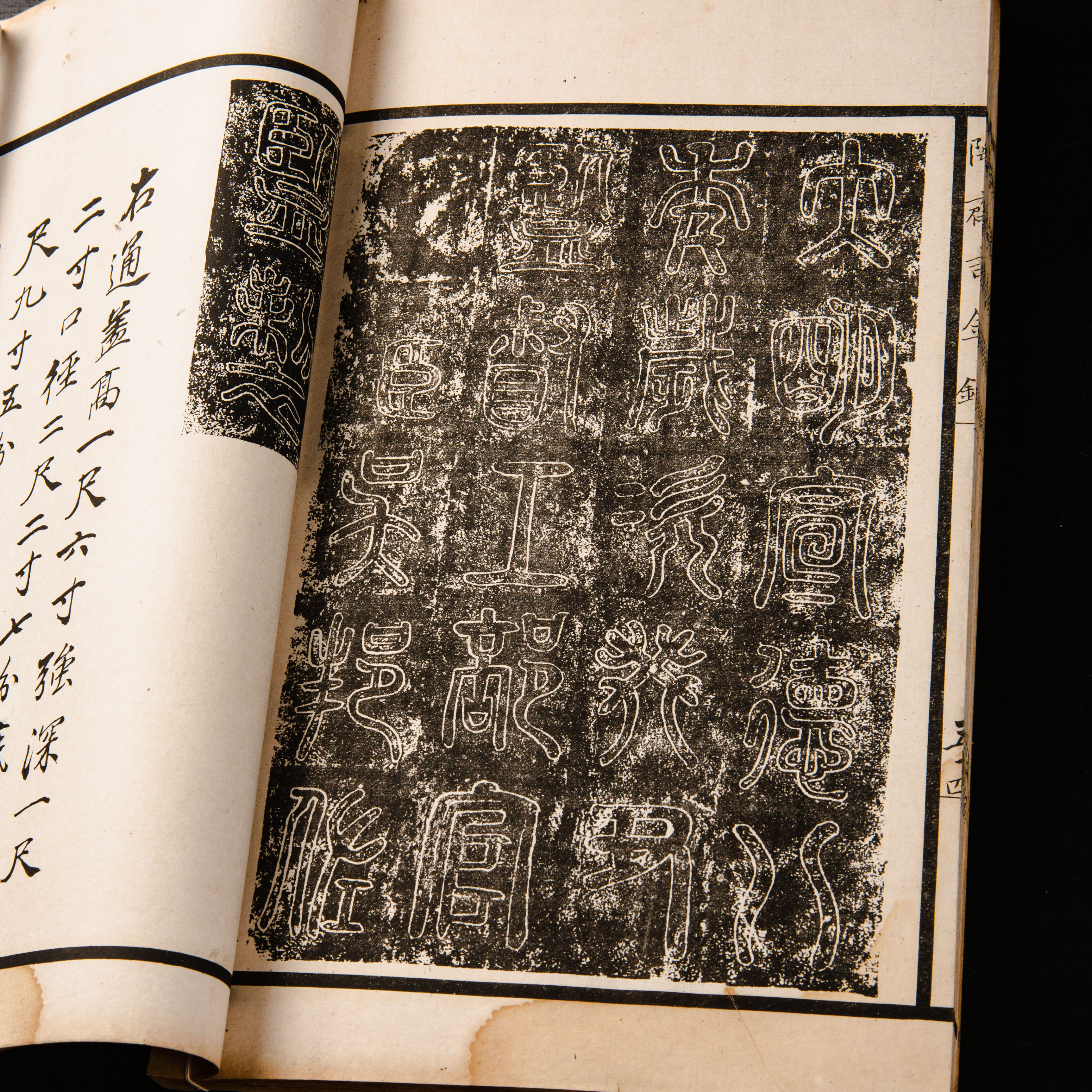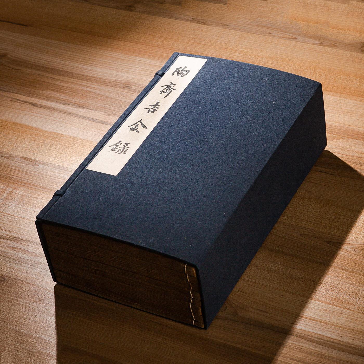 《陶斋吉金录》,光绪三十四年由端方编著,该书一函八册,收录了自三代、秦汉以下的彝器及六朝以来的造像,共计359件,对每件器物都勾勒形状、摹写文字,并且都标注了尺寸,全方位展示了器物的细节,该书为研究古代礼器制度、青铜器等提供了重要资料。书中的绘图精美绝伦,是中国古代藏品绘图的巅峰之作,对研究古代绘画艺术和金石雕刻艺术具有重要的参考价值。本书所著录的器物铭文,为金石学研究和书法研究提供了丰富的资料。该书全套品相保存完好,十分难得!