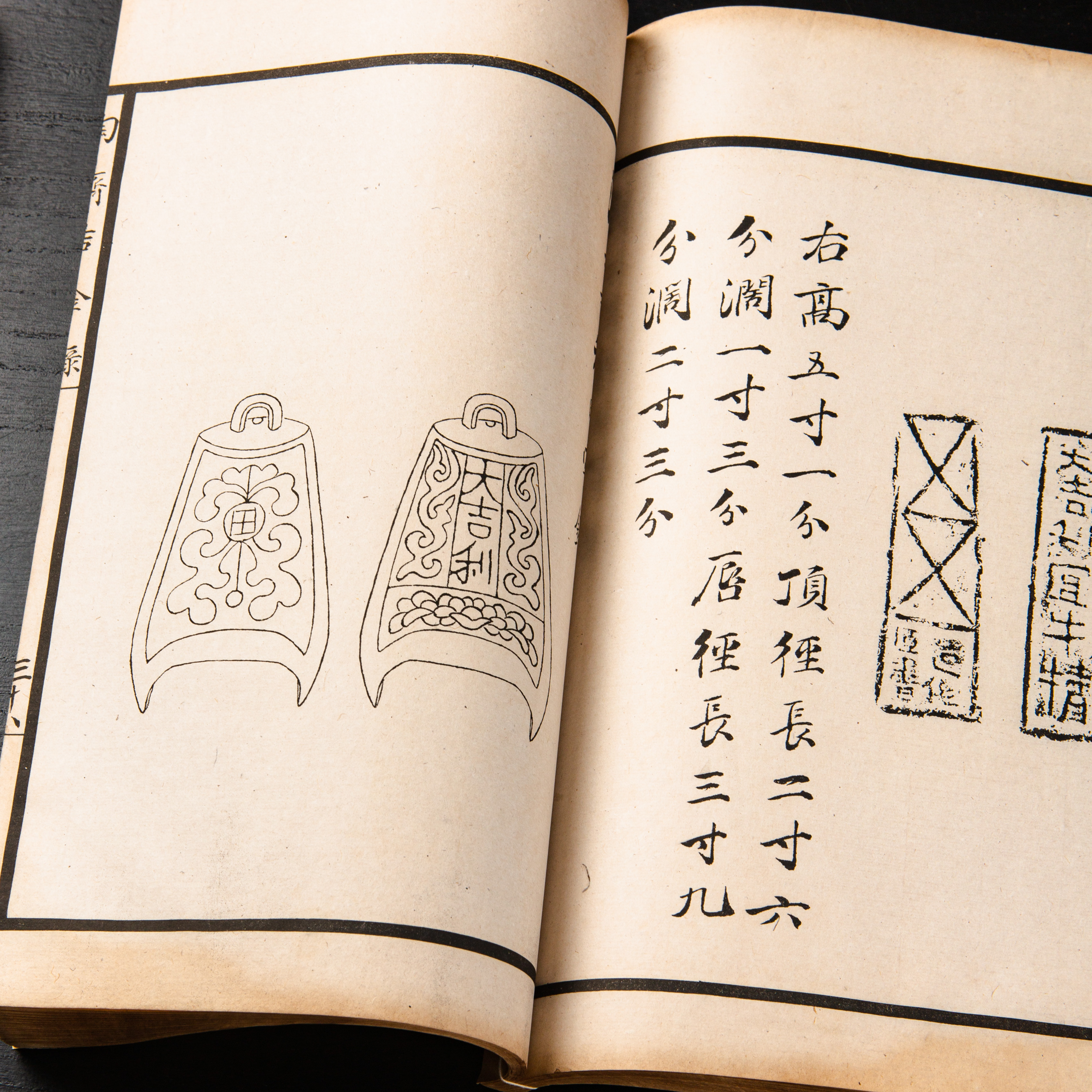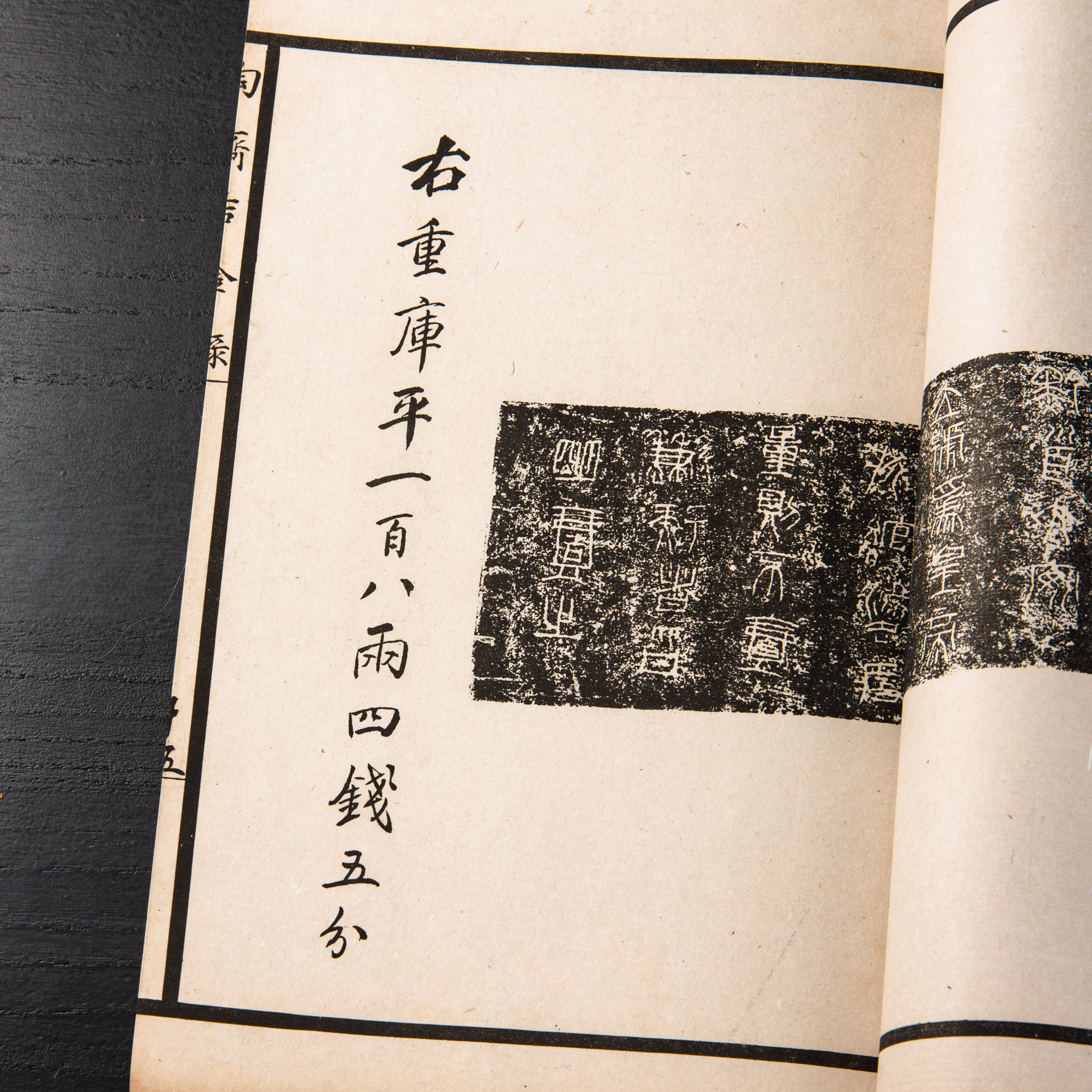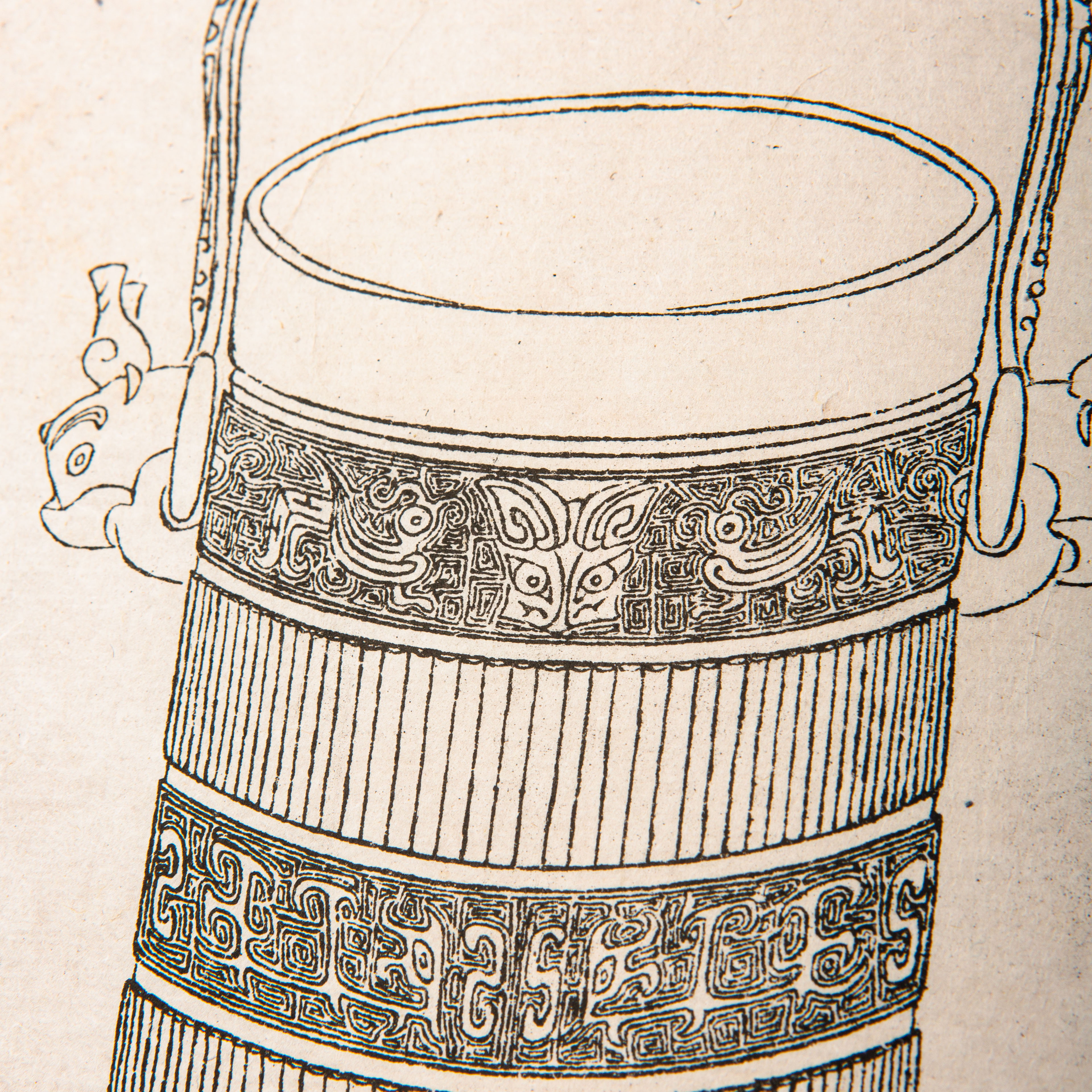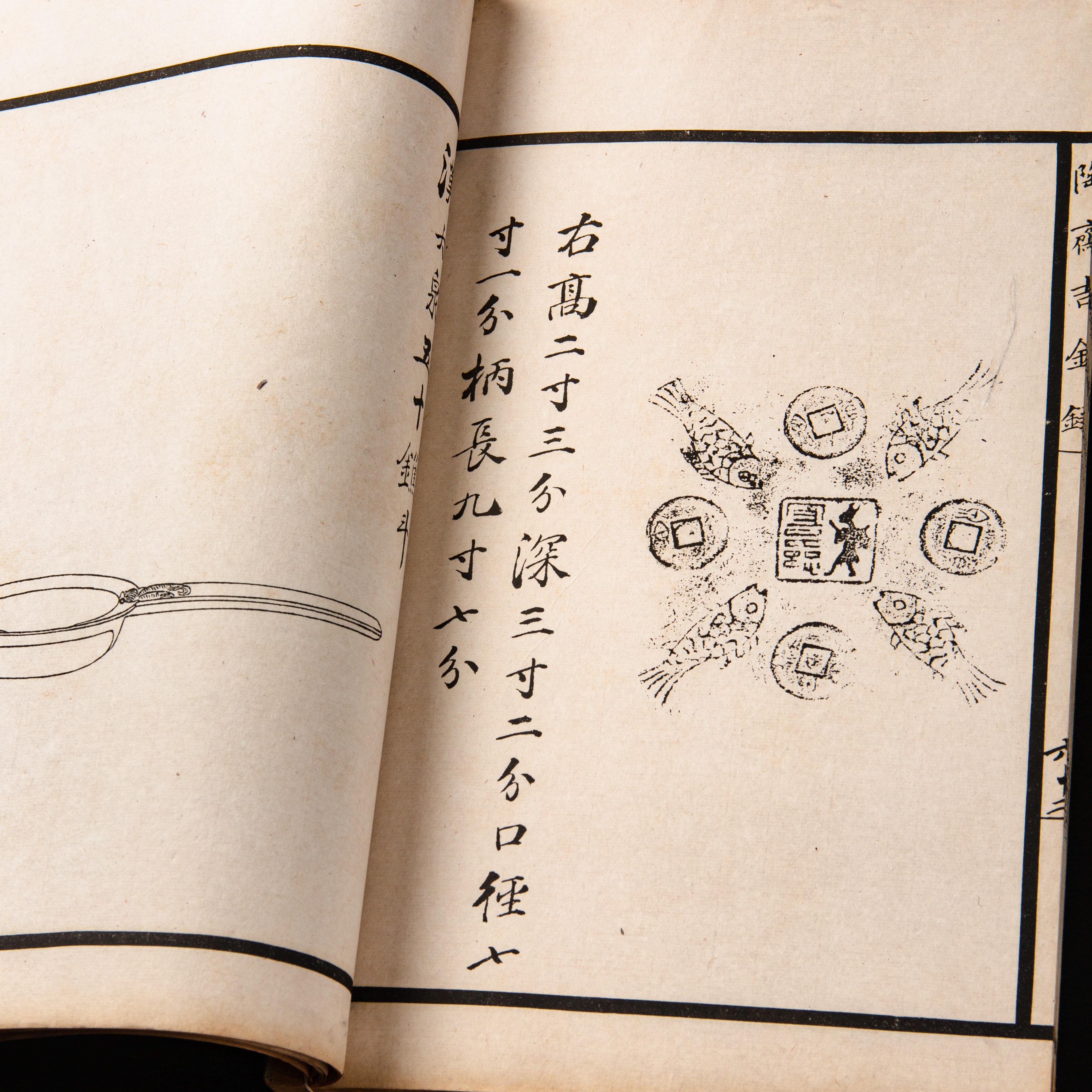《陶斋吉金录》,光绪三十四年由端方编著,该书一函八册,收录了自三代、秦汉以下的彝器及六朝以来的造像,共计359件,对每件器物都勾勒形状、摹写文字,并且都标注了尺寸,全方位展示了器物的细节,该书为研究古代礼器制度、青铜器等提供了重要资料。书中的绘图精美绝伦,是中国古代藏品绘图的巅峰之作,对研究古代绘画艺术和金石雕刻艺术具有重要的参考价值。本书所著录的器物铭文,为金石学研究和书法研究提供了丰富的资料。该书全套品相保存完好,十分难得!