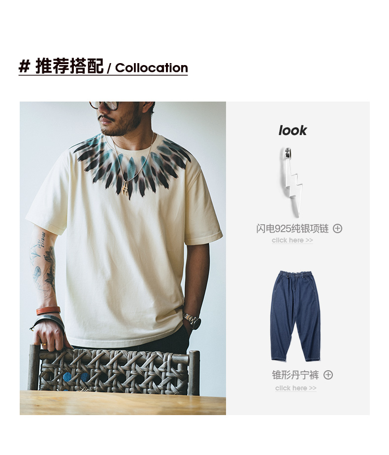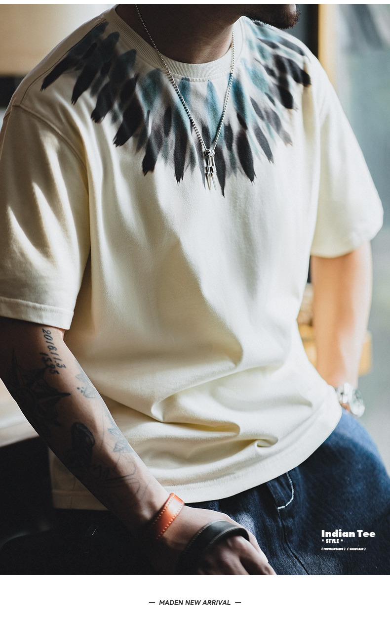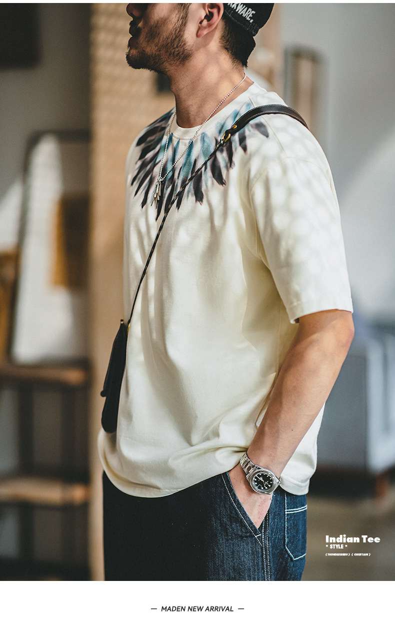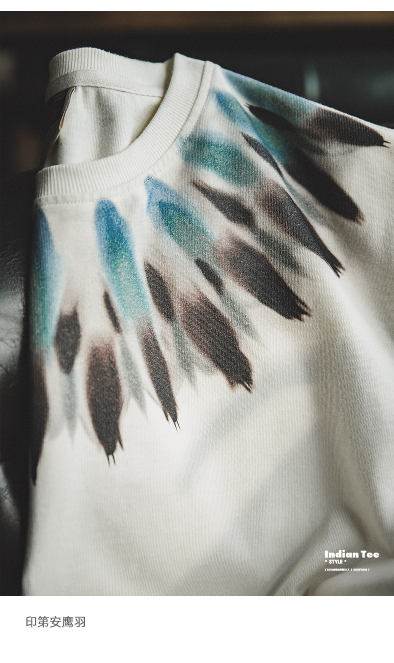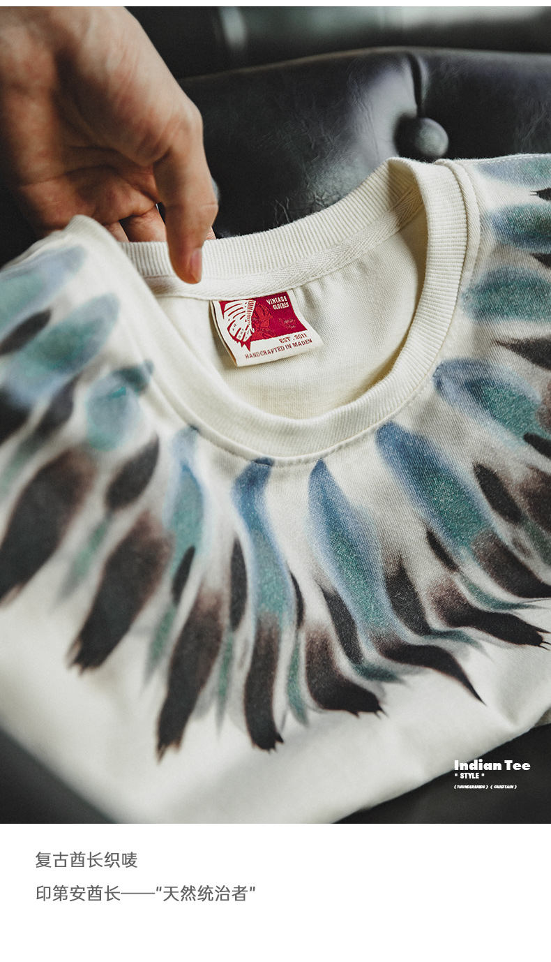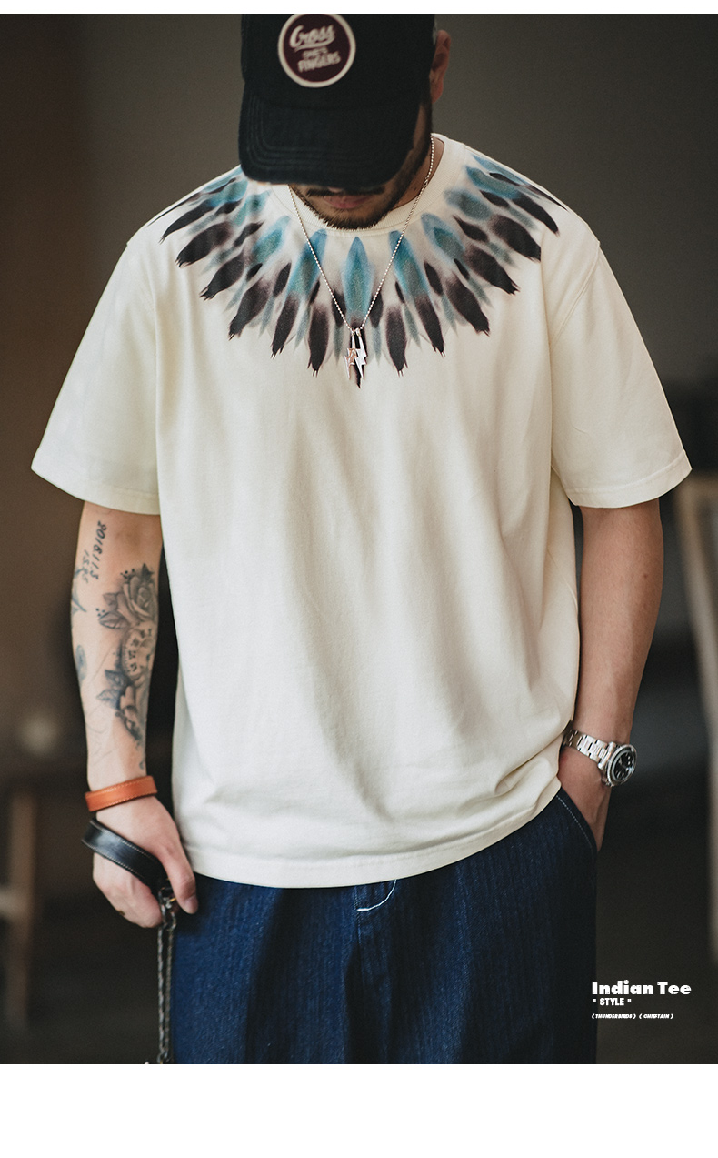 工装优选 美式复古重磅印第安羽毛印花短袖做旧宽松民族风T恤男夏