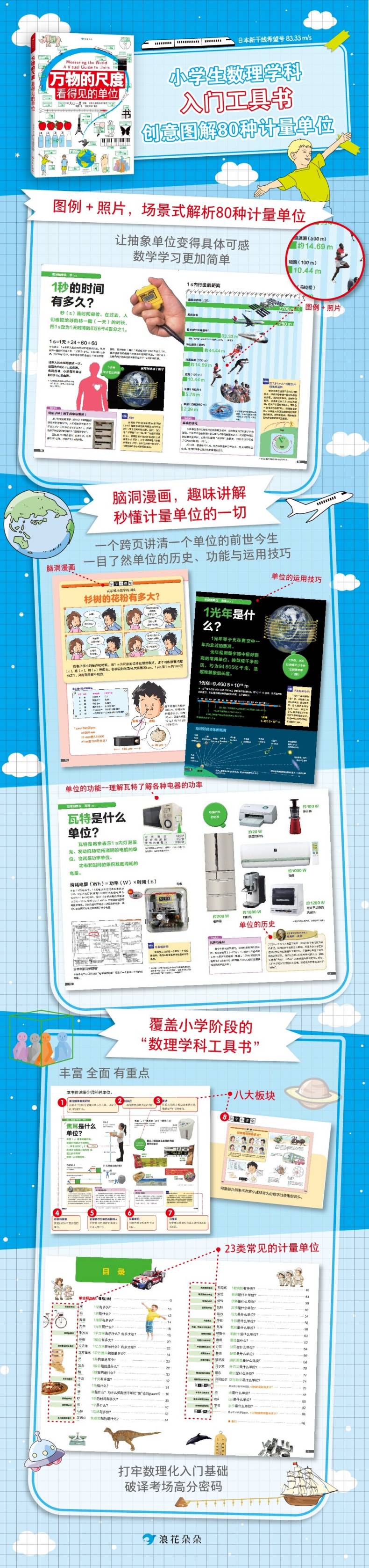 在学习单位的时候,*好已经能做简单的乘除法,但我觉得单位基本上是和日常生活密切相关的东西,可以超出对应年级的理解范围,所以我觉得这本书适合作为小学生入学的礼物。不过,这本书内容非常多样,从熟悉的_ldquo;米_rdquo;到你也许从没听过的_ldquo;开尔文_rdquo;,而且讲得比较透彻_hellip;_hellip;