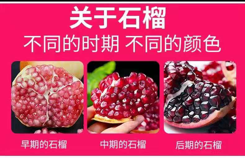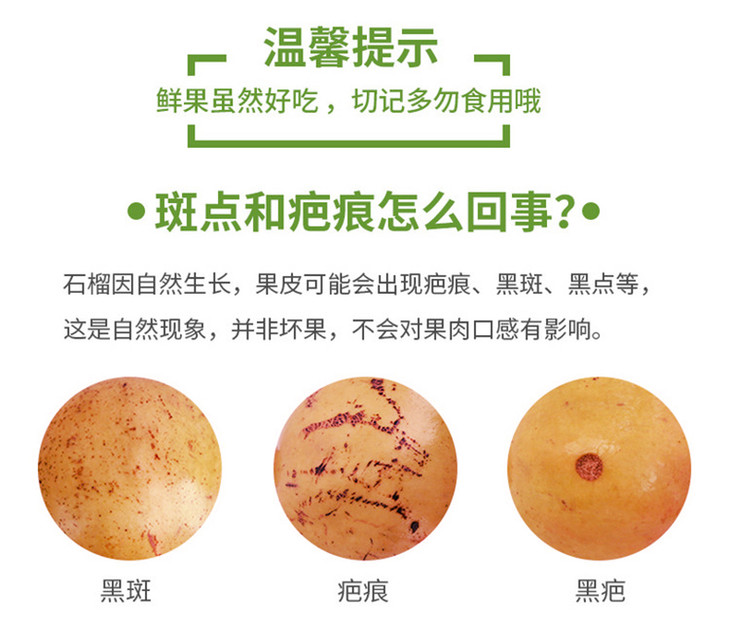 3、石榴生长在高山果园里,经过阳光的照射和雨露的滋润,表皮可能会有疤痕,斑点,大小不一等情况,颜色也会有差异,但是不影响 果肉的口感。