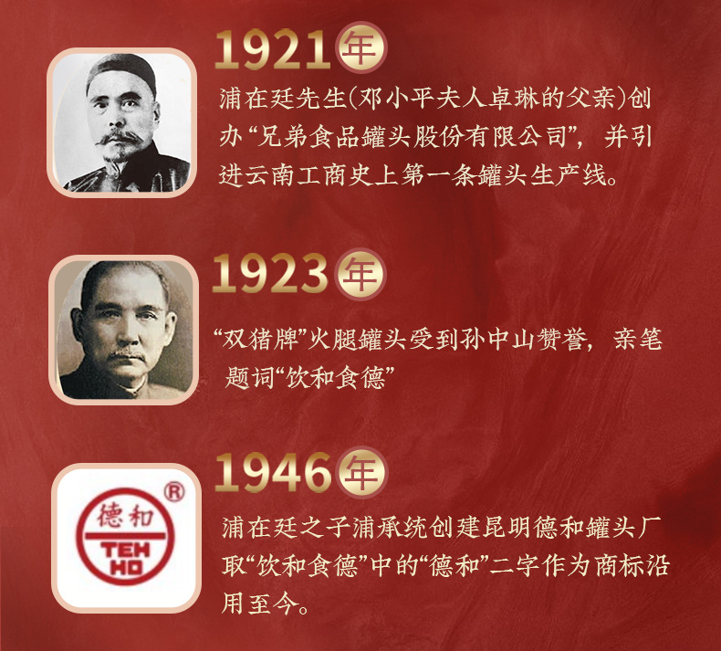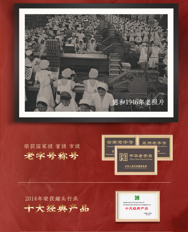 昆明德和罐头厂是中国最早开始生产制造罐头的企业之一,至今已有九十八年的悠久历史,现已形成以罐头食品为主,腌腊制品、糕点月饼等为辅的云南省规模最大和最具影响力综合食品制造企业,奠定了云南罐头行业的基石。