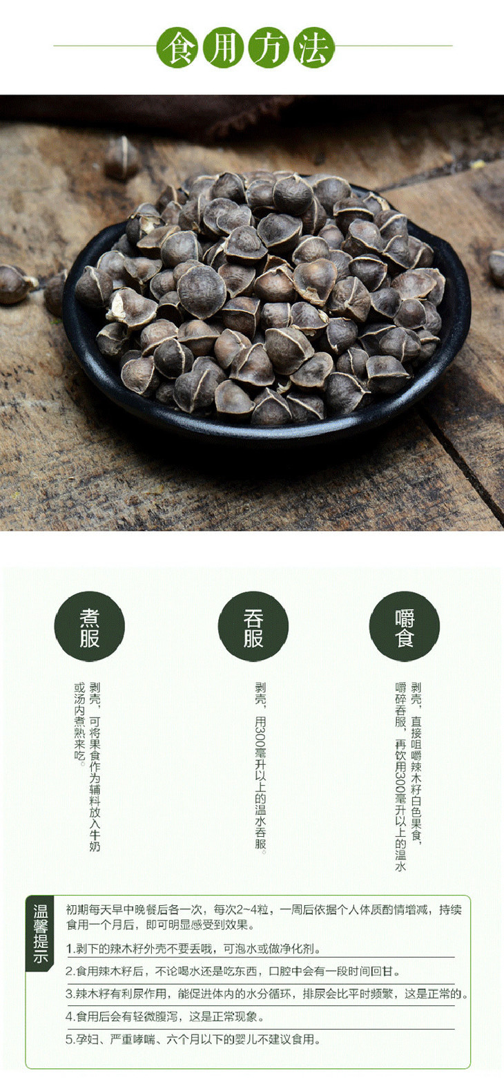 辣木籽要剥壳吃,壳可以泡水,每天吃5-8粒,每次吃完喝300-500毫升的温开水,因为其营养丰富,需要水来分解,否则会口干。