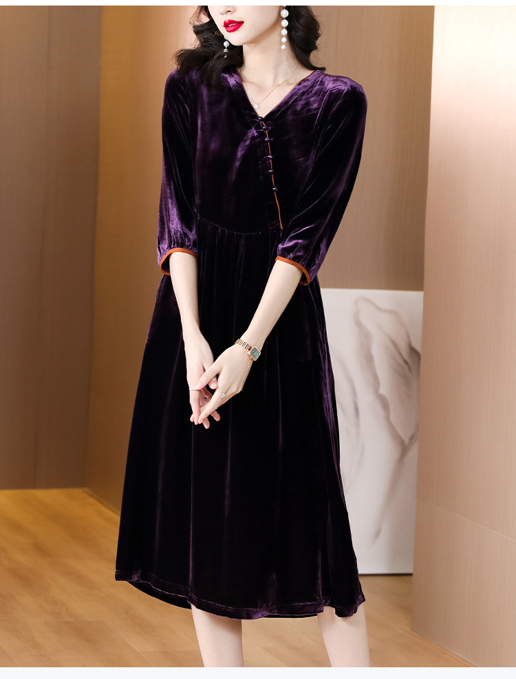 AHM lry4205复古V领金丝绒连衣裙优雅国风中长裙 商品图1