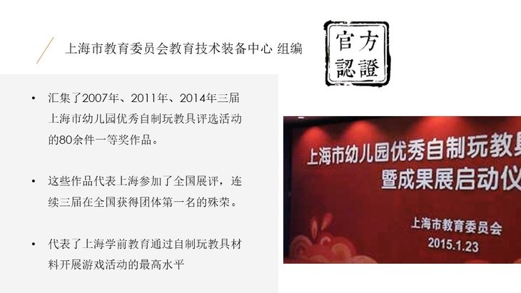 汇集了2007年、2011年、2014年三届上海市幼儿园优秀自制玩教具评选活动的83件一等奖作品。