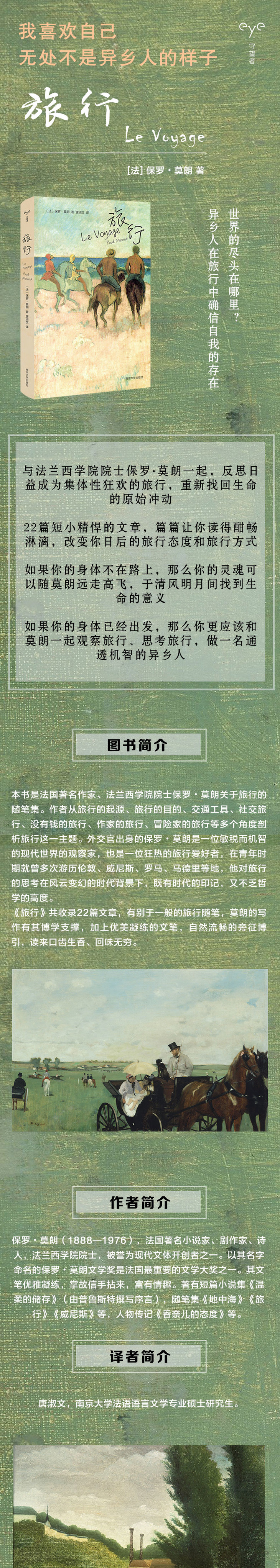 《旅行》共收录22篇文章,有别于一般的旅行随笔,莫朗的写作有其博学支撑,加上优美凝练的文笔,自然流畅的旁征博引,读来口齿生香、回味无穷。