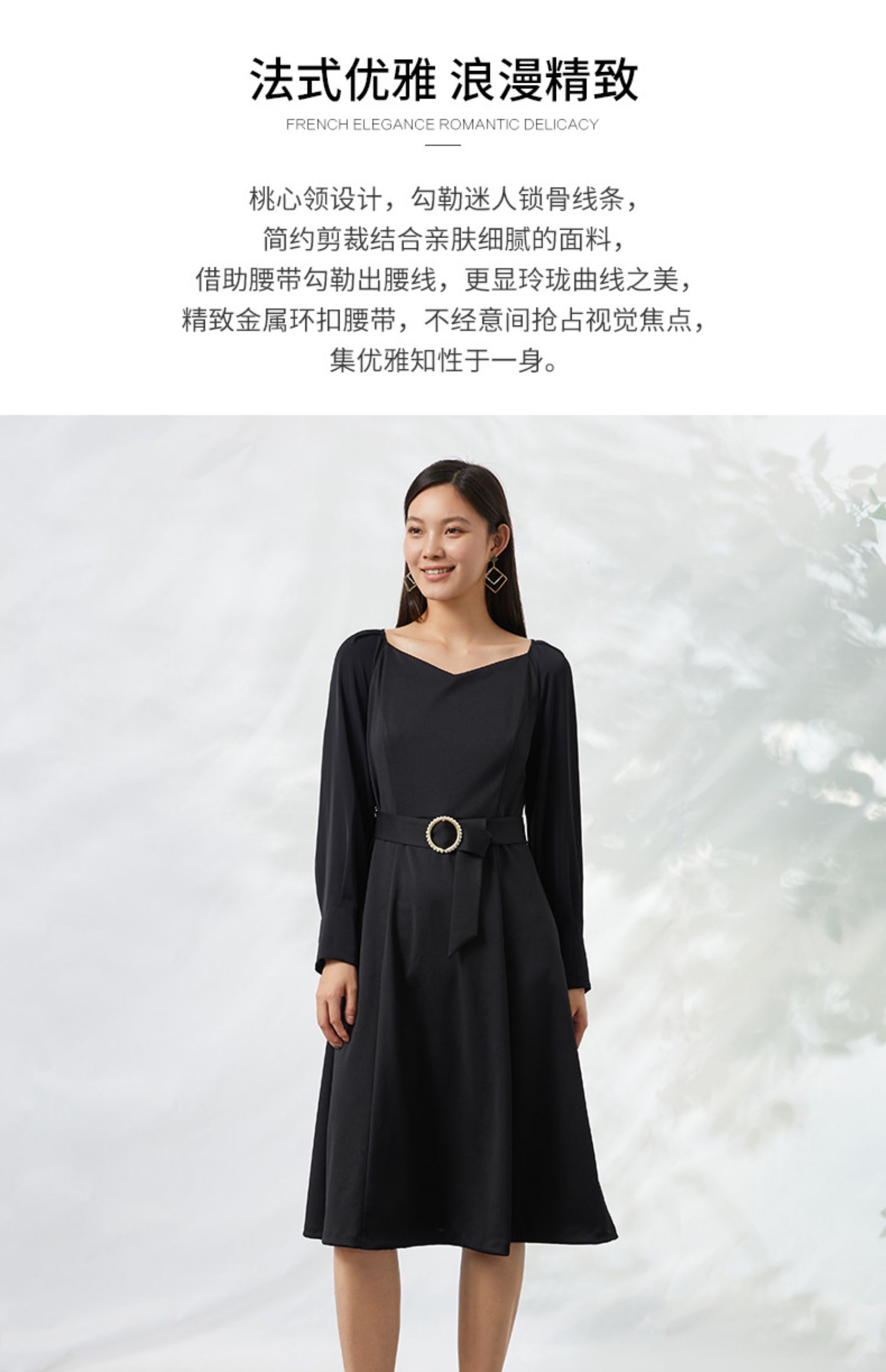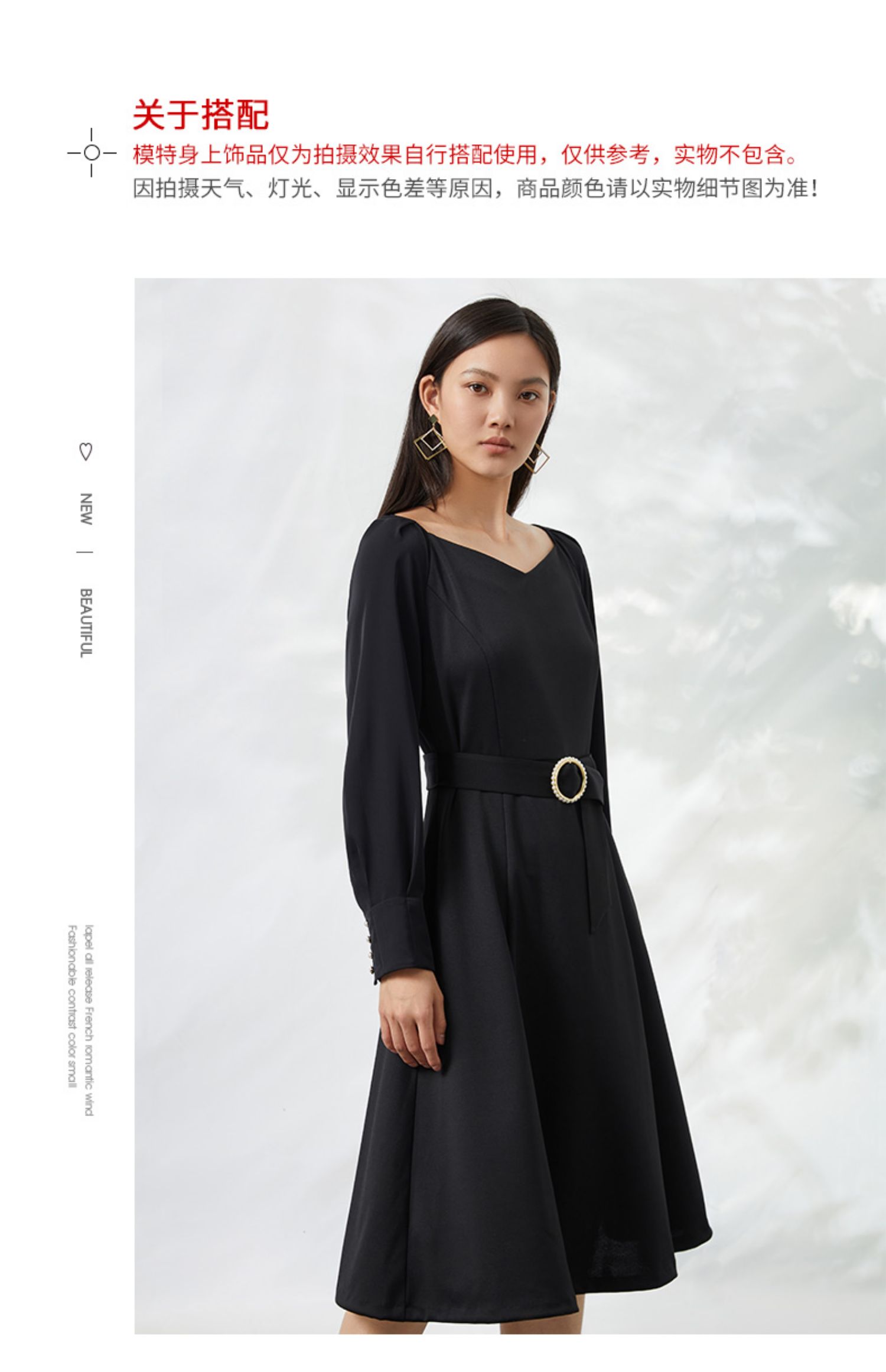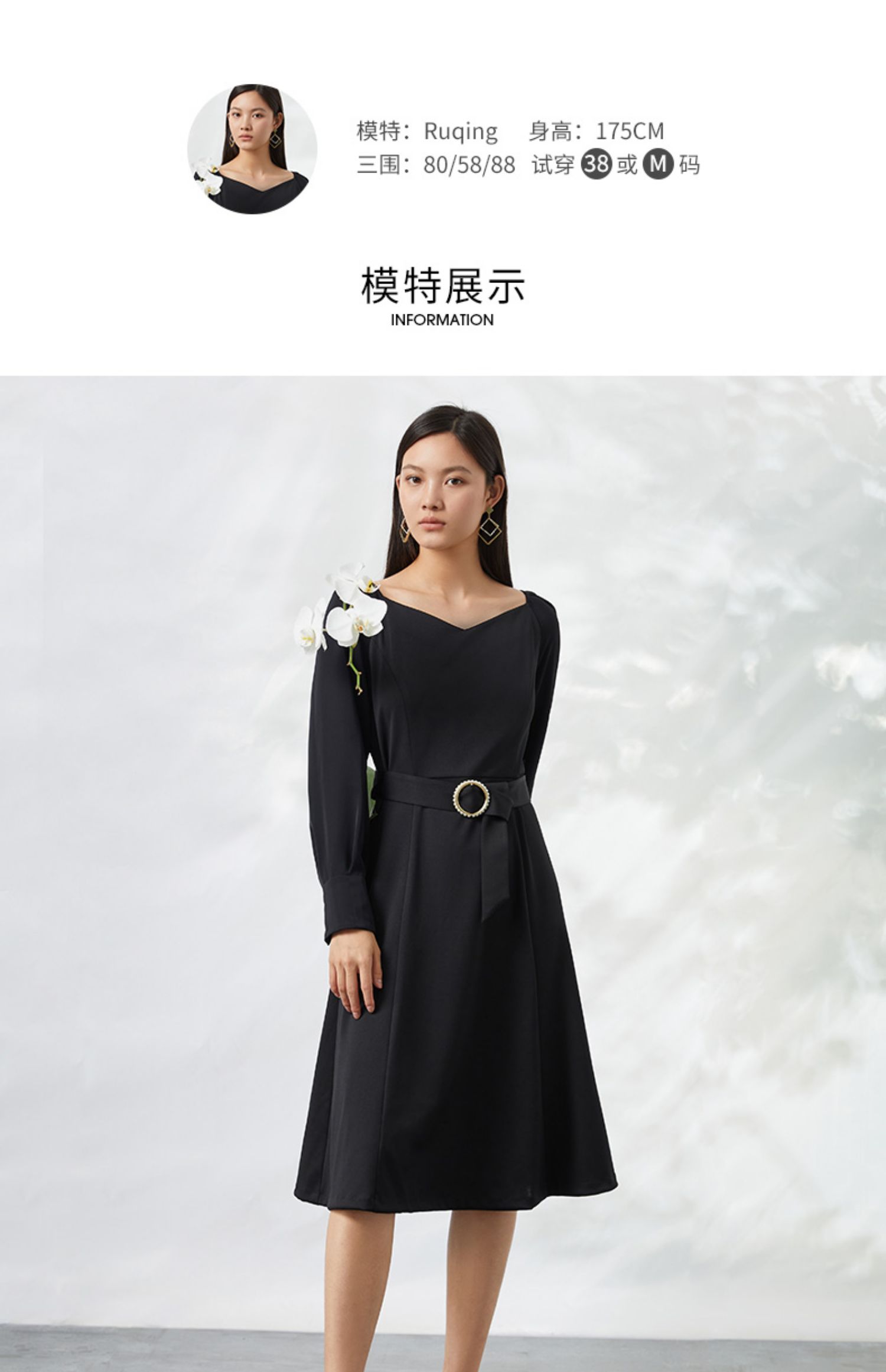 EITIE爱特爱秋季新款长袖通勤显瘦气质一字领高腰黑色连衣裙C2207006
