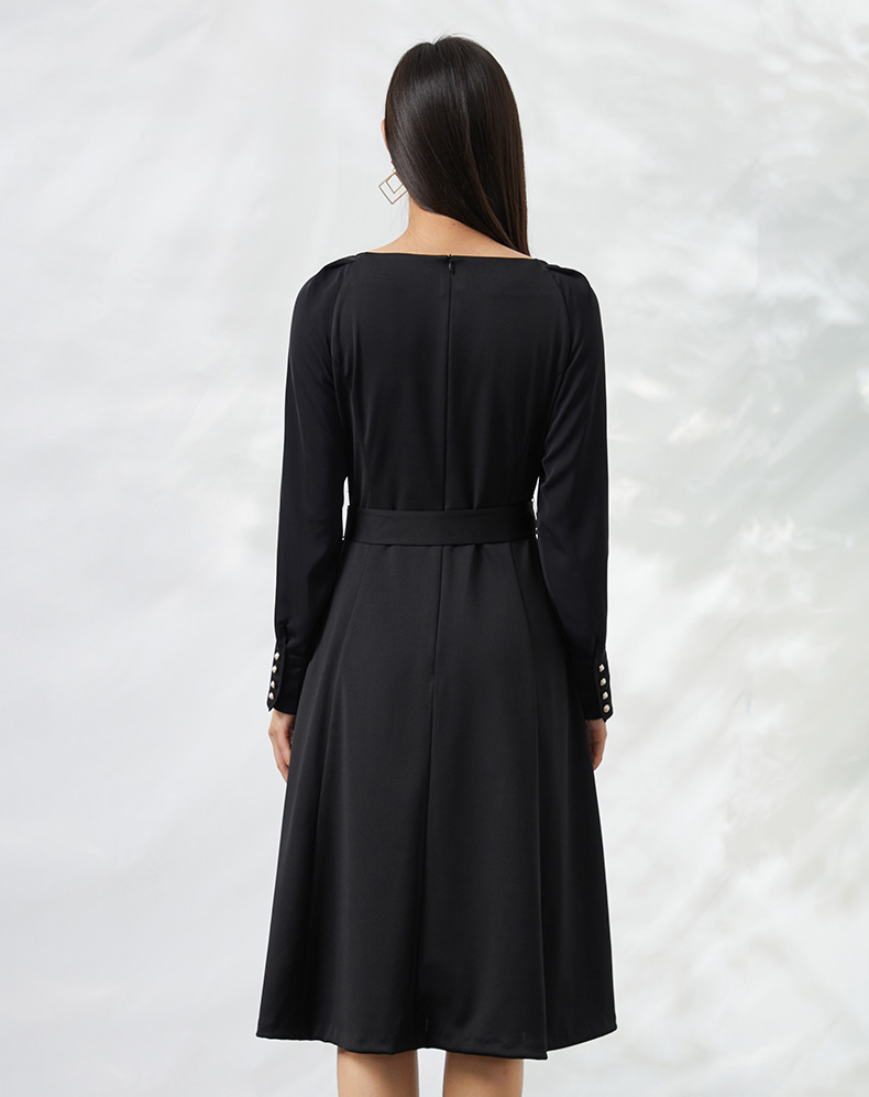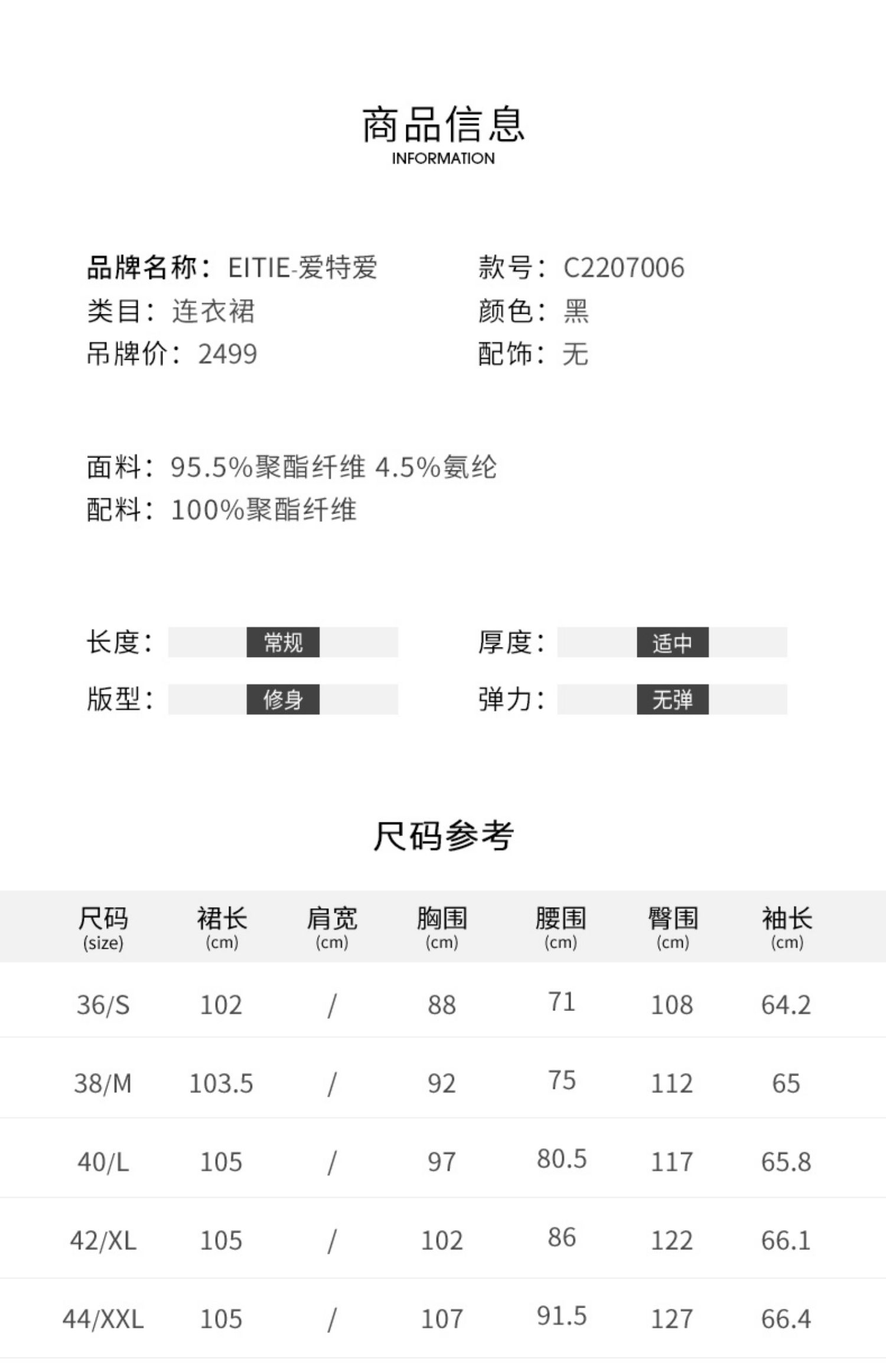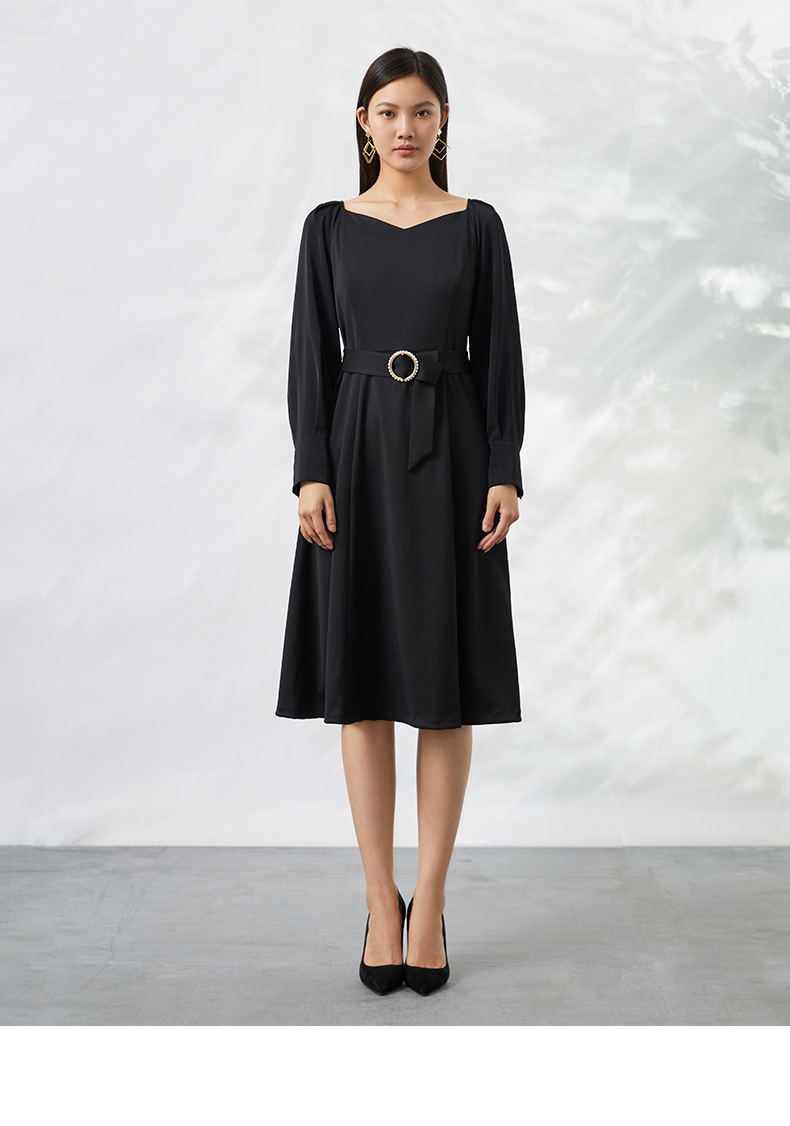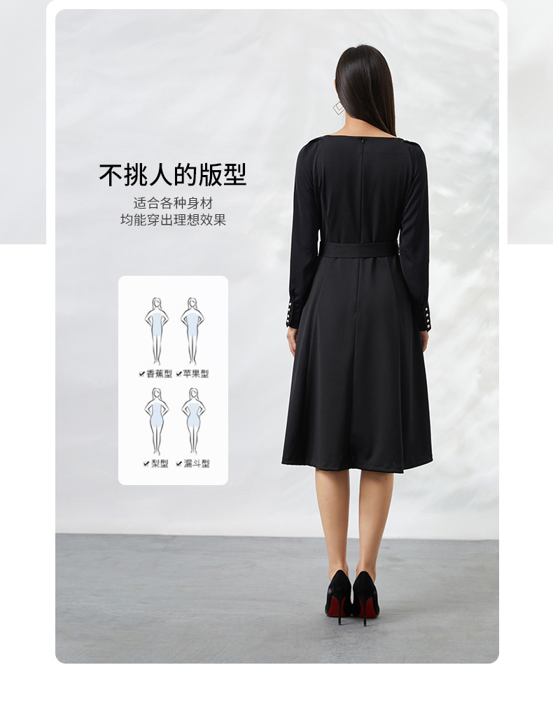 EITIE爱特爱秋季新款长袖通勤显瘦气质一字领高腰黑色连衣裙C2207006