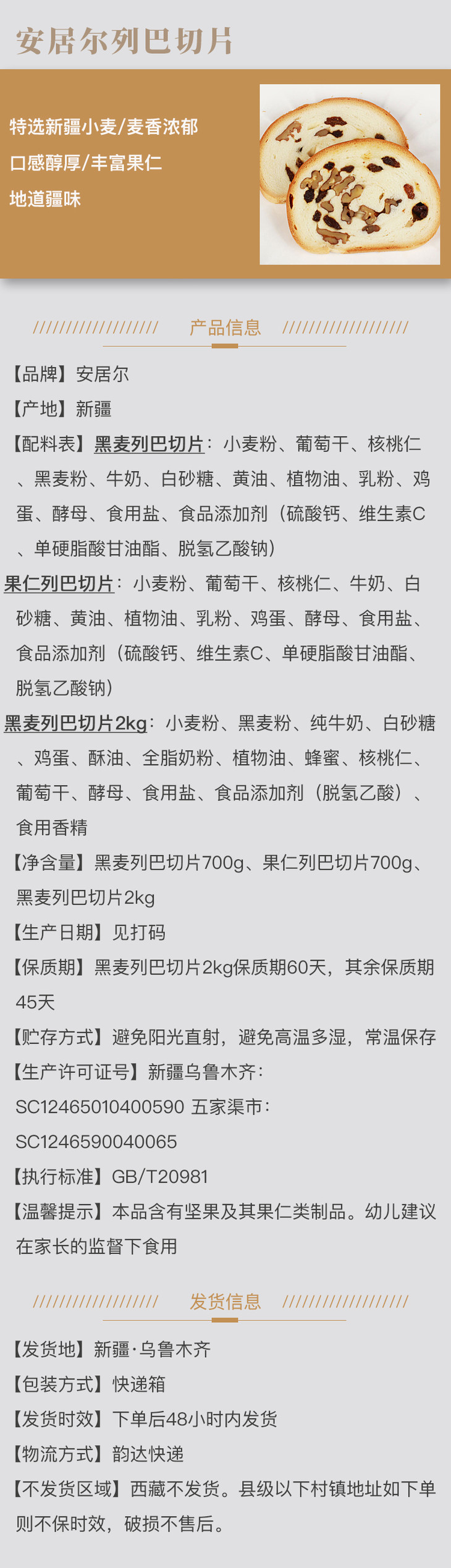 安居尔整根列巴500g、700g&切片列巴700g 营养早餐