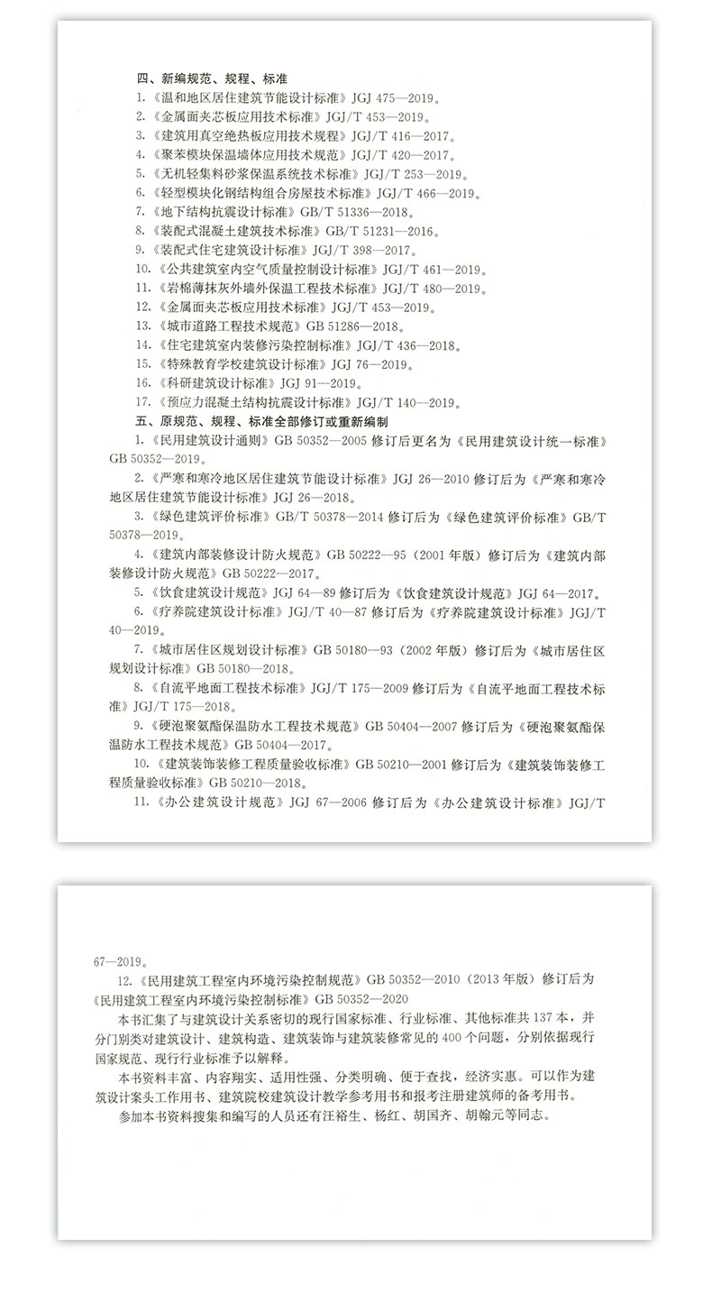 在现行国家标准及行业标准中,《建筑设计防火规范》、《严寒和寒冷地区居住建筑节能设计标准》、《温和地区居住建筑节能设计标准》、《民用建筑设计统一标准》、《建筑内部装修设计防火规范》、《城市居住区规划设计标准》等均是日常设计工作经常使用,而且修改内容是非常关键和必须了解的。而本书第三版的相关内容已经落后,应进行修订或改版。本次修订收录了建筑设计规范,与建筑设计有关的主要结构规范的相关内容,以及建筑设计人员必须了解的建筑材料等相关的规范、规程,并分门别类进行了分解。其内容翔实、便于查找,实用性较强,且经济实惠。对日常建筑设计人员的案头工作不失为一本难得的技术资料。
