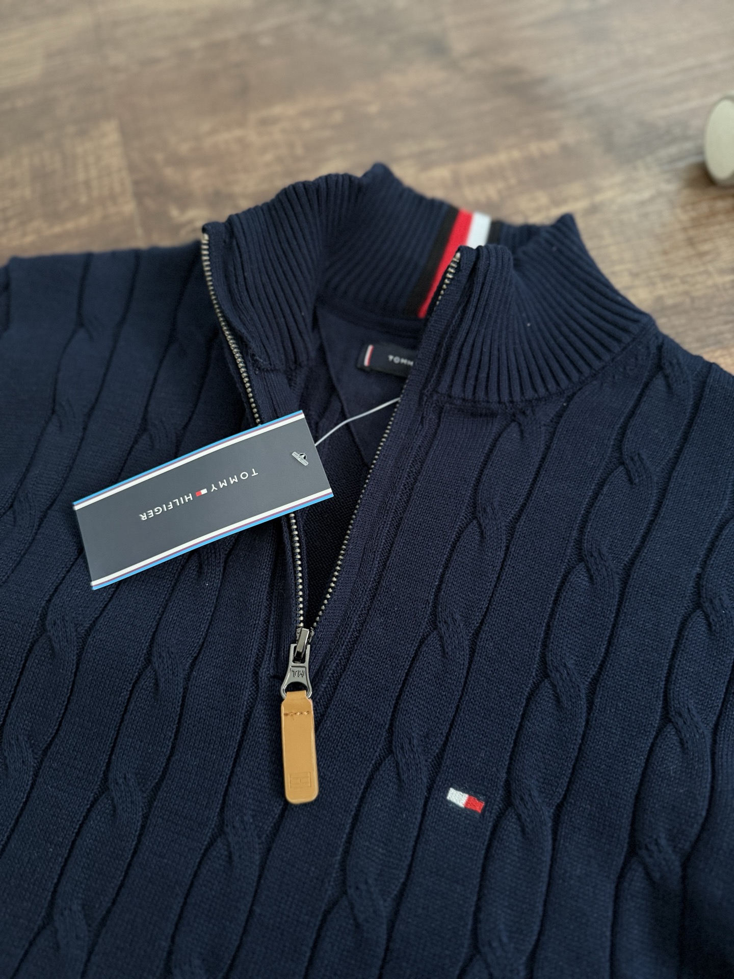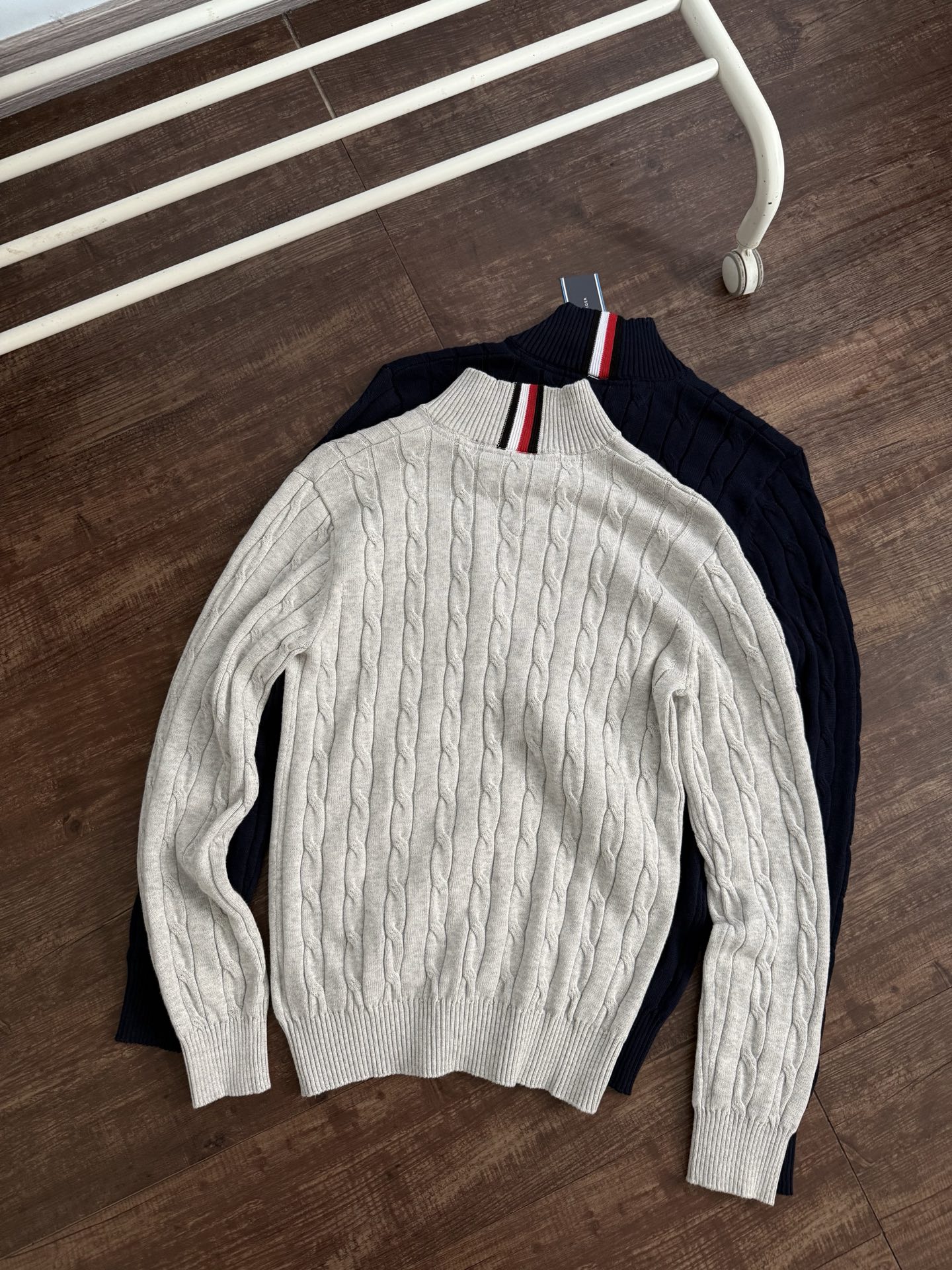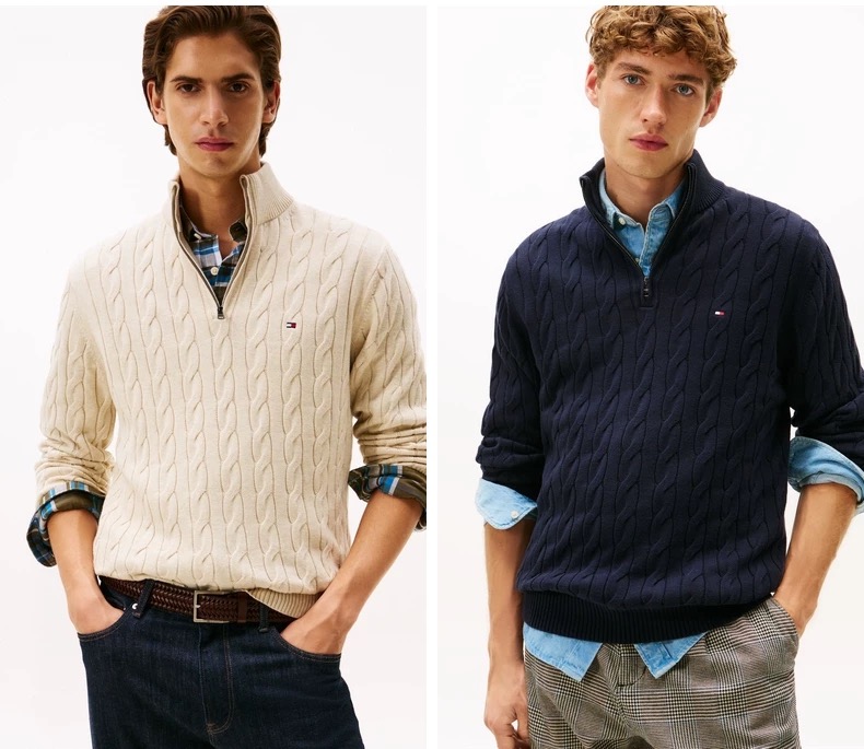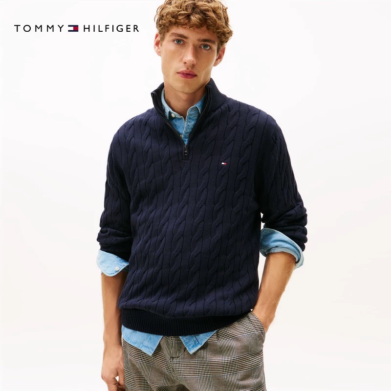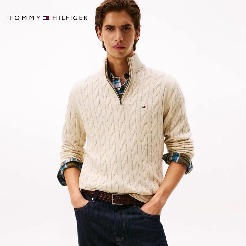 tommy Hilfiger男女同款麻花/绞花半拉链毛衣,范丞丞同款,纯棉质地,多色可选,单穿叠穿都好好看半拉链纯色小标刺绣logo针织毛衣。