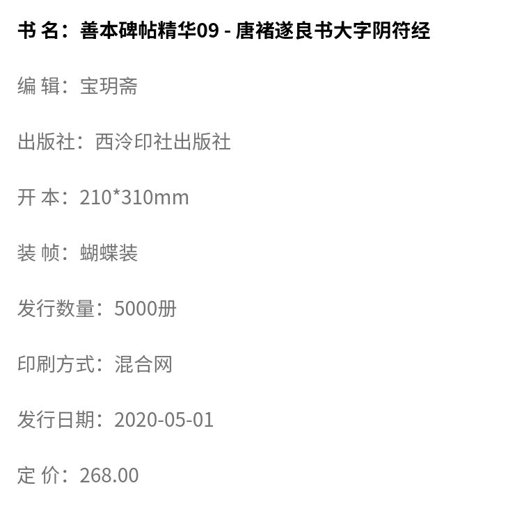 书 名:精华碑帖鉴赏版•褚遂良书大字阴符经 编 辑:宝玥斋 出版社:西泠印社出版社 开 本:210*310mm 装 帧:锁线胶装 发行数量:10000册 印刷方式:混合网 发行日期:2020-05-01 定 价:98.00