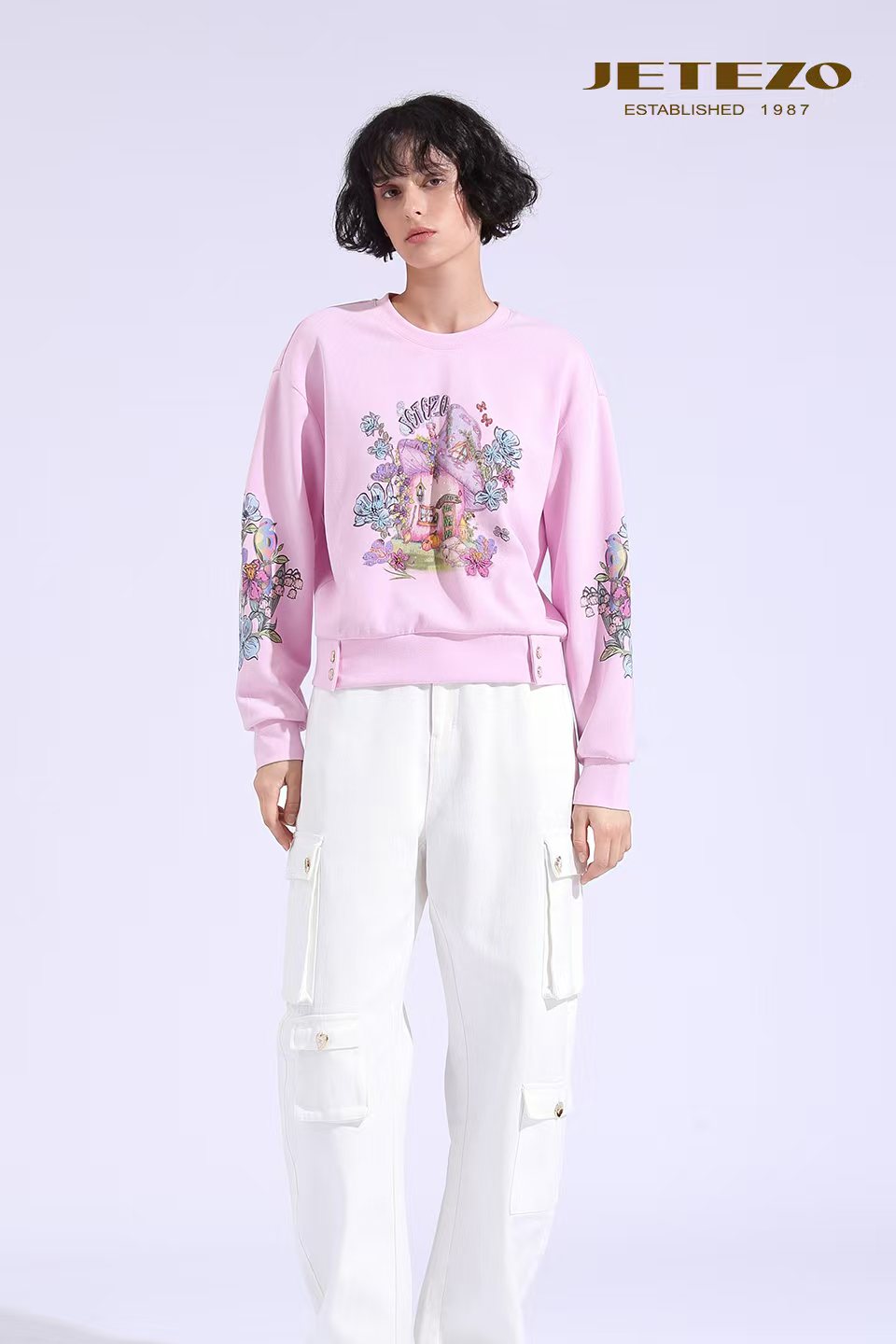 裘堤婼JETEZO童话屋粉紫色趣味卫衣BE10313A1
