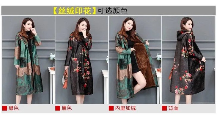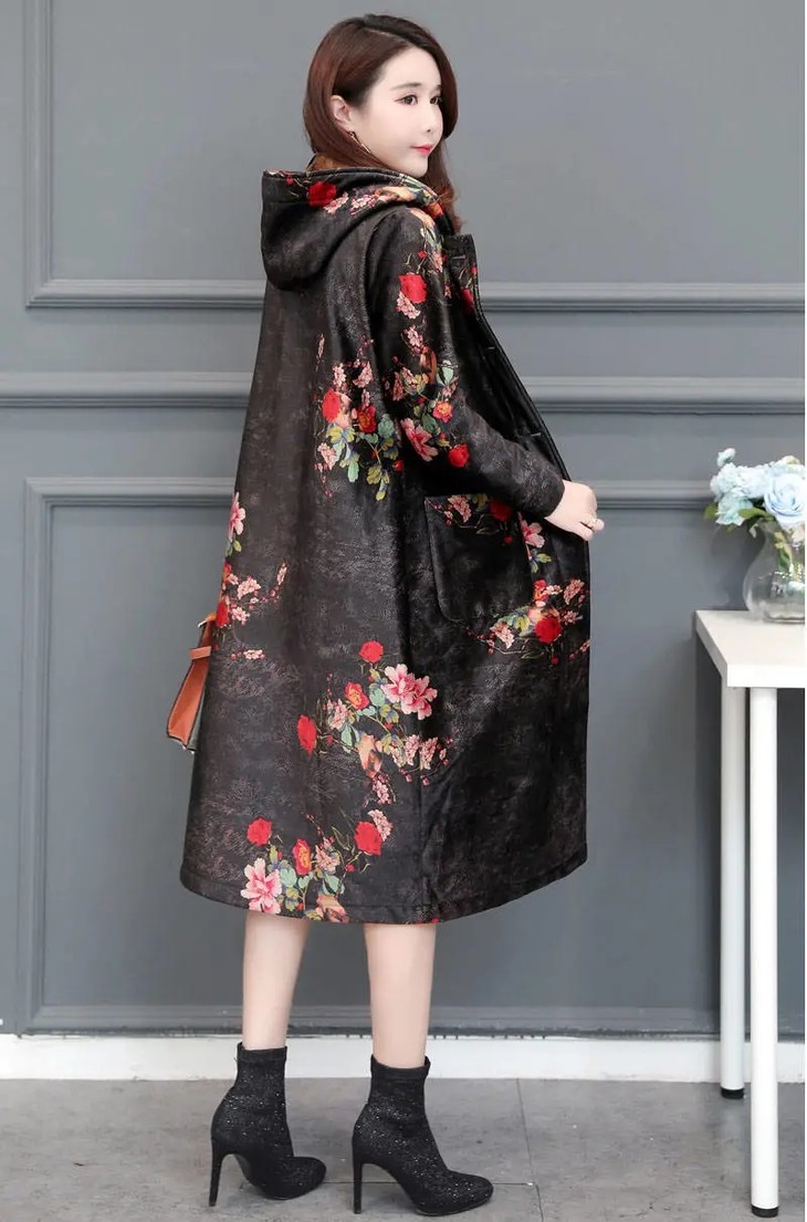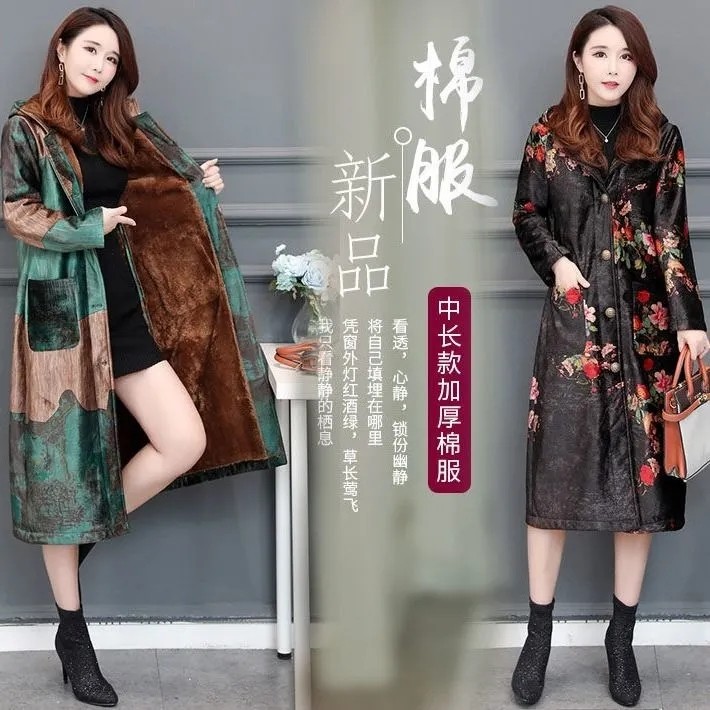 JXG-冬季中长款丝绒棉服风衣外套女民族风印花过膝大衣加绒加厚棉衣潮