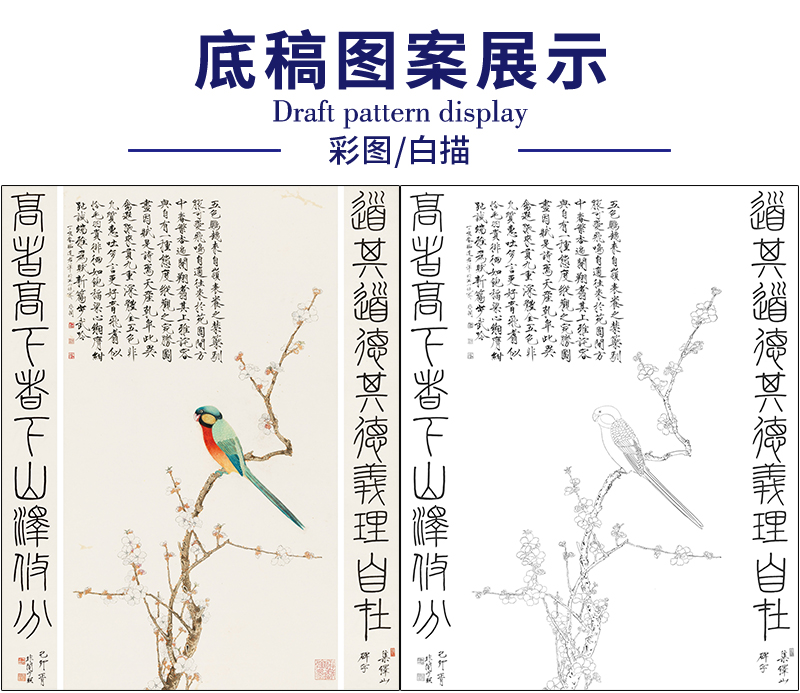 于非闇花鸟工笔画白描底稿《五色鹦鹉并篆书十言对联》临摹勾线高清打印稿HS31