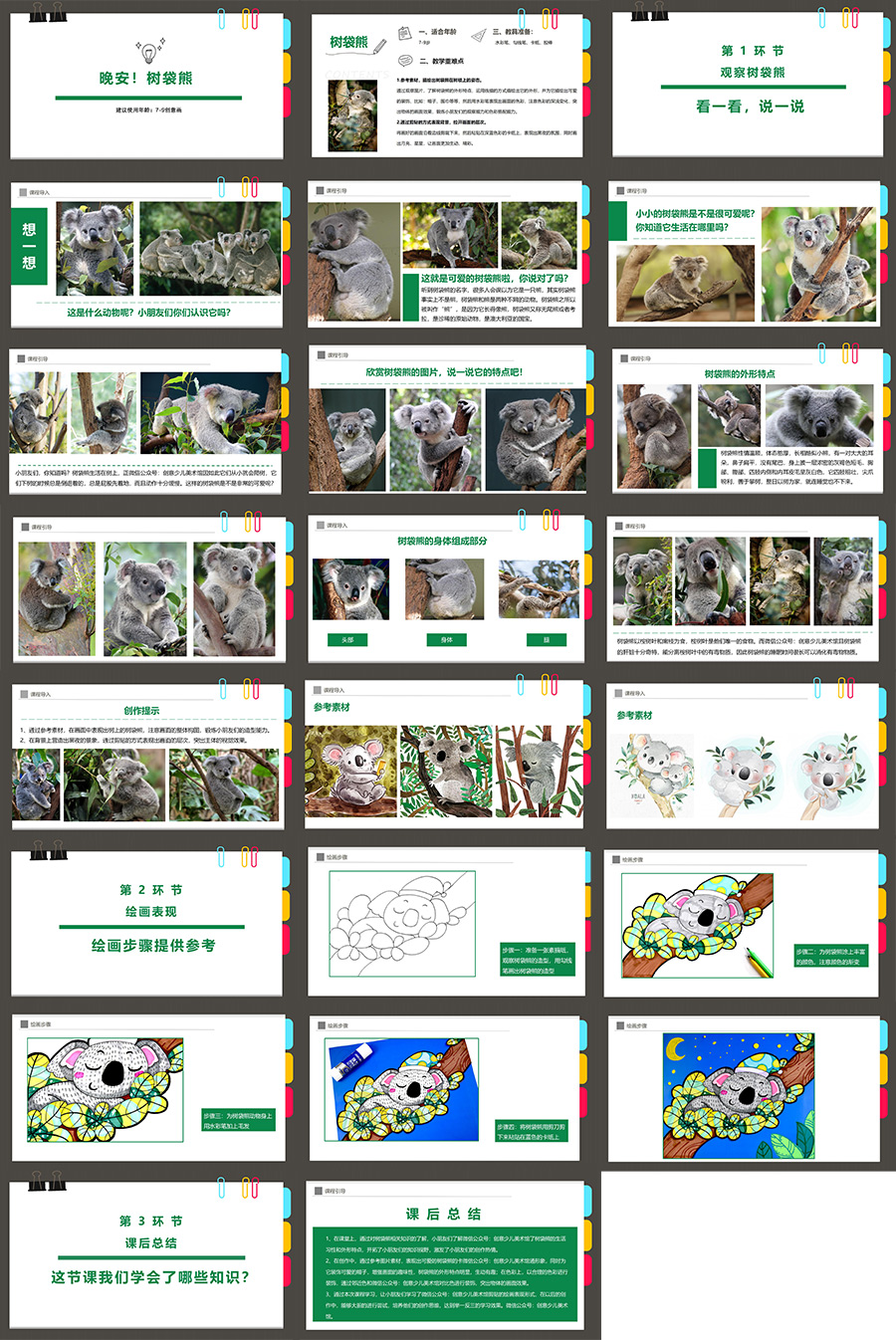 通过观察图片,了解树袋熊的外形特点,运用线描的方式描绘出它的外形,并为它描绘出可爱的装饰、比如:帽子、围巾等等,然后用水彩笔表现出画面的色彩,注意色彩的深浅变化,突出物体的画面效果,锻炼小朋友们的观察能力和色彩搭配能力。