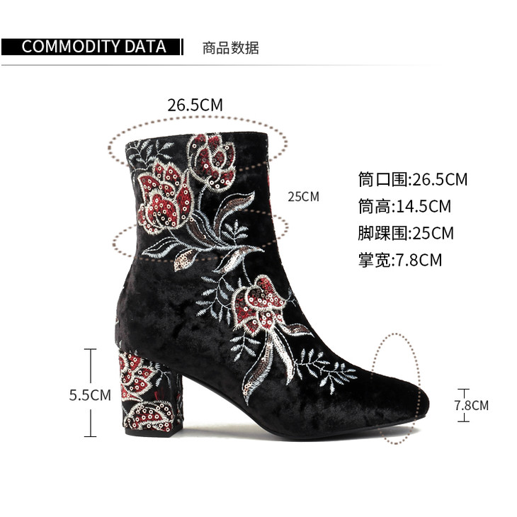MJM-L388-2A 秋季新款民族风刺绣绒面复古丝绒绣花粗跟短靴
