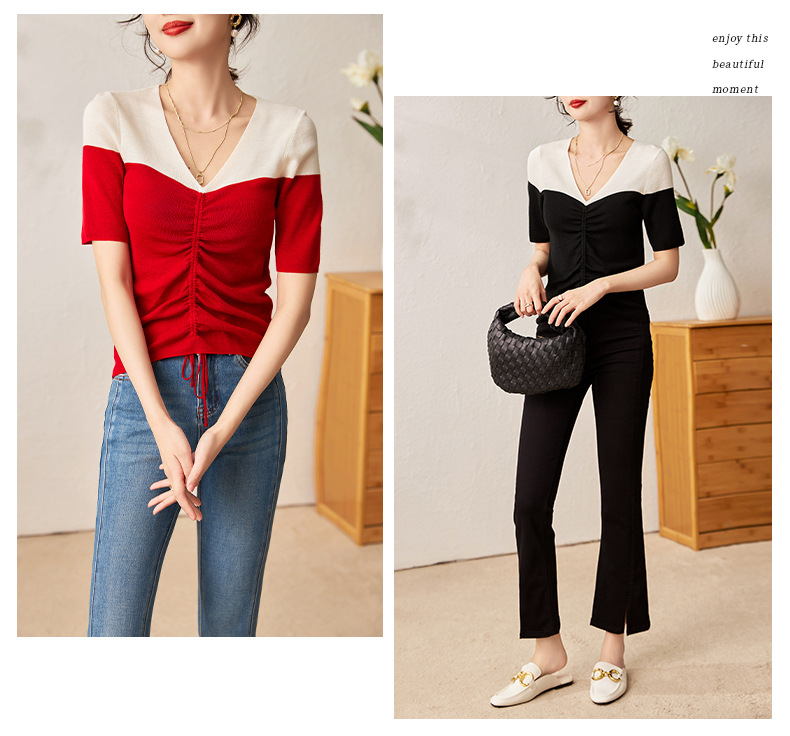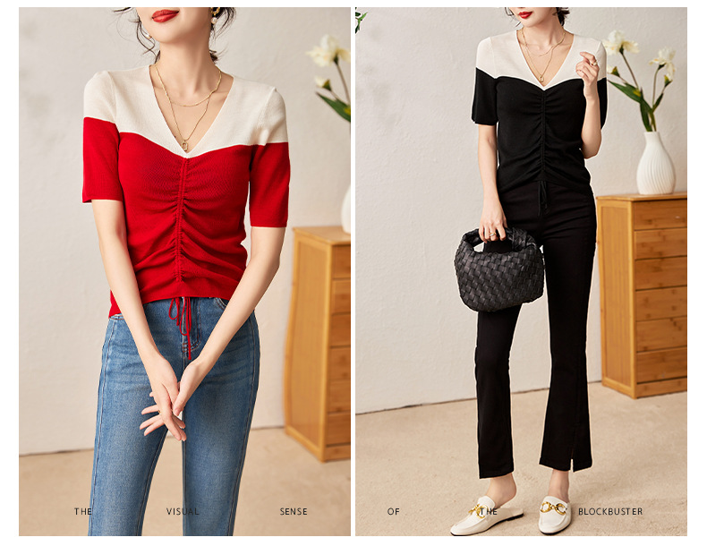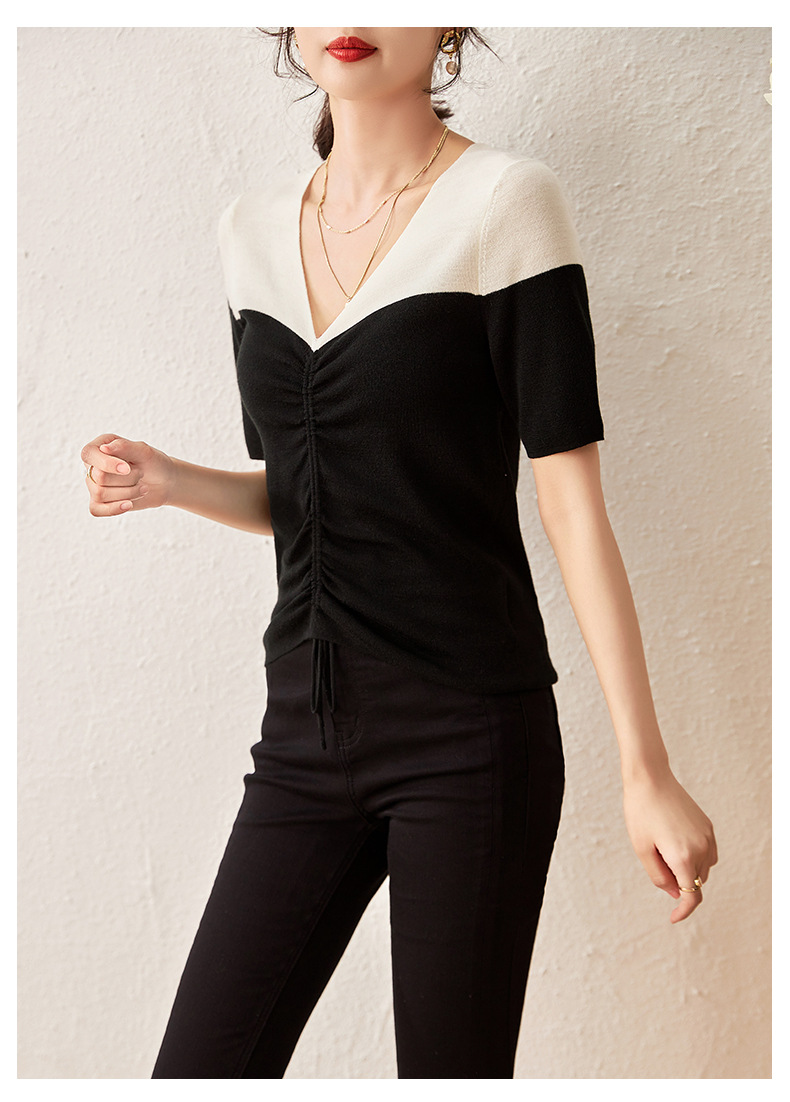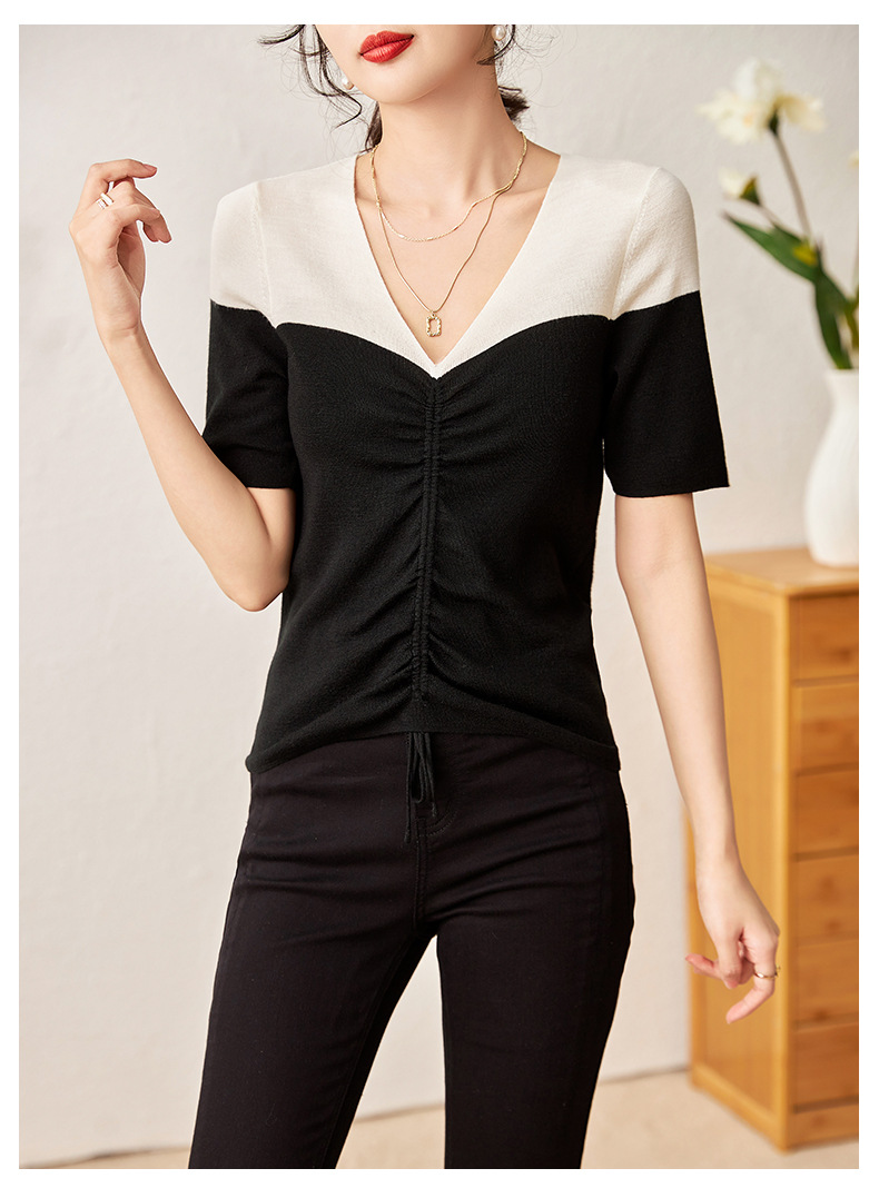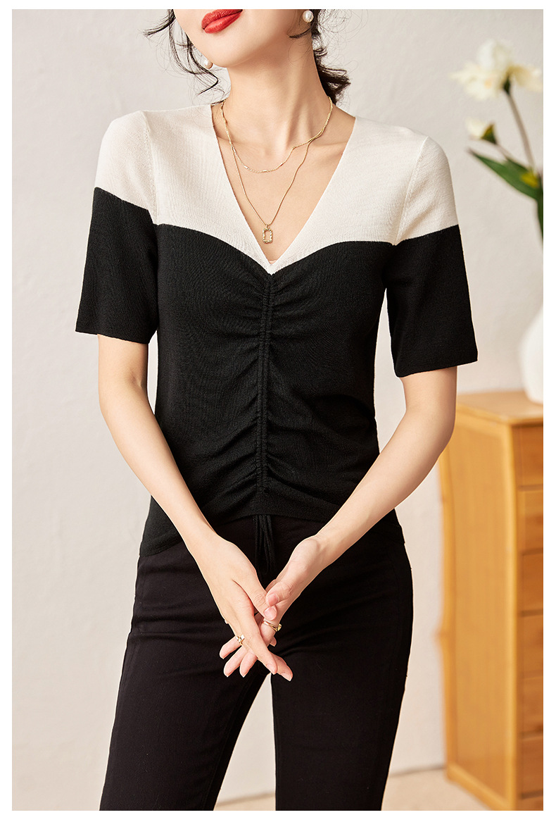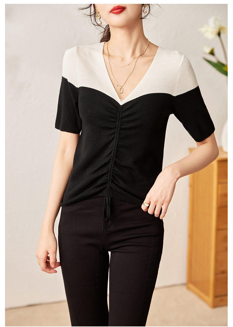 时尚撞色,16针80支极细美丽诺羊毛小众设计拼色系带抽绳T恤针织衫WLZD-2301806