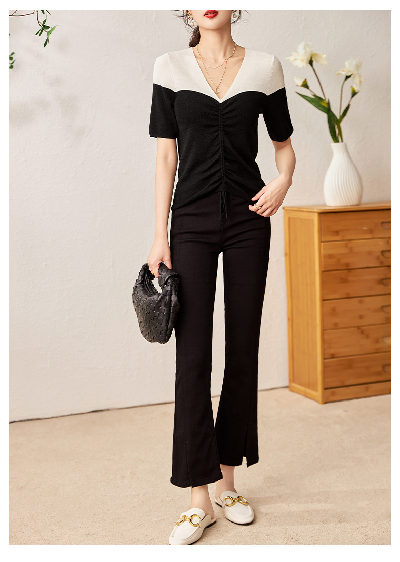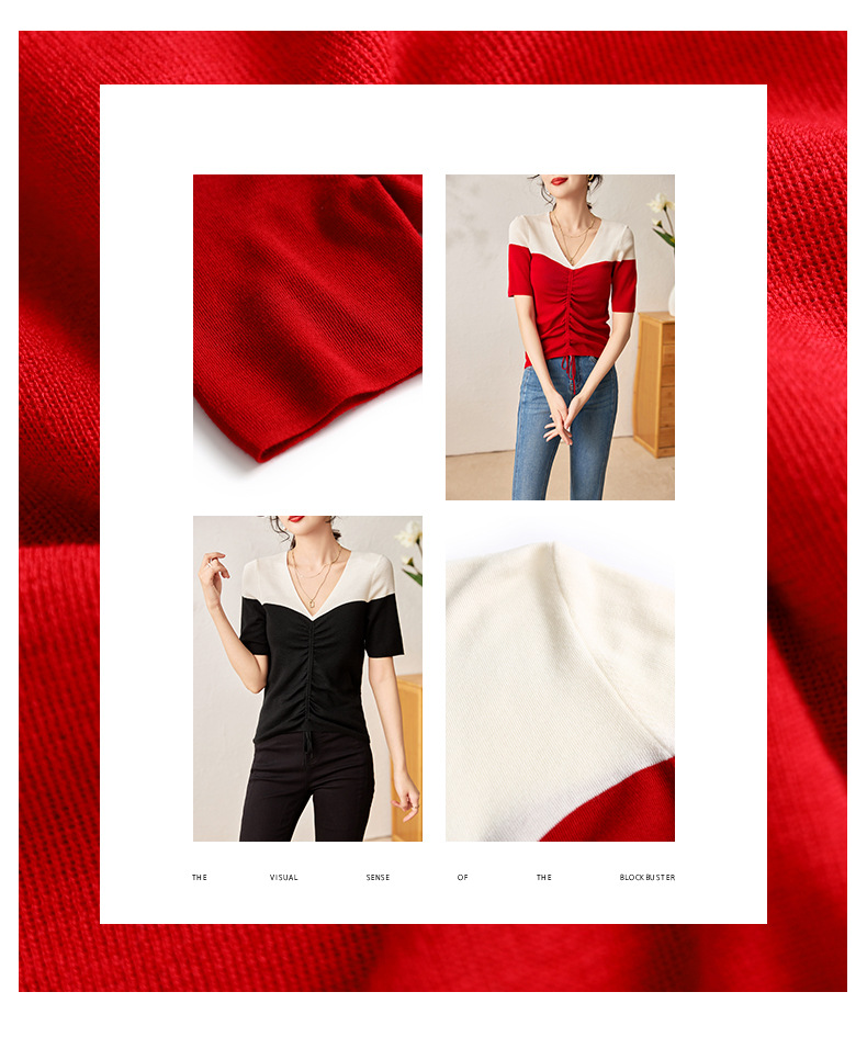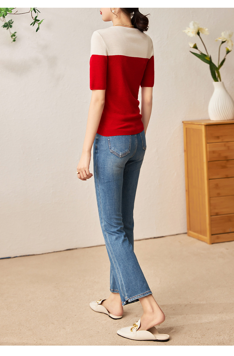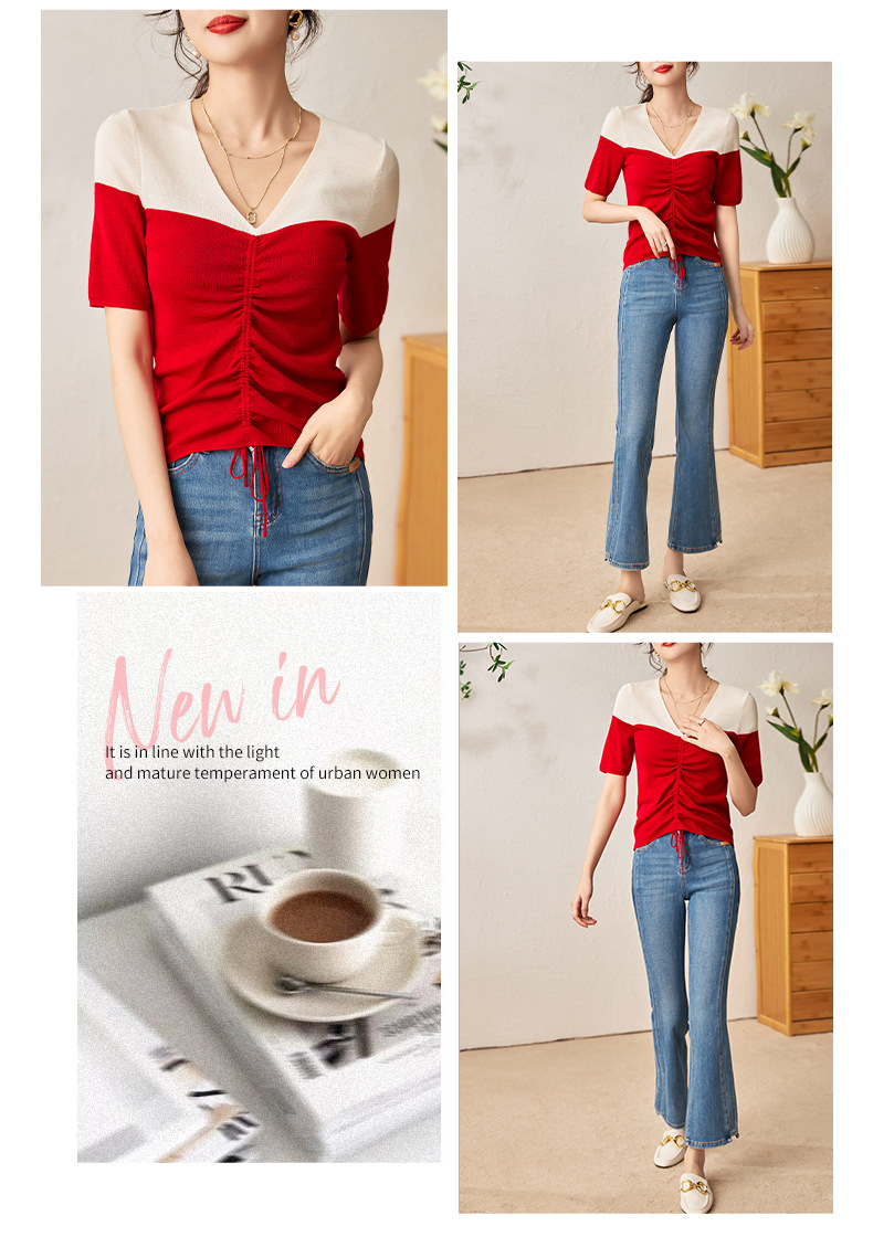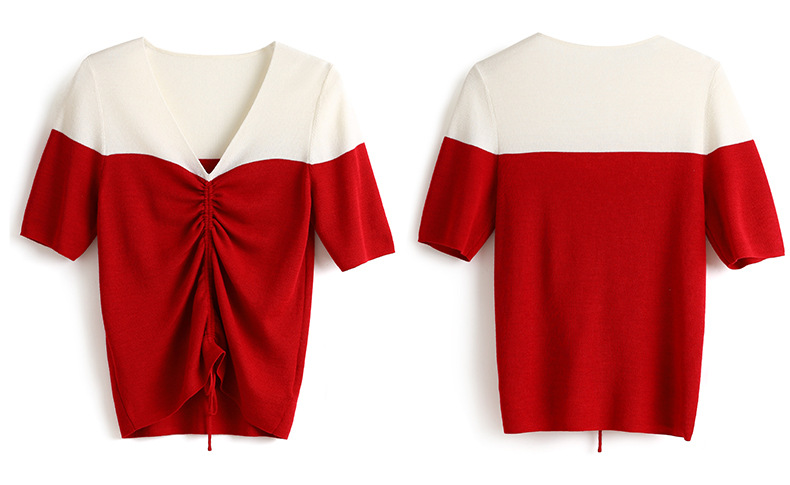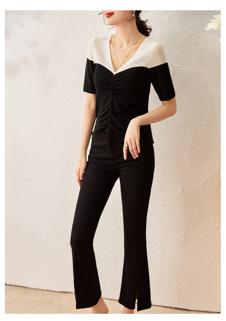 时尚撞色,16针80支极细美丽诺羊毛小众设计拼色系带抽绳T恤针织衫WLZD-2301806