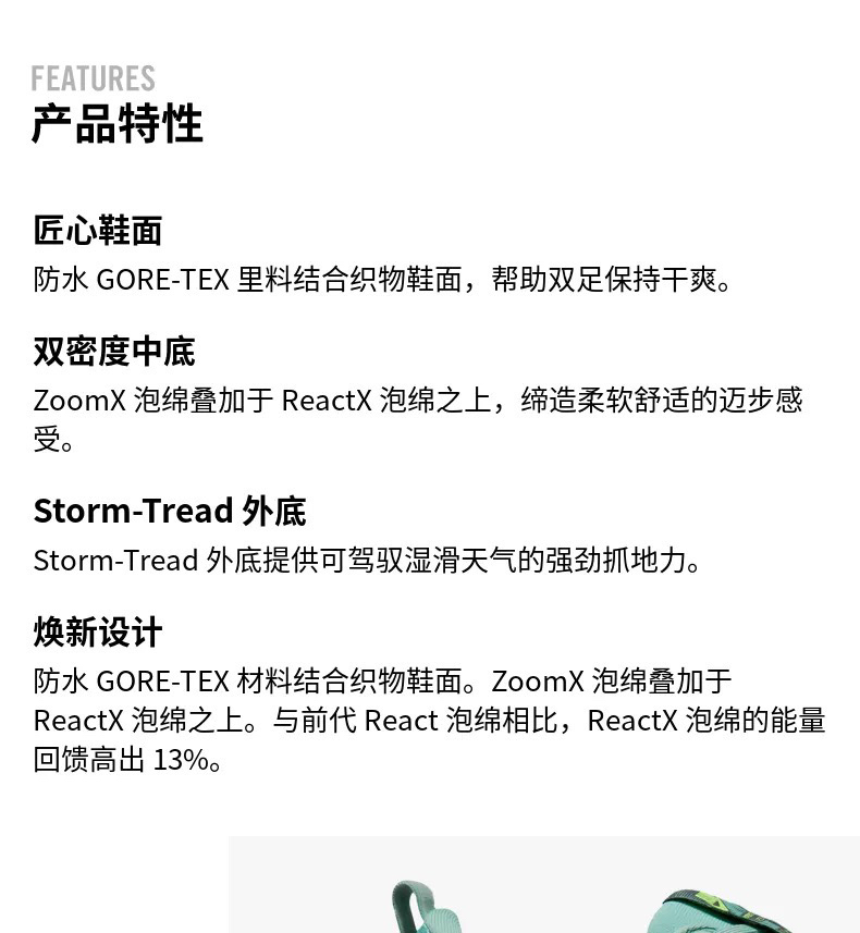 ➡️中底采用了 Nike家最顶级的泡棉双层结构,ZoomX提供轻盈柔软的高回弹脚感,而ReactX增强支撑稳定性,避免侧翻崴脚等问题,同时兼顾了舒适与防护性~