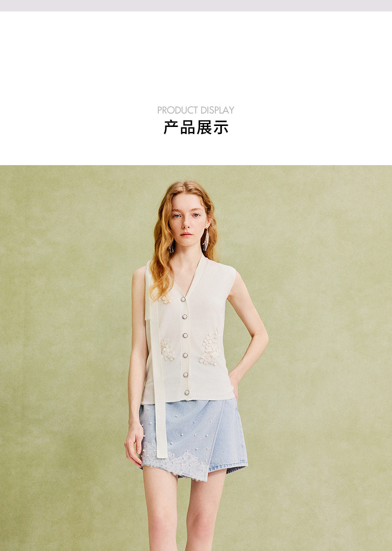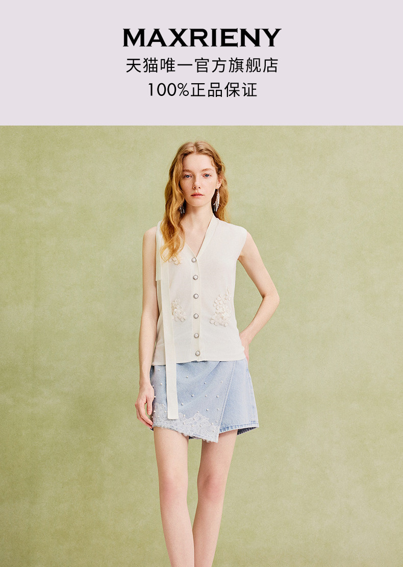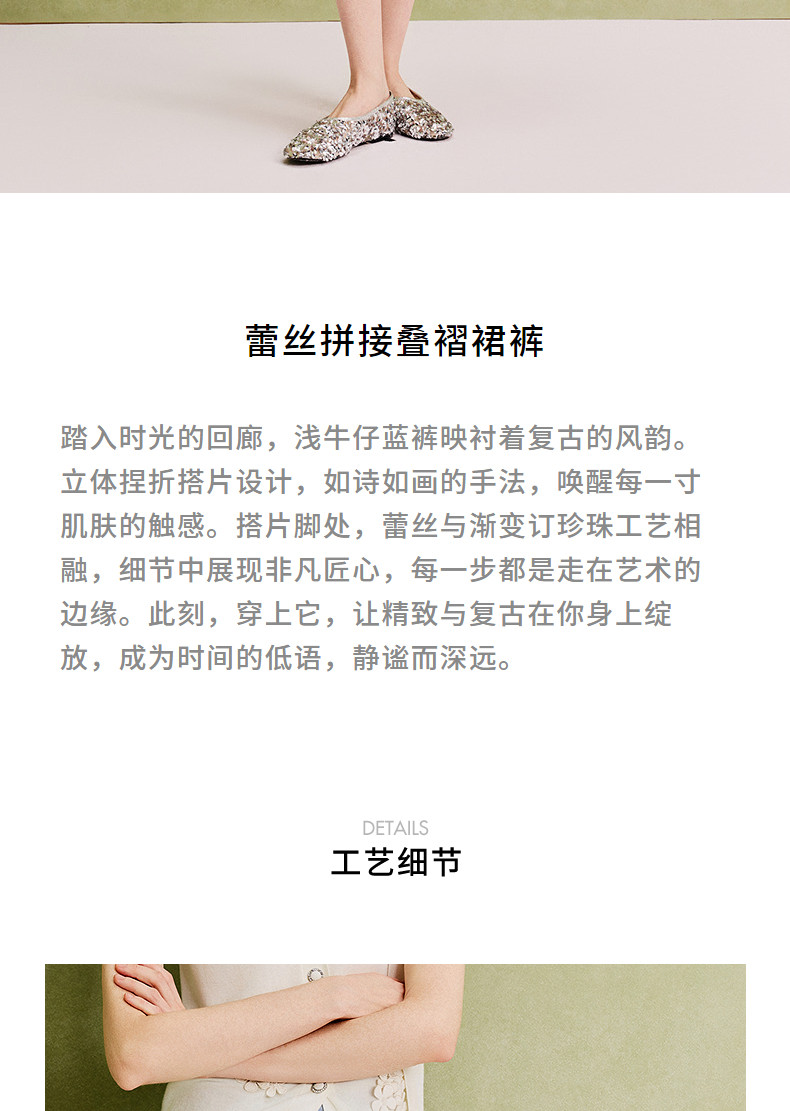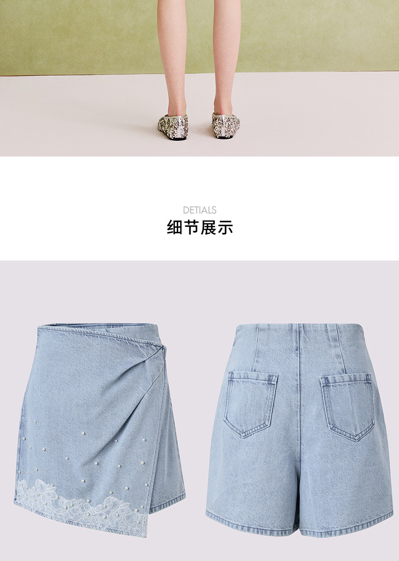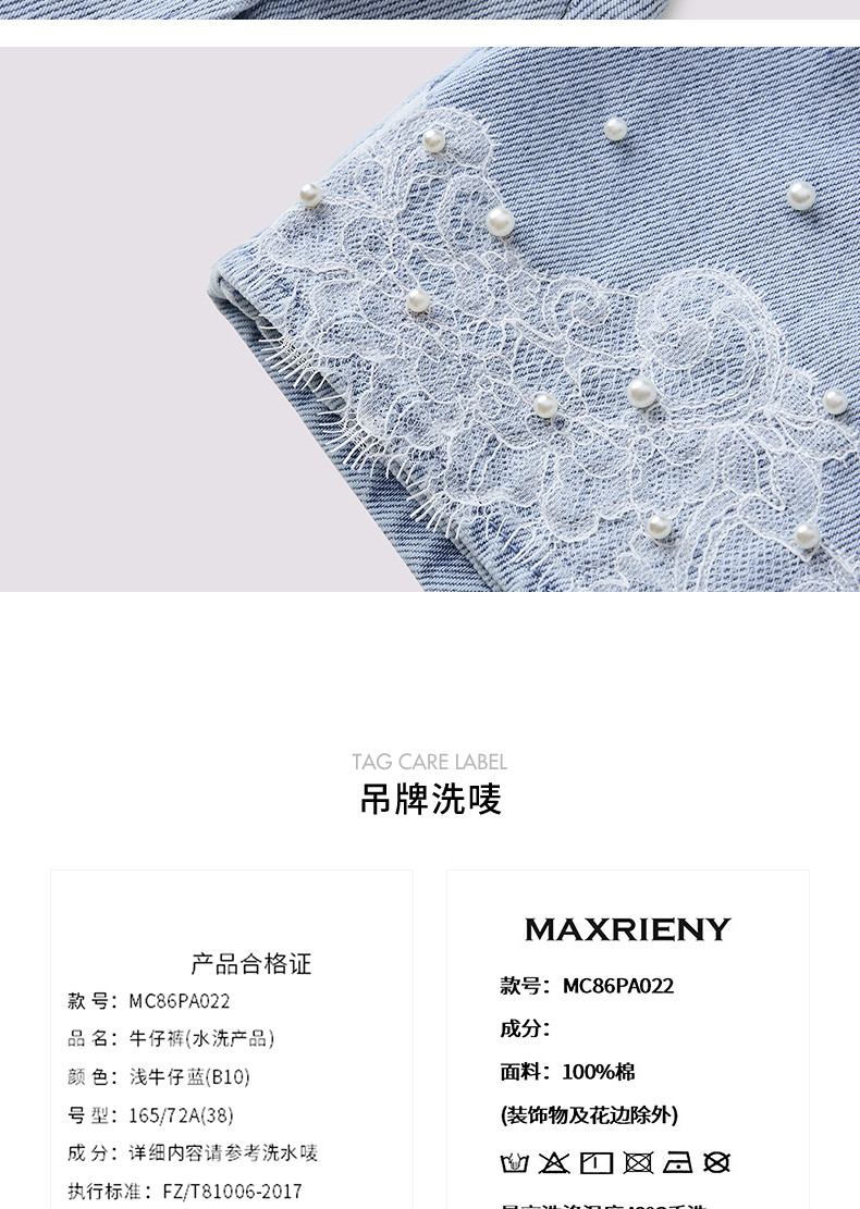 【商场同款】MAXRIENY精致复古浅蓝牛仔裤裙25夏蕾丝拼接叠褶裙裤(货号:MC86PA022)