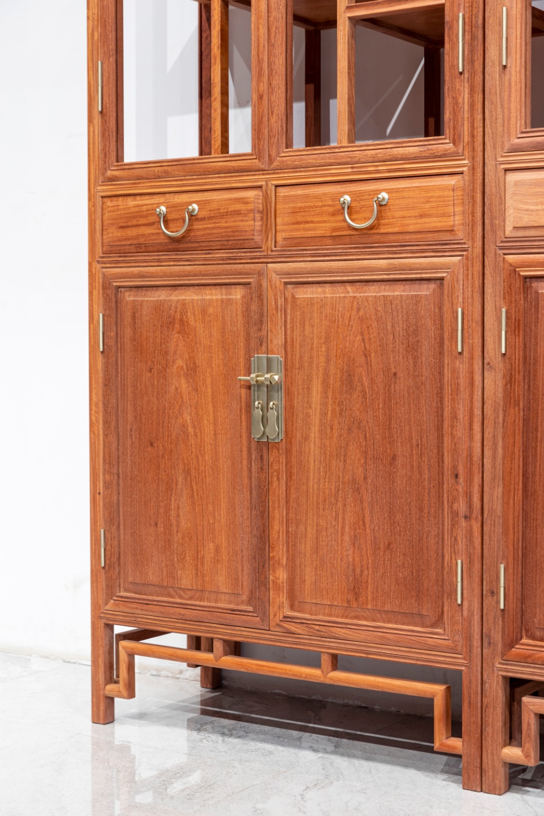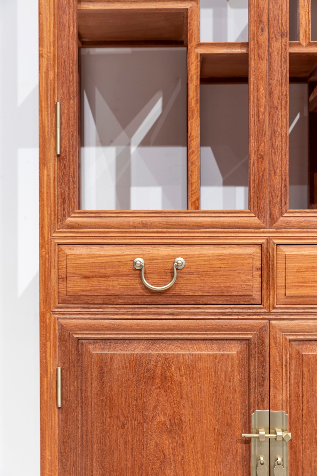 此款多宝阁形玻璃展示柜,造型高挑,占地不大,通体明式素工线条,上层透明玻璃展示,内部结构错落有序,展陈有致,可置放文玩、书籍等物,一目了然,有效防尘。中部设有抽屉两具,抽屉下为双开门柜子,一木对开独板面,柜子储物空间容量大,大件物品也可轻松容纳。柜腿间置罗锅枨加矮老,罗锅枨起落直来直往,方材直足。整器一柜多用,展示收纳一应俱全。