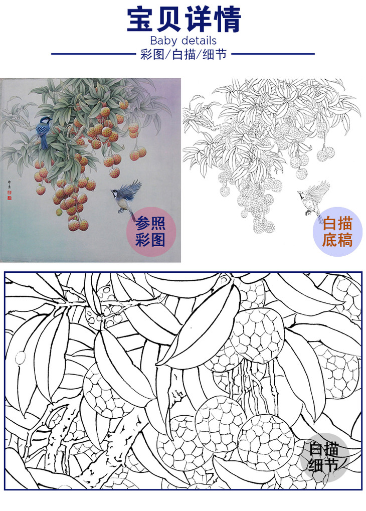 工笔花鸟白描底稿-孙锡之-荔枝大山雀-斗方小品册页-SX07