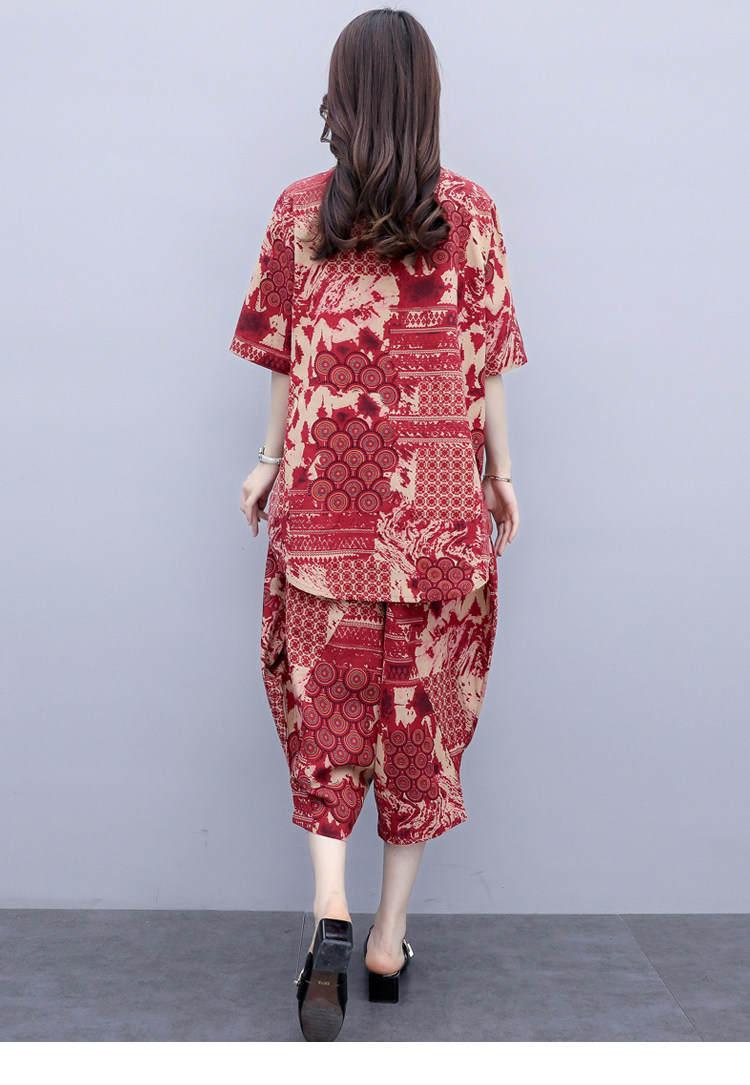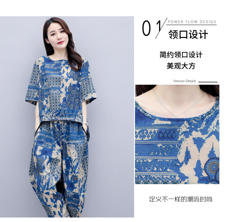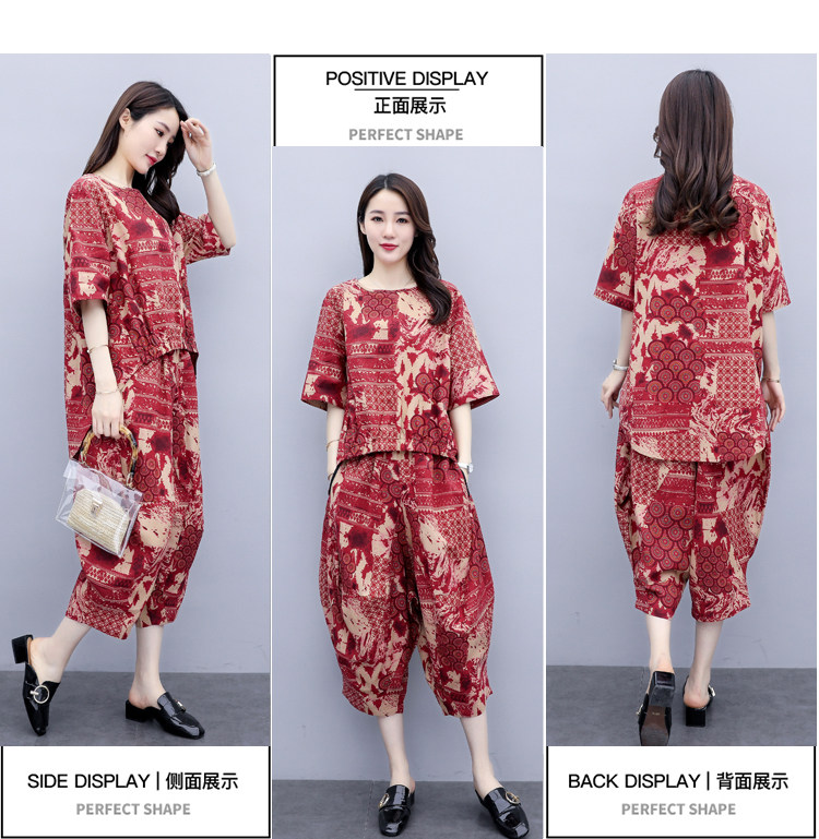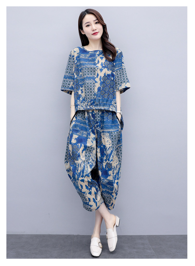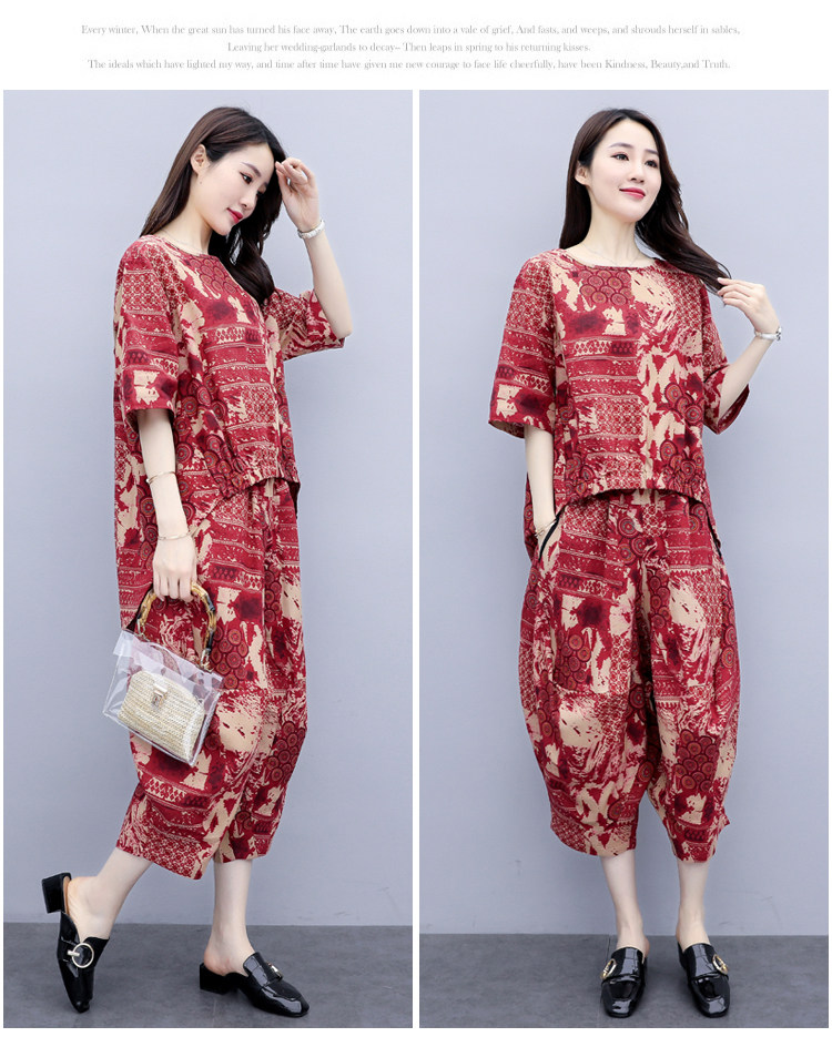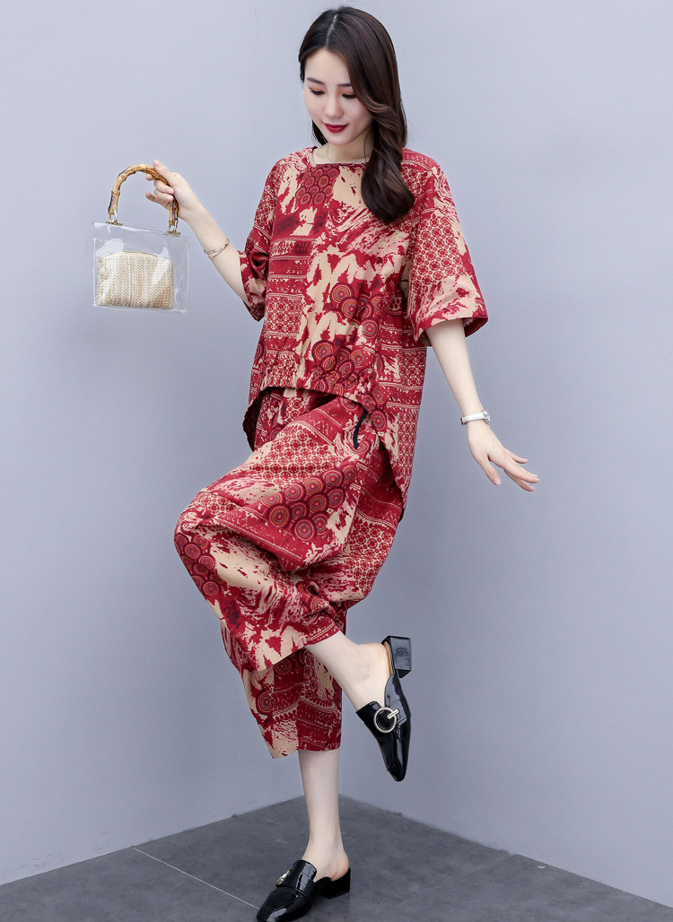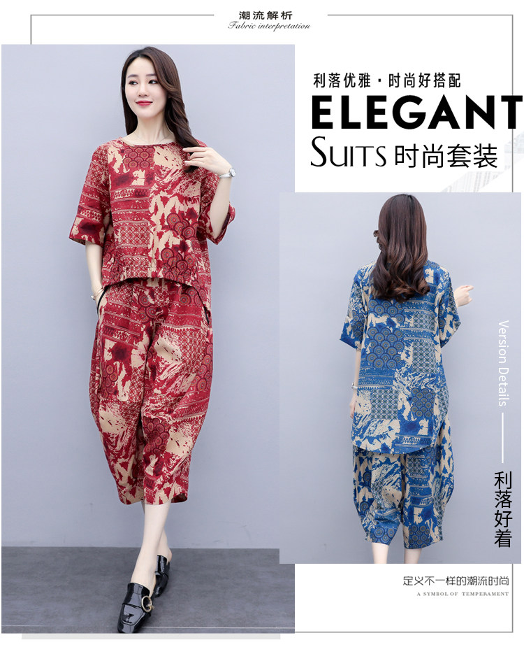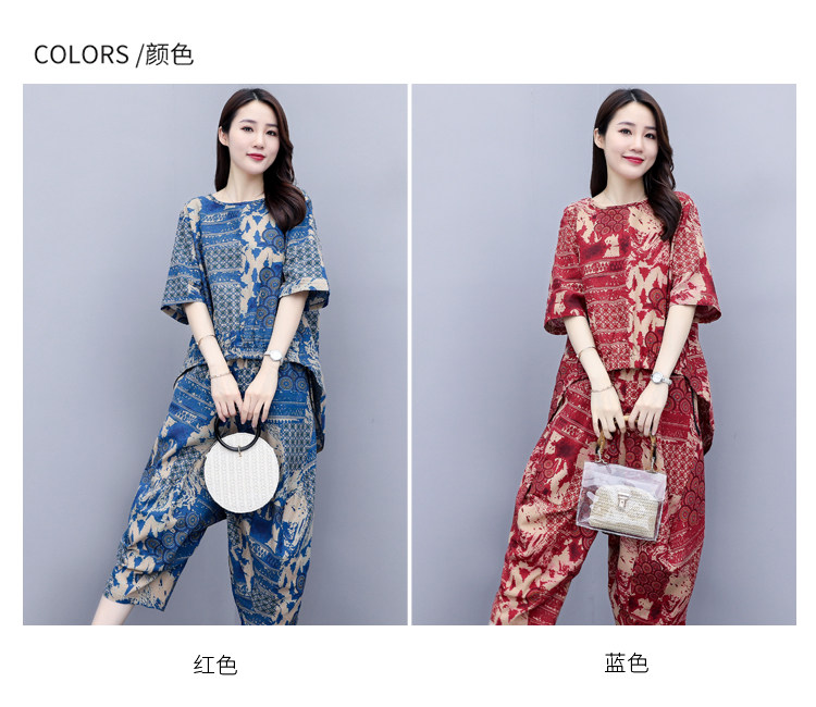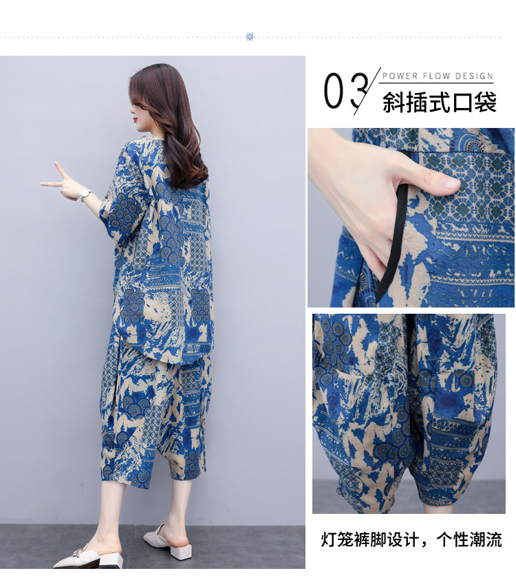 F 5924春季新款民族风印花时尚立领盘扣修身显瘦气质阔腿裤套装