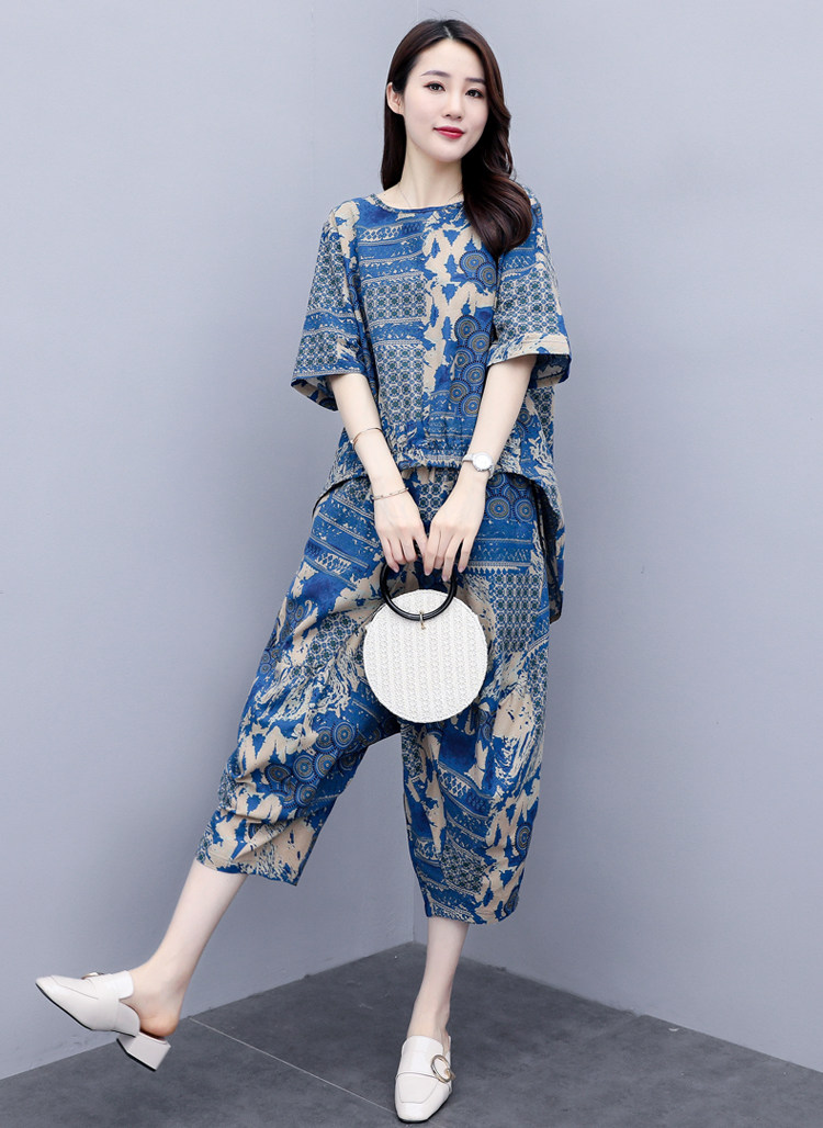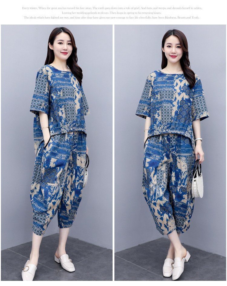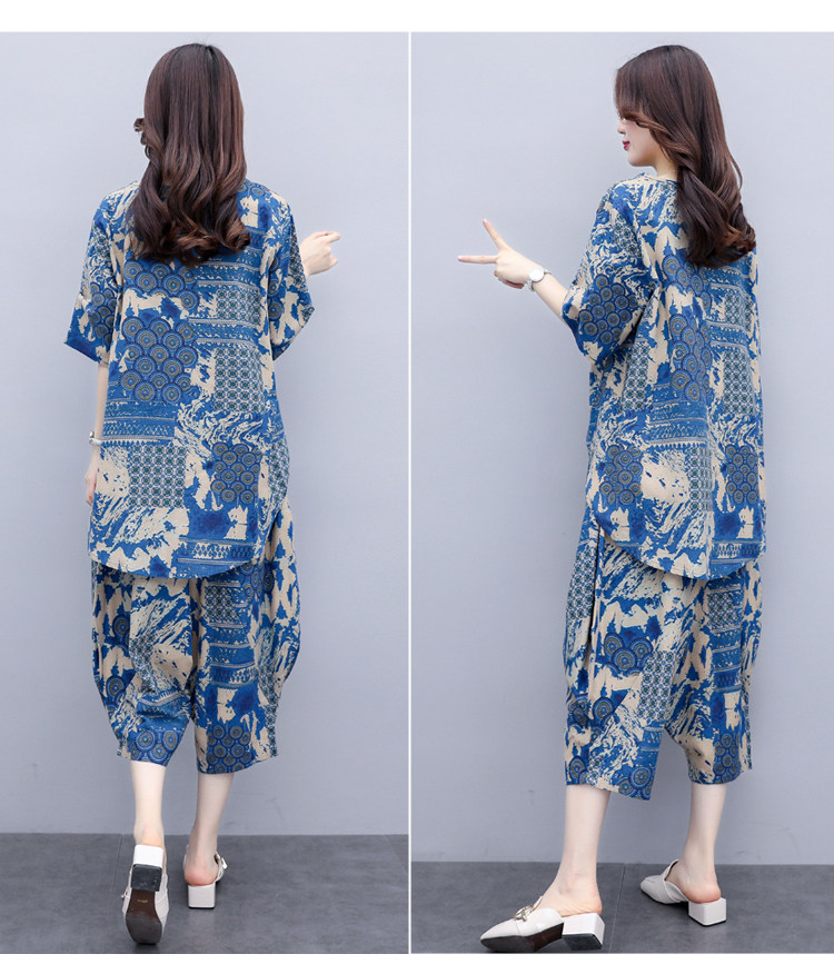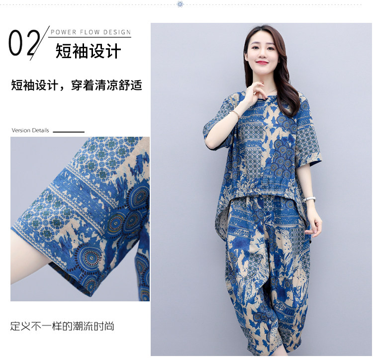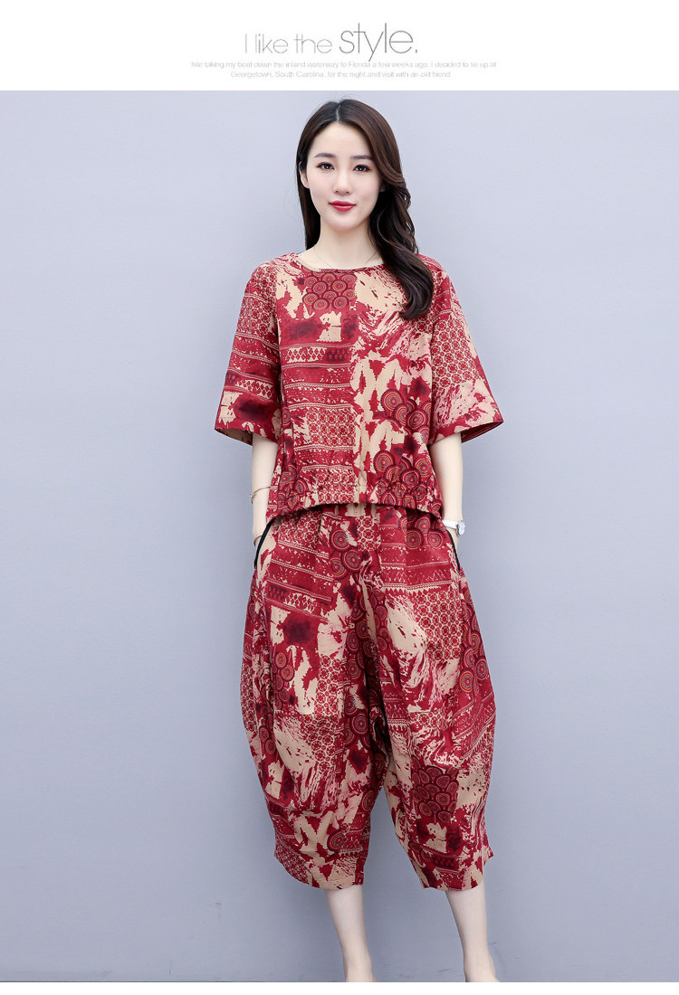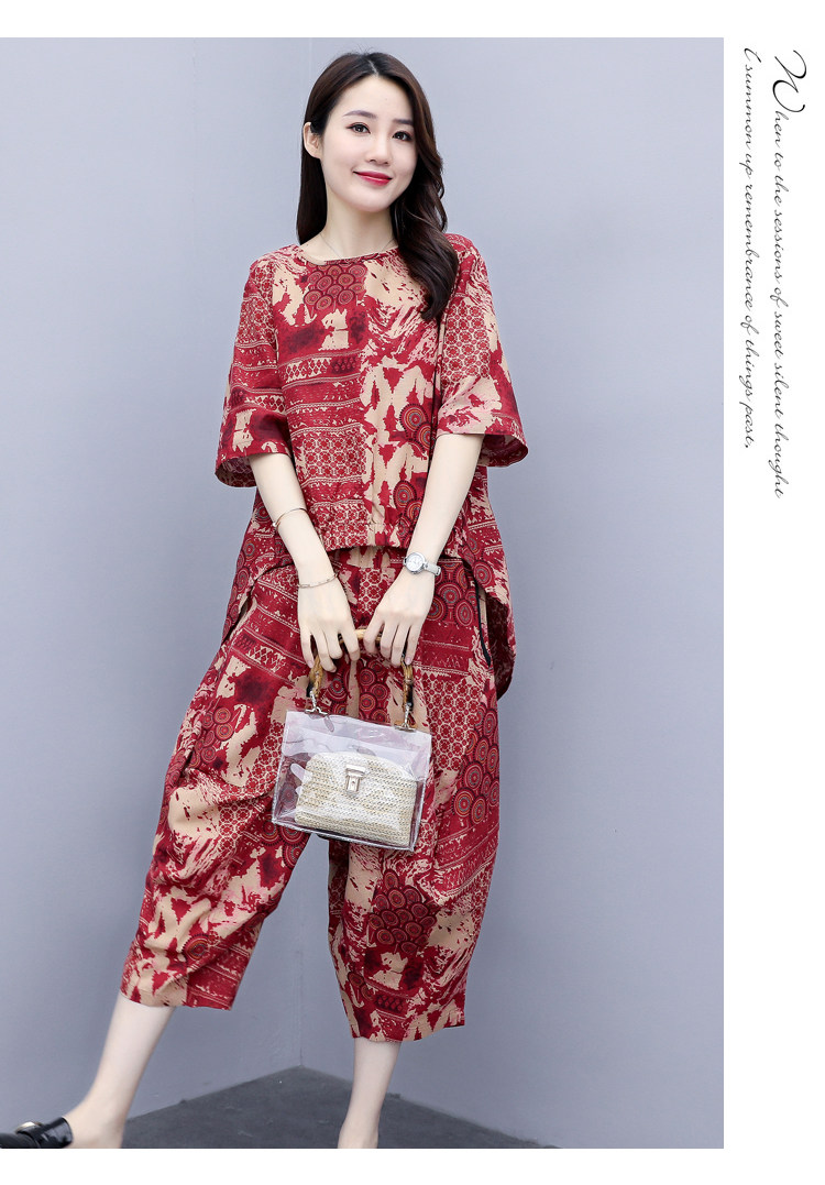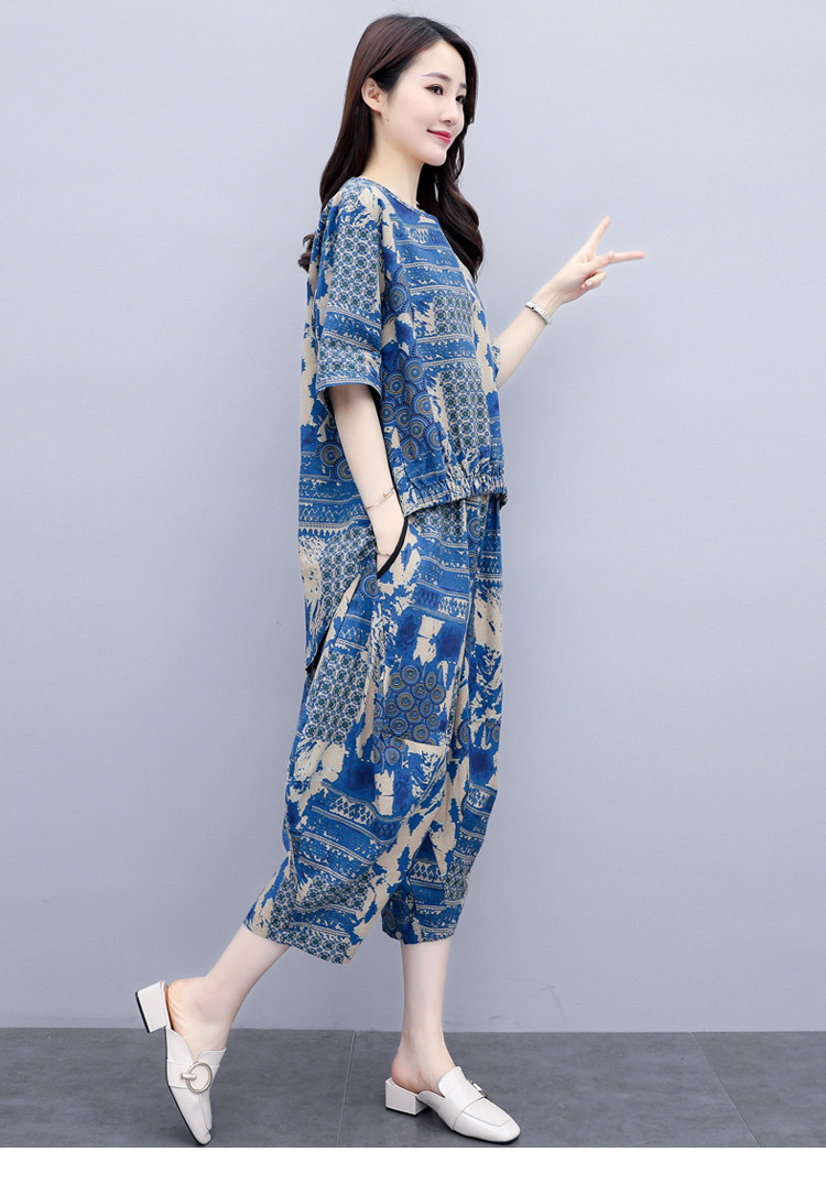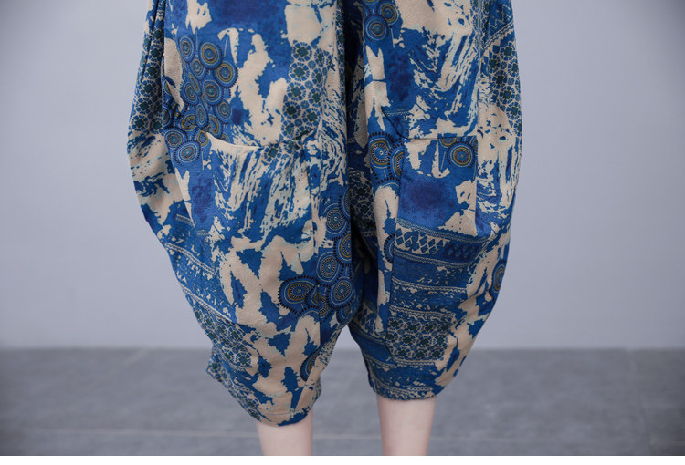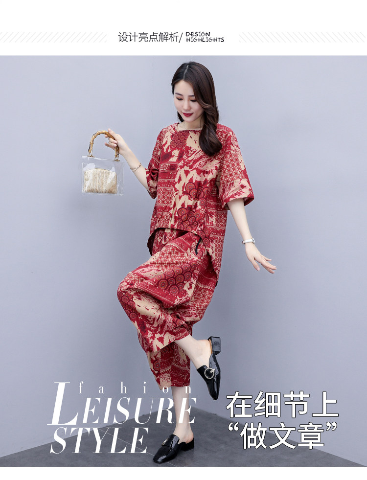 F 5924春季新款民族风印花时尚立领盘扣修身显瘦气质阔腿裤套装