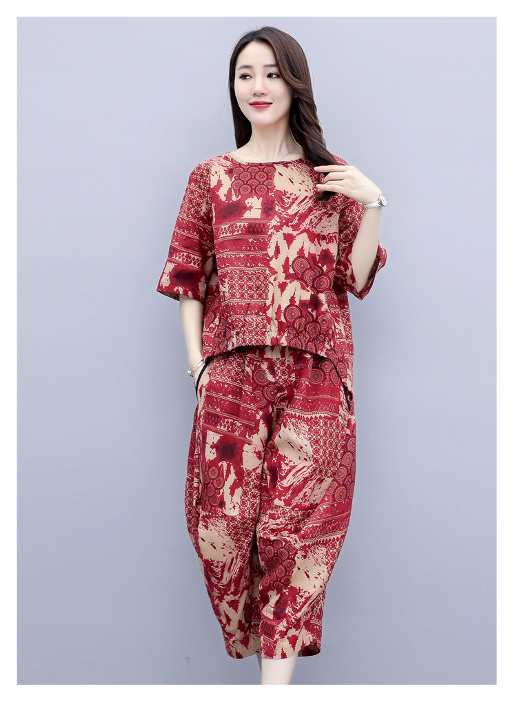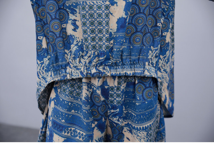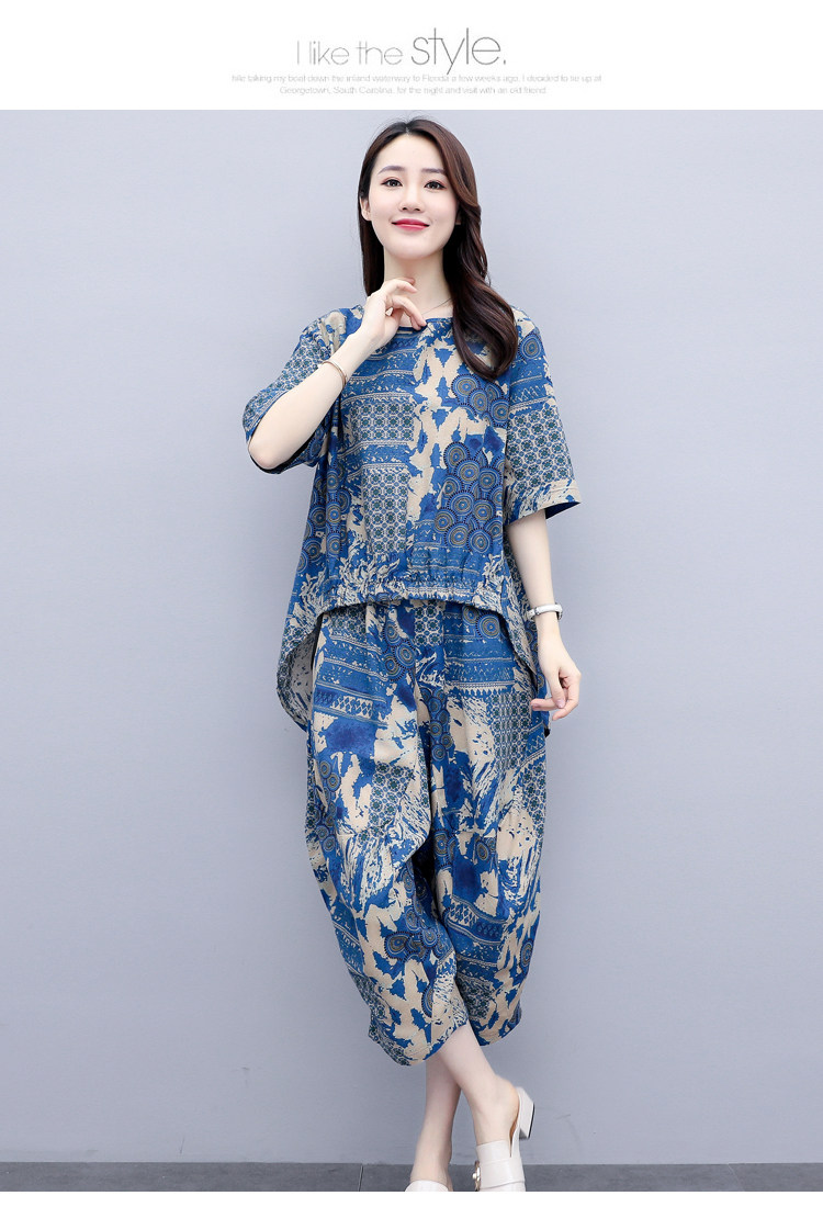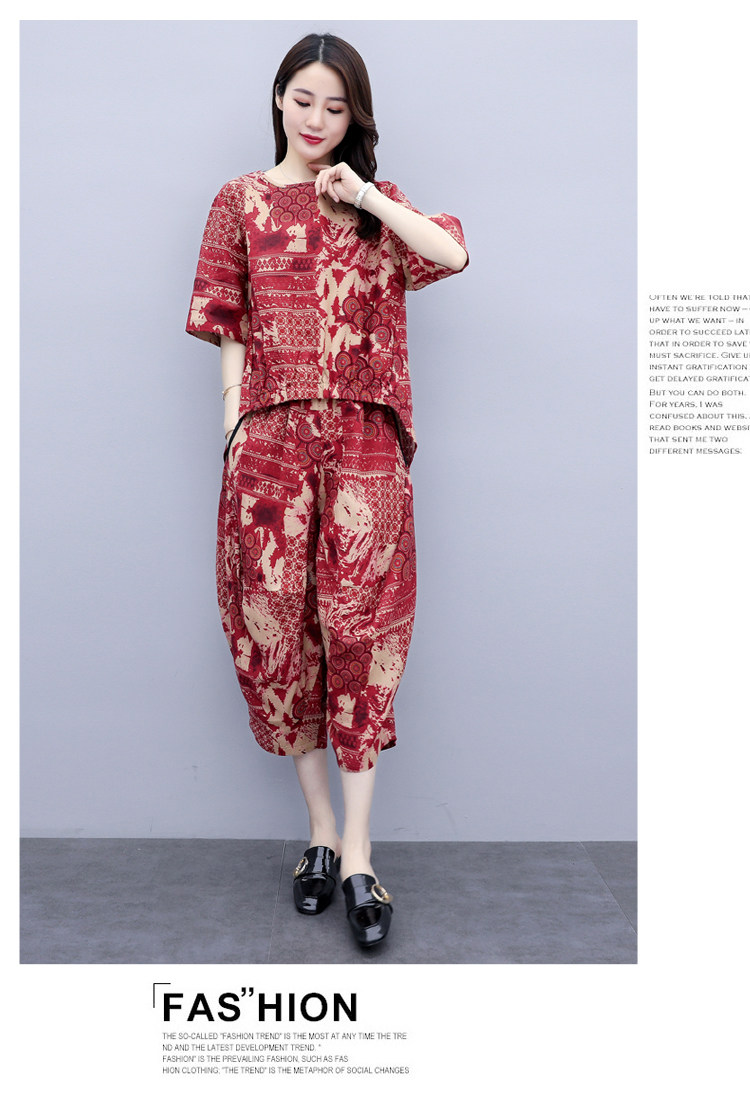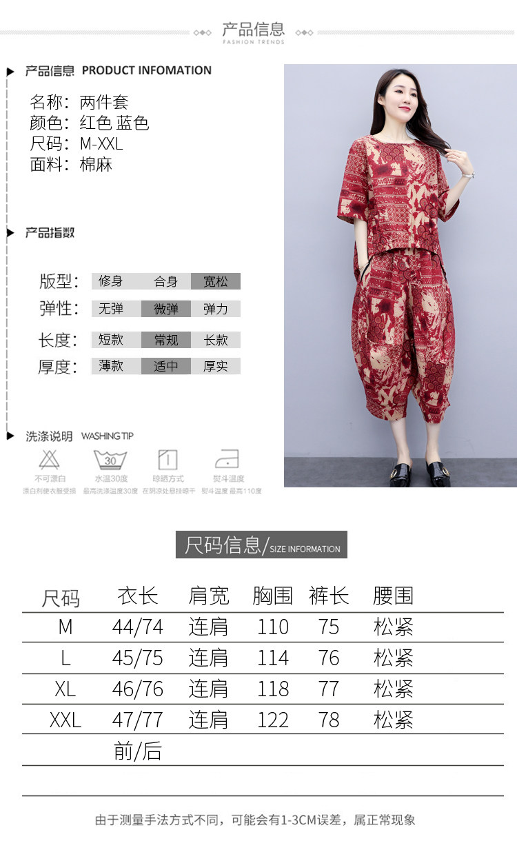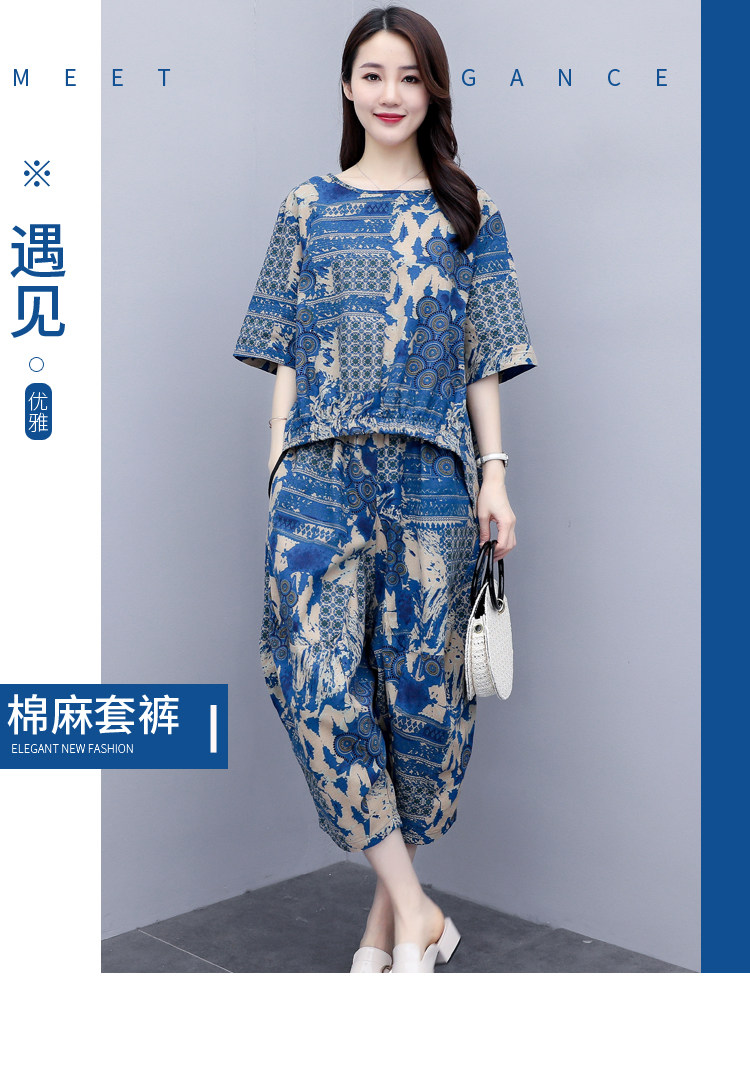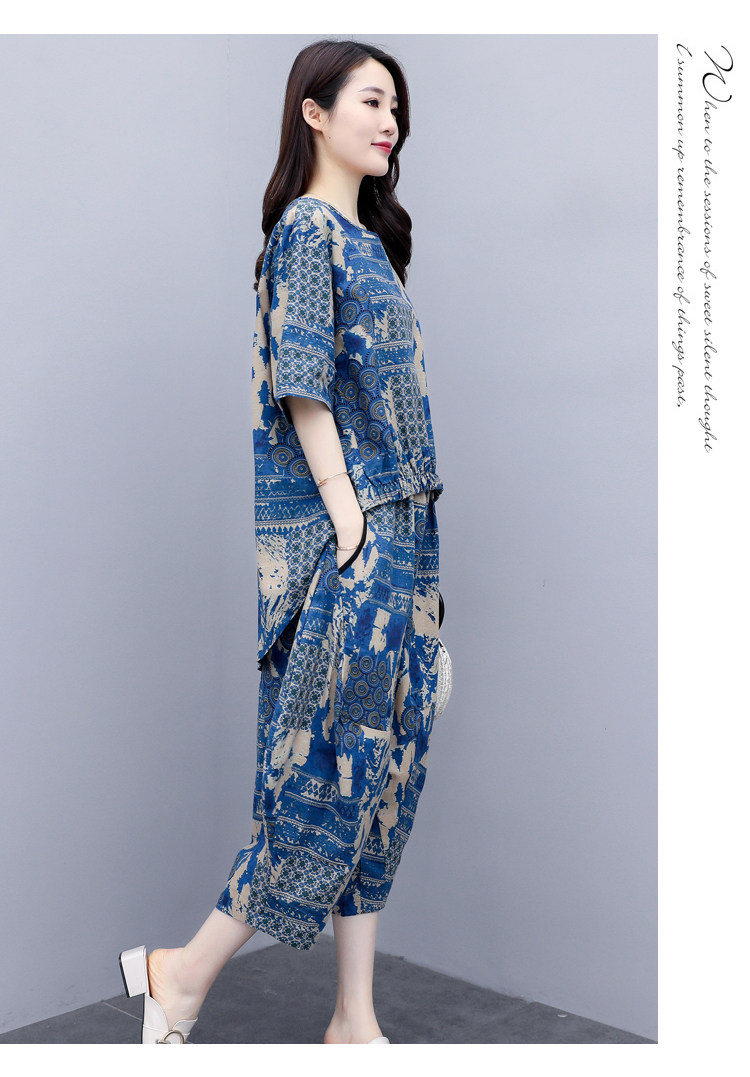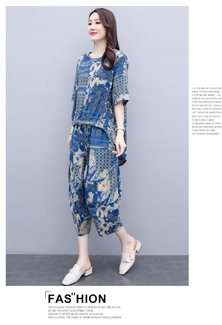 F 5924春季新款民族风印花时尚立领盘扣修身显瘦气质阔腿裤套装