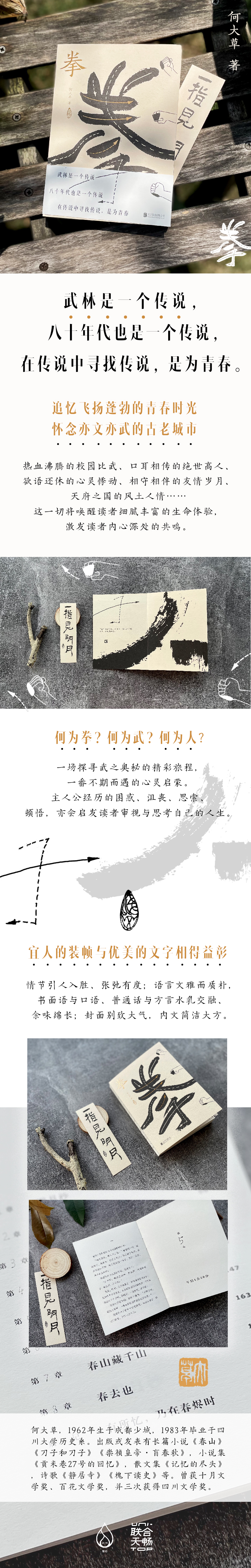 1.《拳》缅怀了一段飞扬蓬勃的青春时光和一座亦文亦武的古老城市。热血沸腾的校园比武、口耳相传的绝世高人、欲语还休的心灵悸动、相守相伴的友情岁月、天府之国的风土人情……在书中交织呈现,将会唤醒读者细腻丰富的生命体验,激发读者内心深处的共鸣。