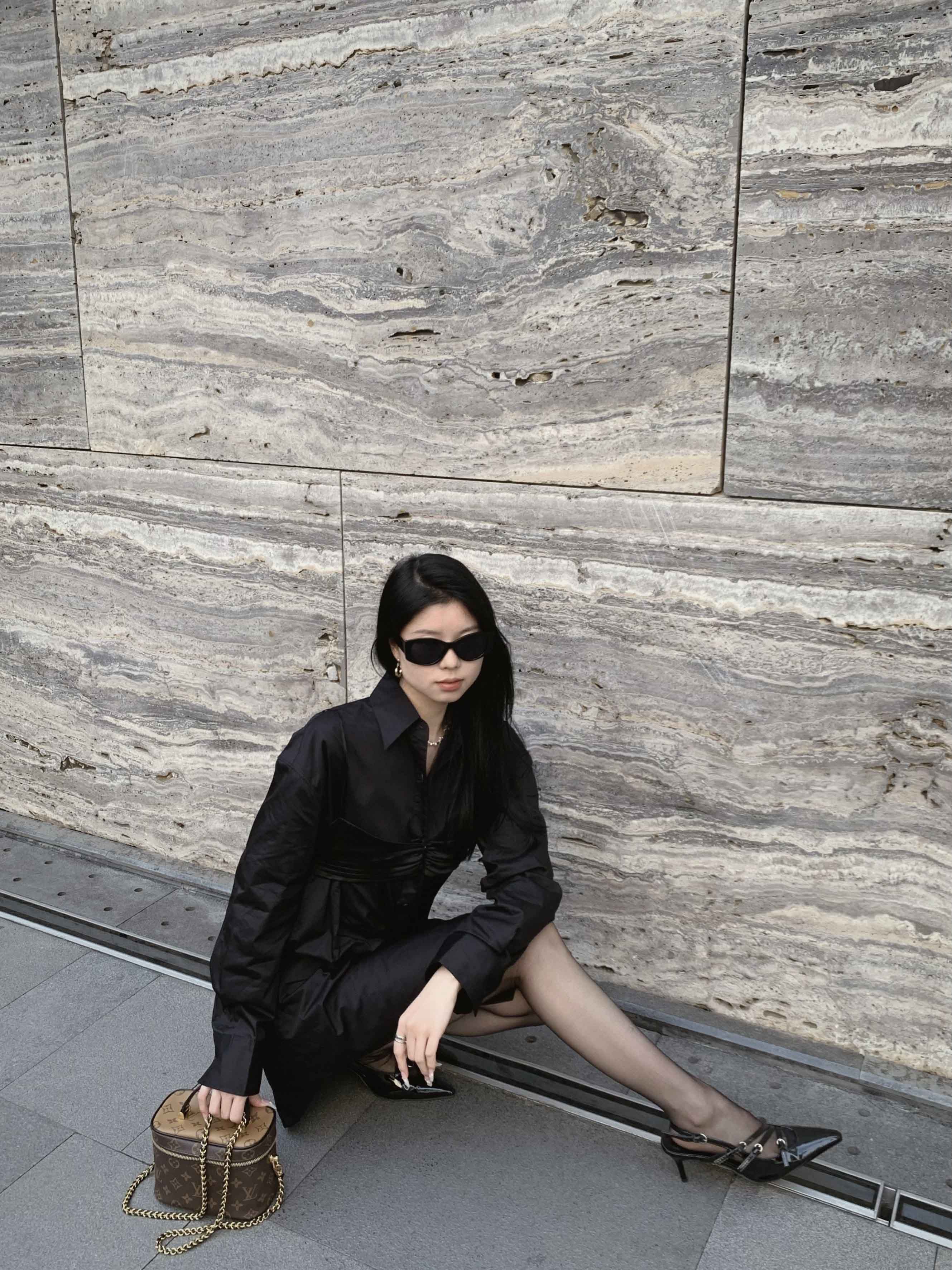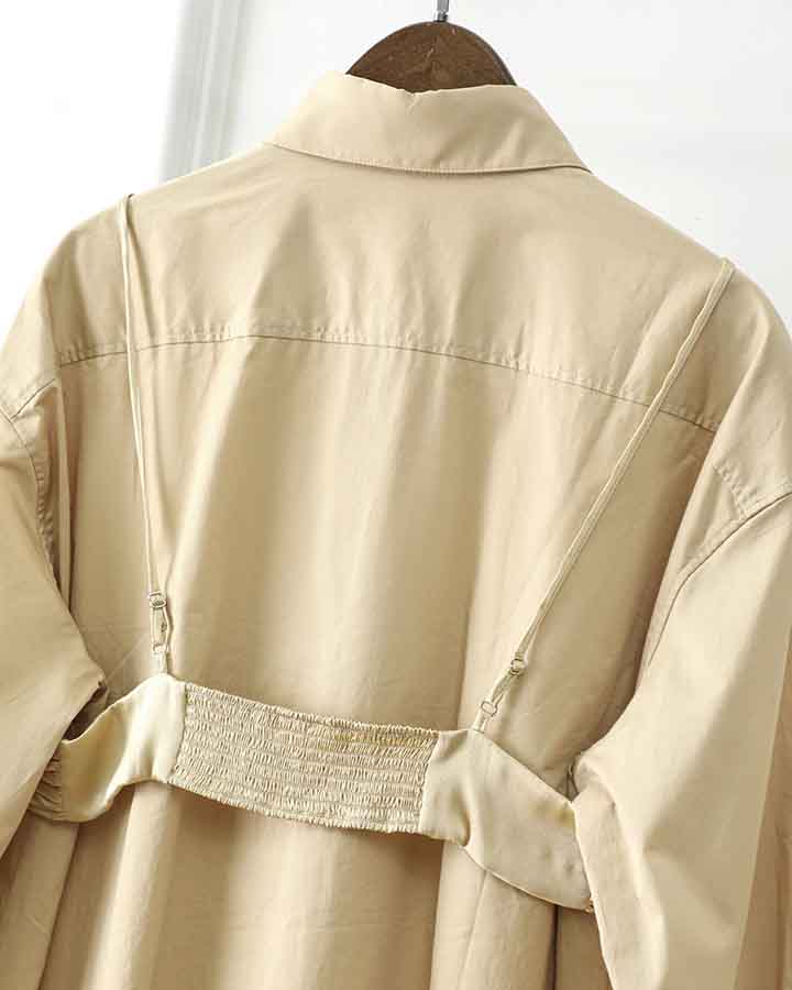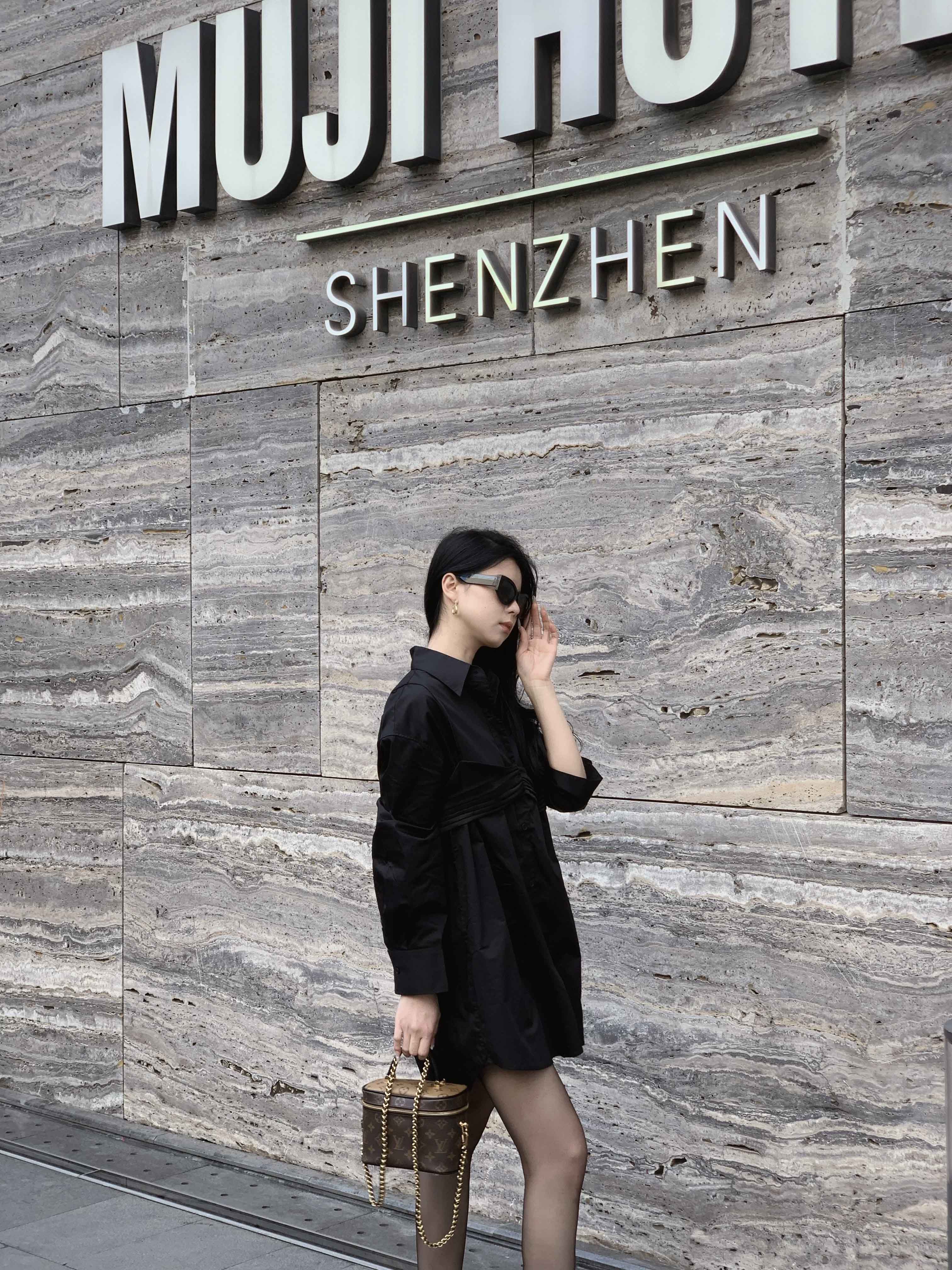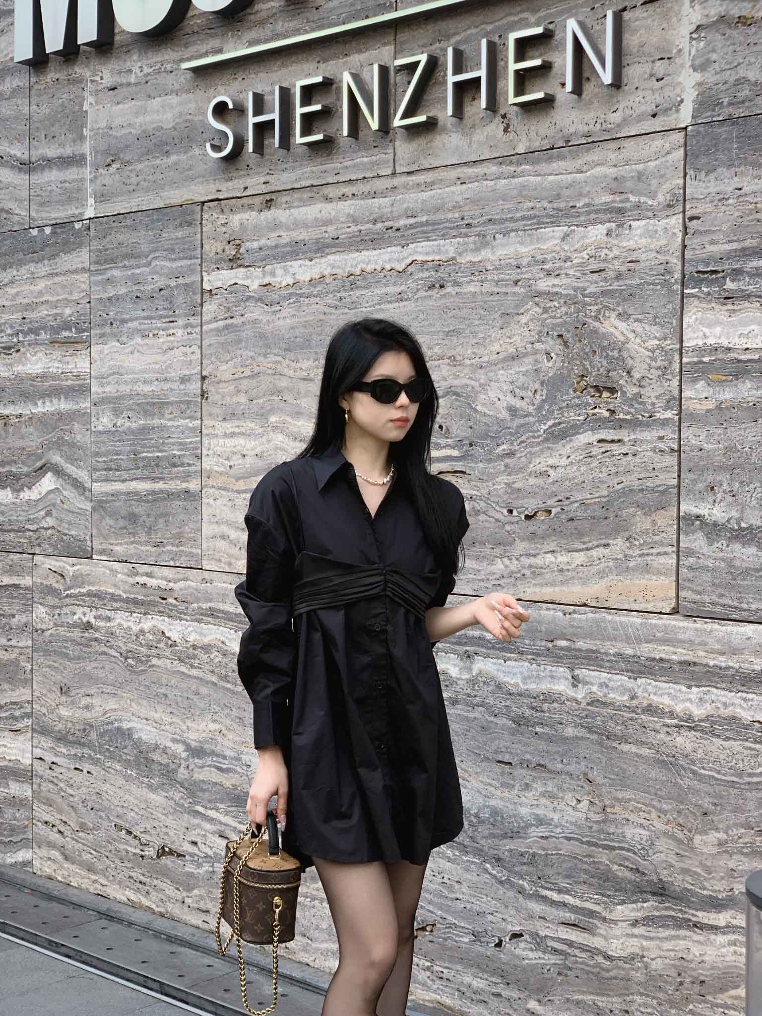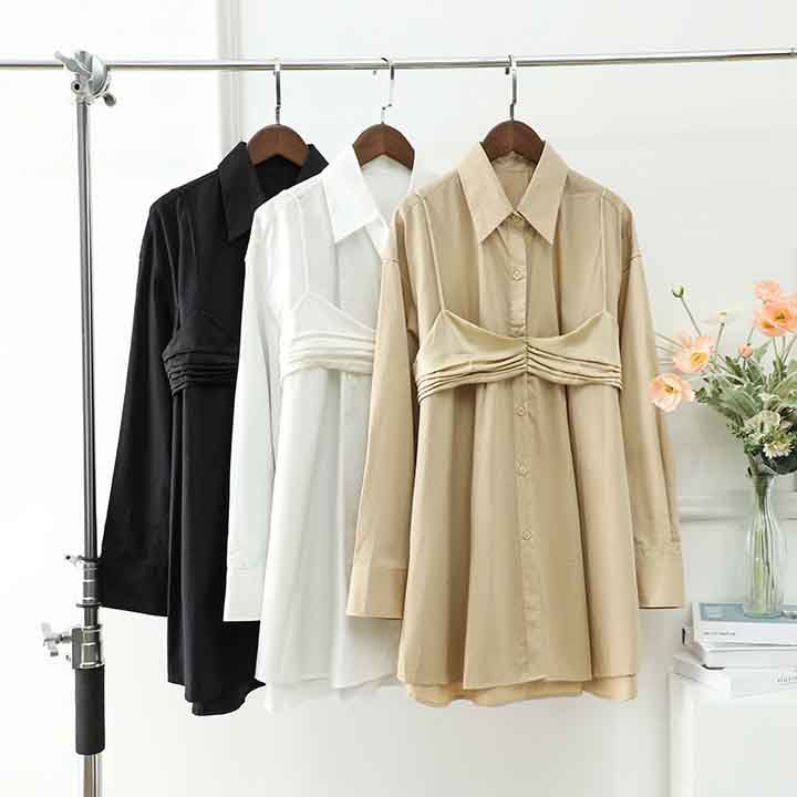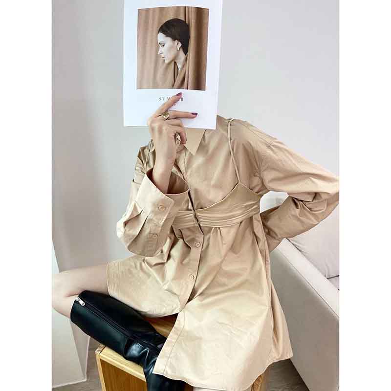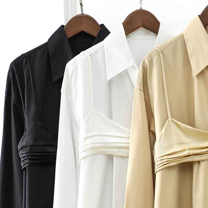 顺丰包邮洛诗琳13403早春设计感假两件中长款翻领衬衫裙60503