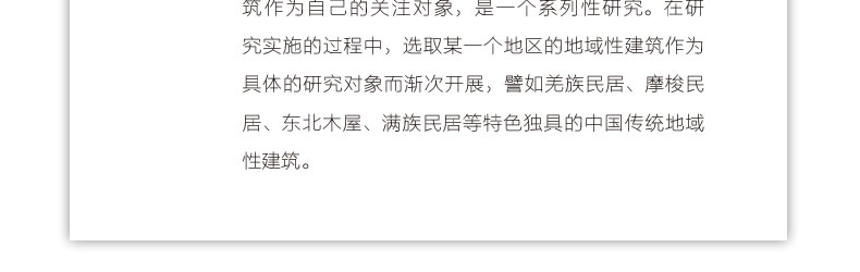 本丛书以中国传统地域性建筑作为自己的关注对象,是一个系列性的研究。在研究的过程中,选取某一个地区的地域性建筑作为具体的研究对象而渐次开展,譬如羌族民居、摩梭民居、东北木屋、满族民居等特色独具的中国传统地域性建筑。