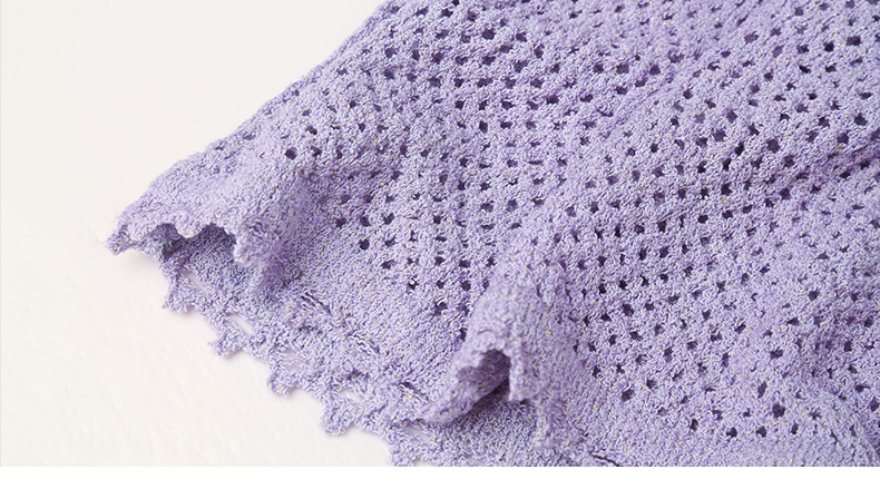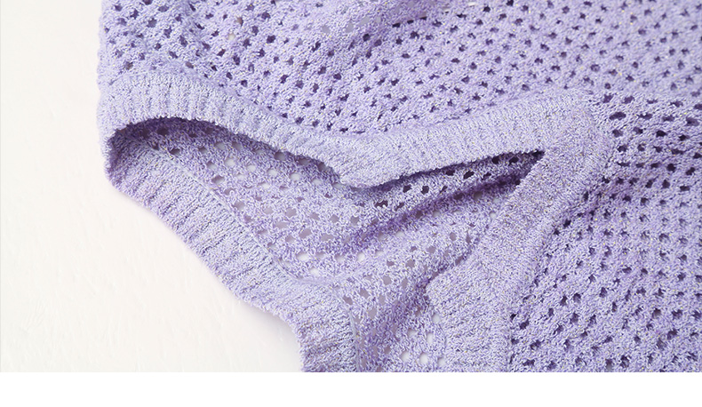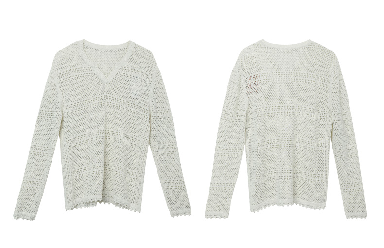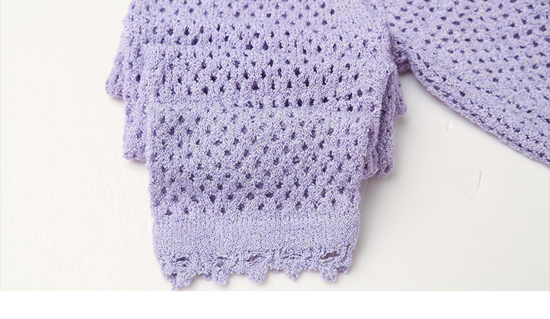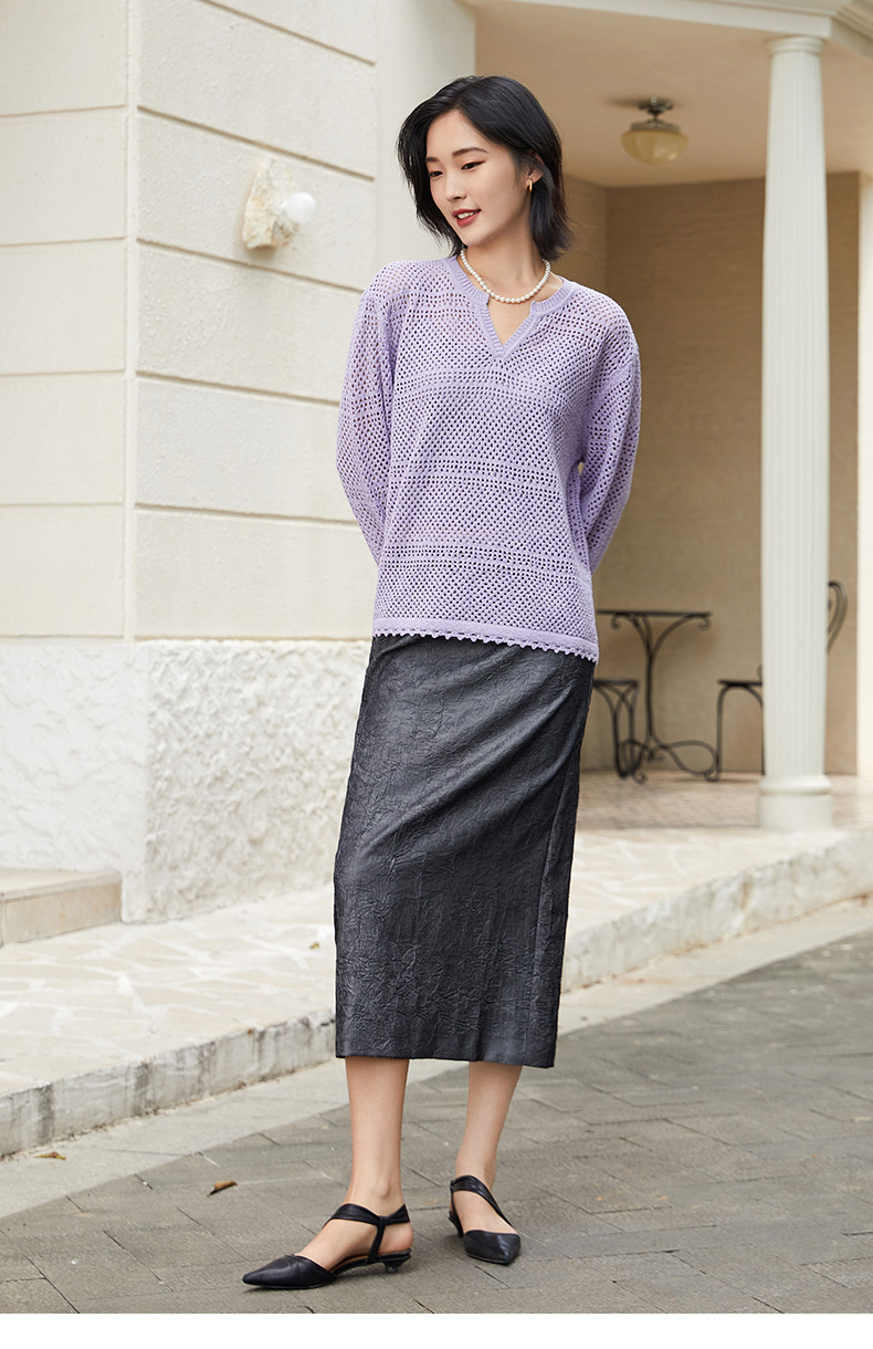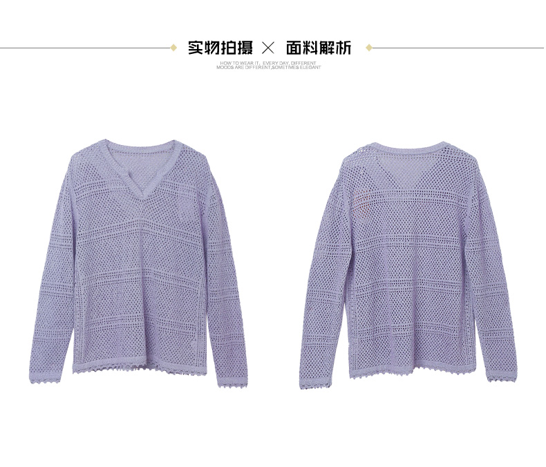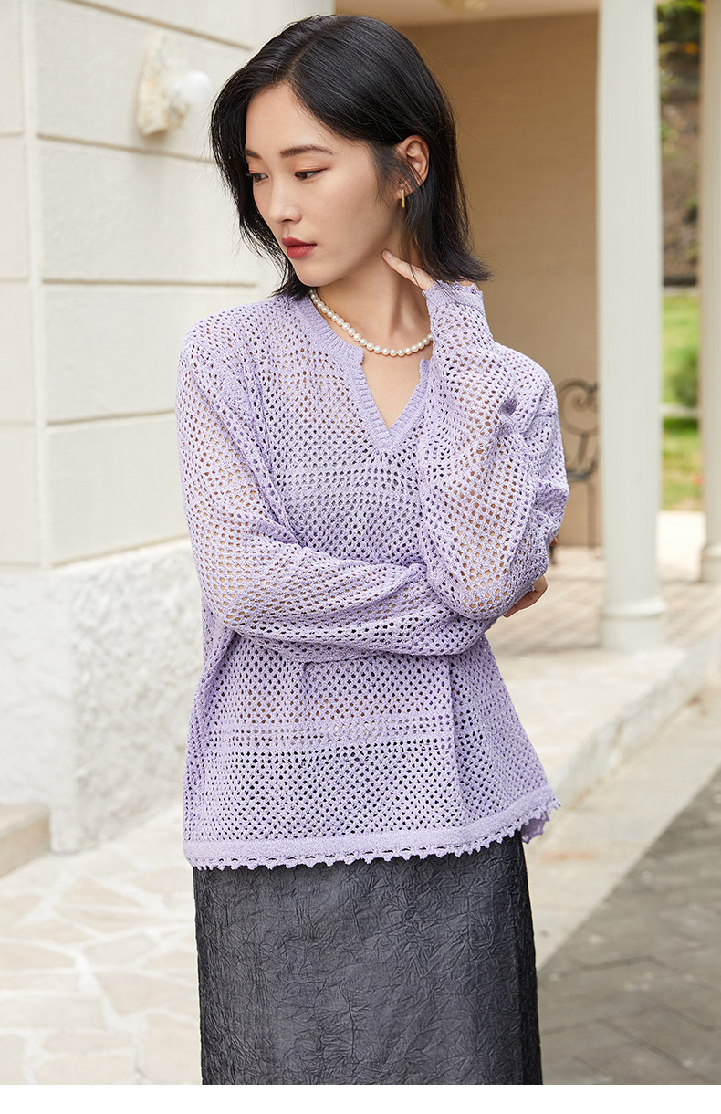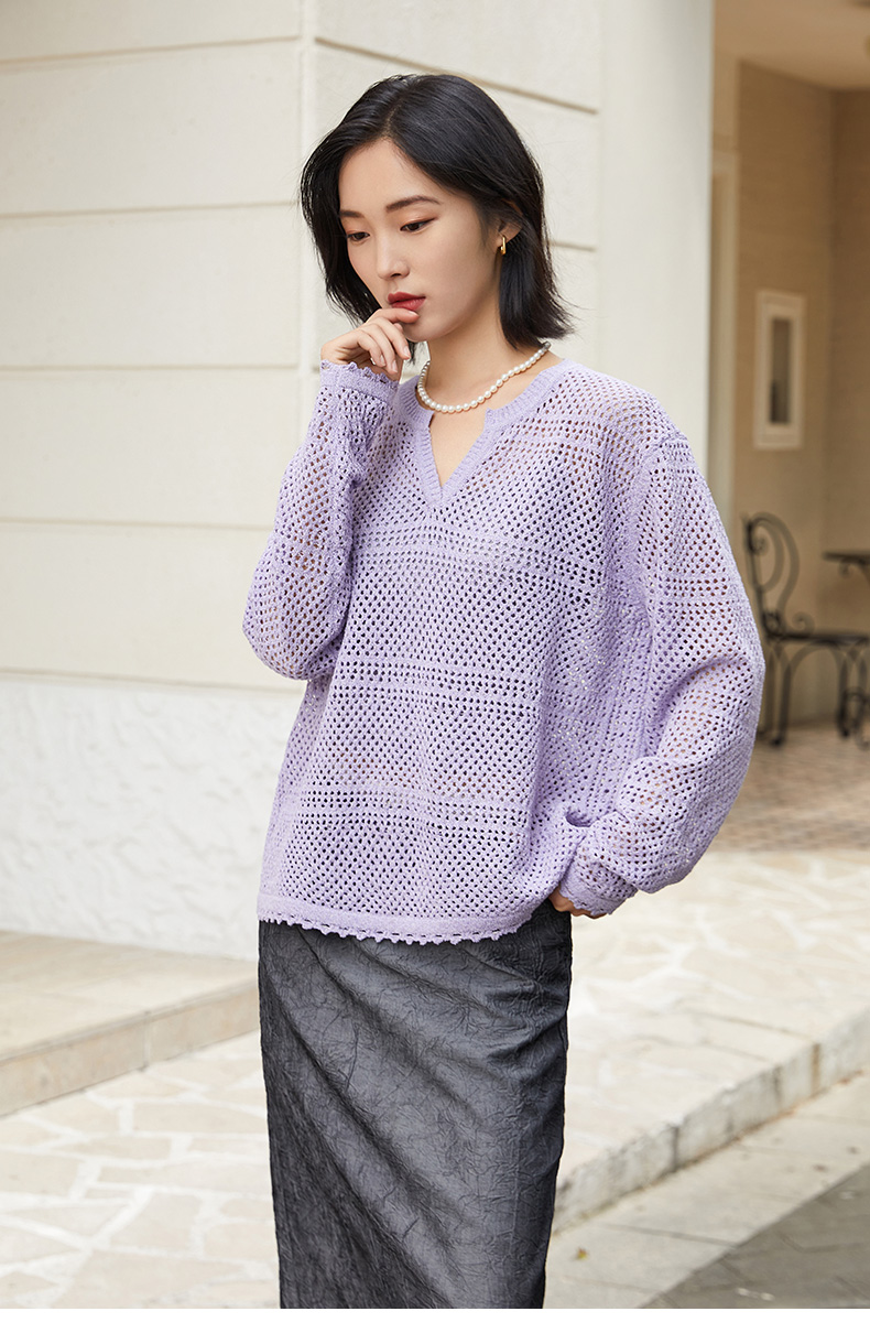 淡紫色 V 领镂空毛衣女 宽松灯笼袖 精致钩花慵懒风针织衫
