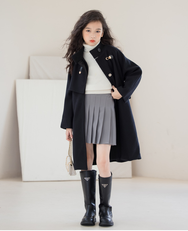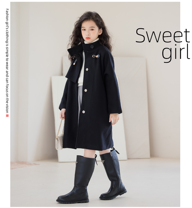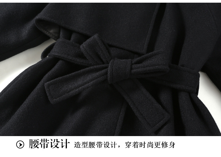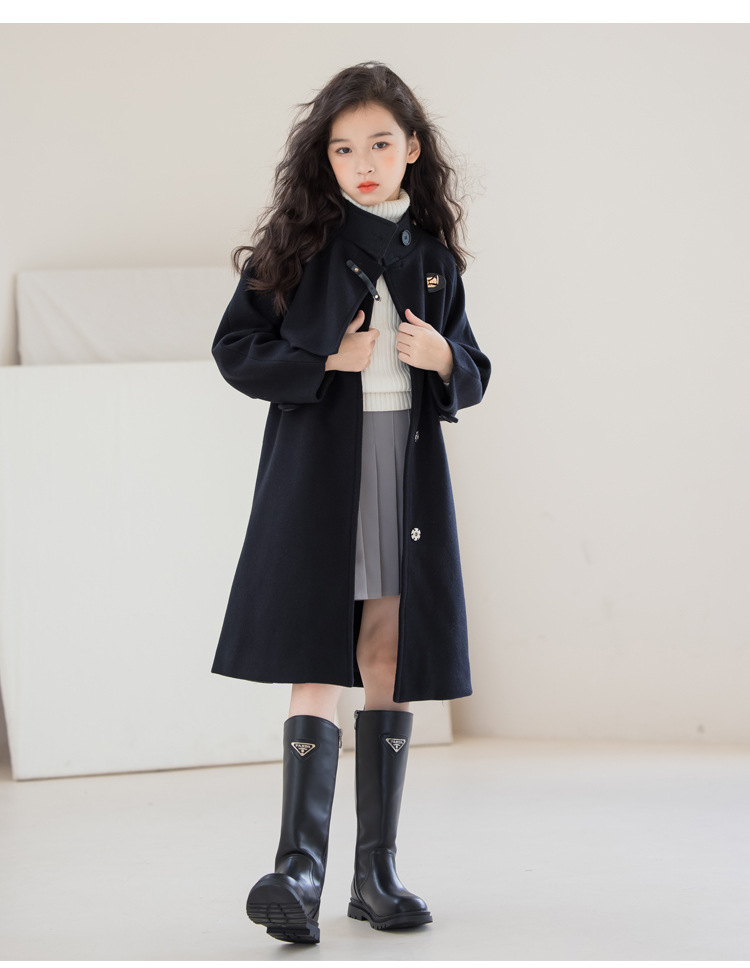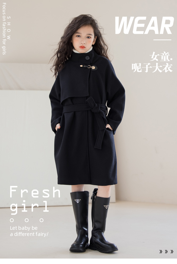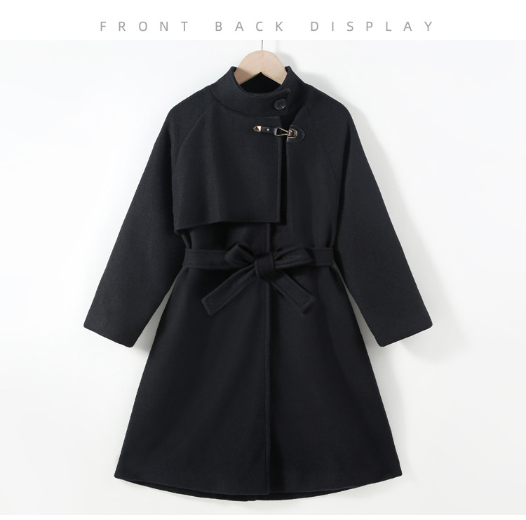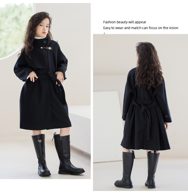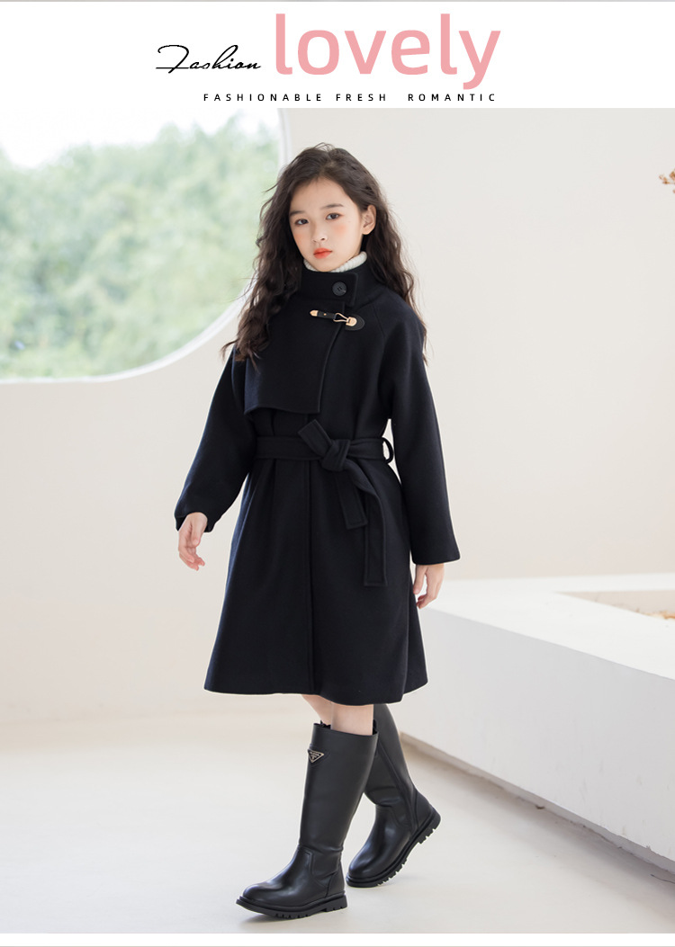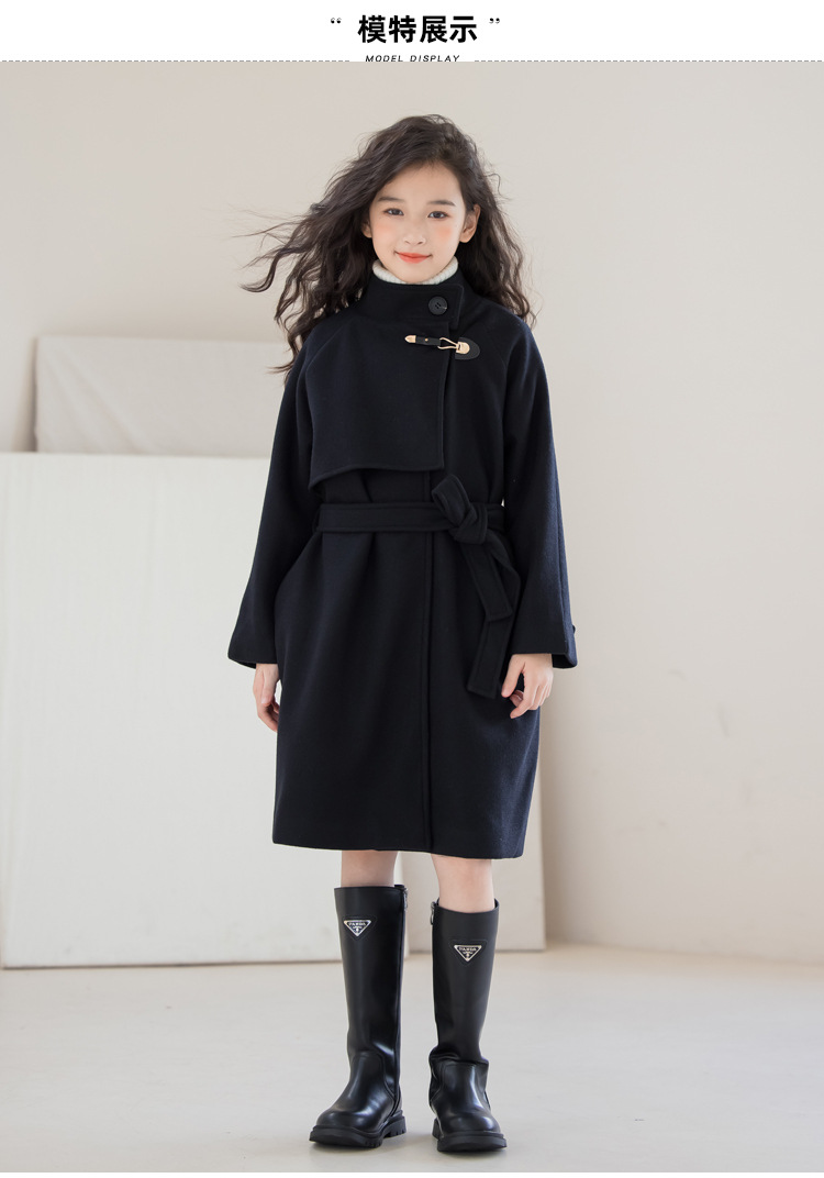 【造型腰带设计,穿着时尚更修身】女童毛呢外套 2024秋冬亲子装 母女韩版开衫 中长款大童女装呢子大衣-QQ