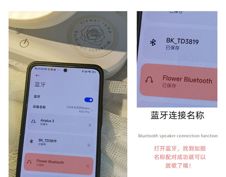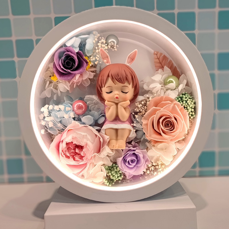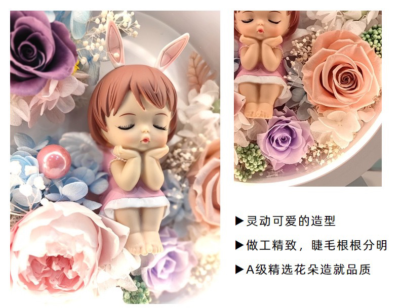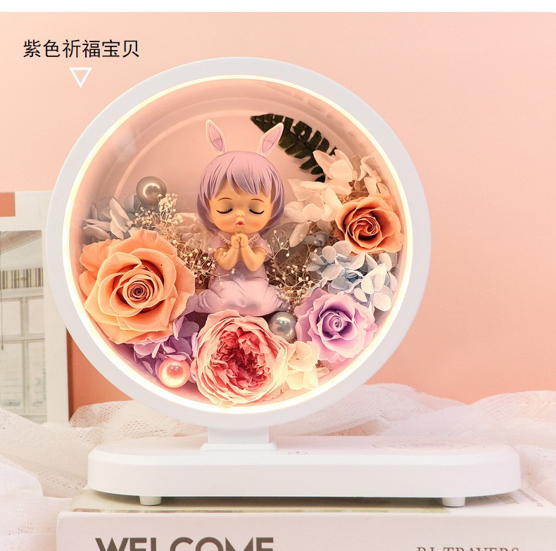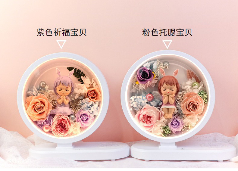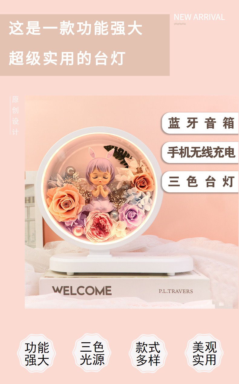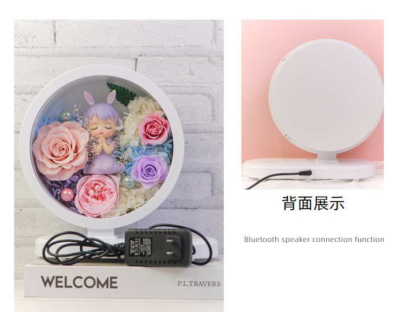 两款可选,三合一 台灯,蓝牙音箱,手机无线充。可配送,可到店自提,生日礼物,乔迁,装饰自用,告白礼物,伴手礼。灵动可爱的造型。做工精致,睫毛根根分明,A级精选花朵造就品质。台灯三色可调。尺寸高25厘米宽23厘米,厚度10厘米。