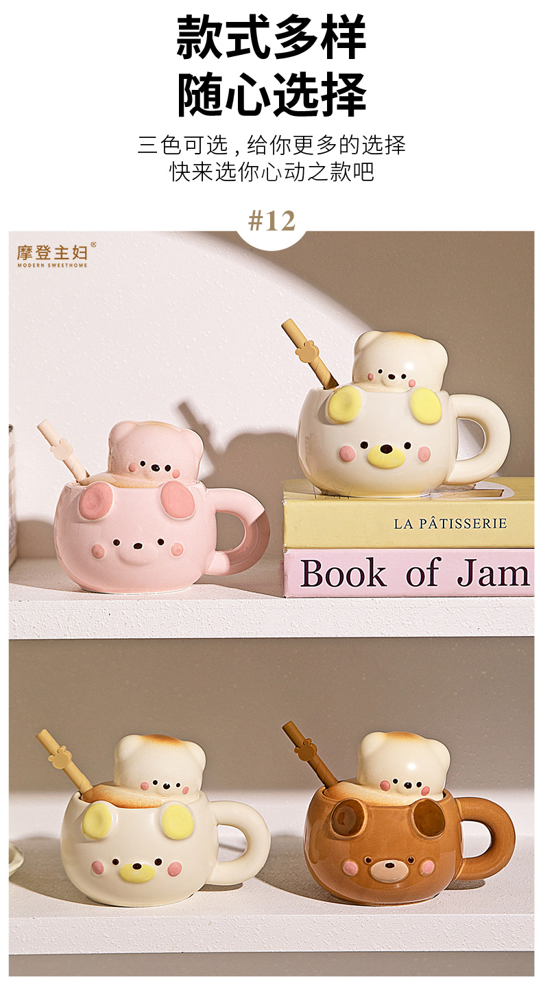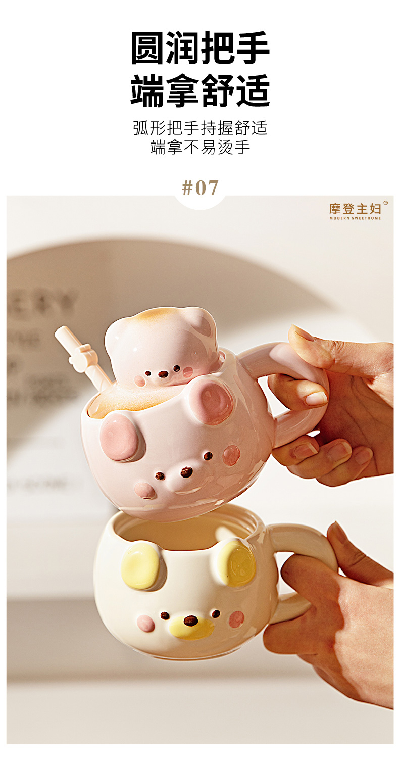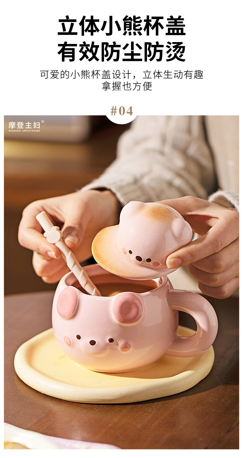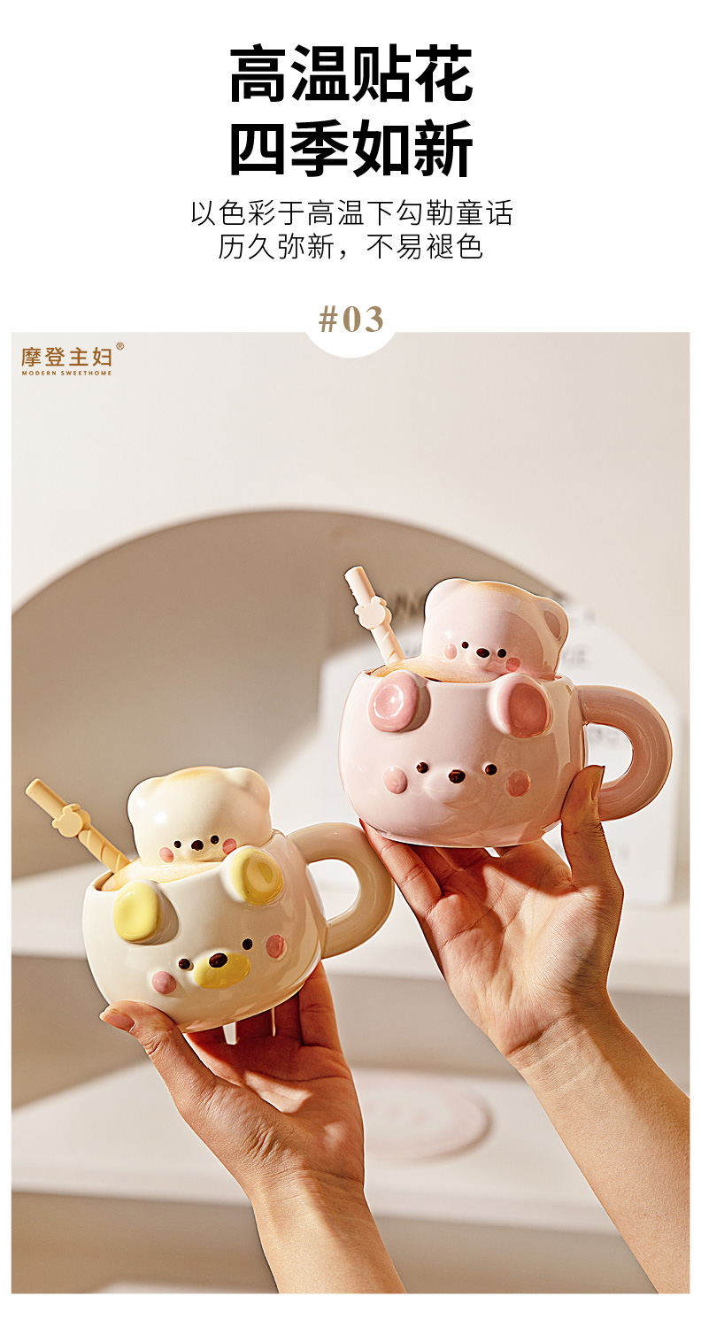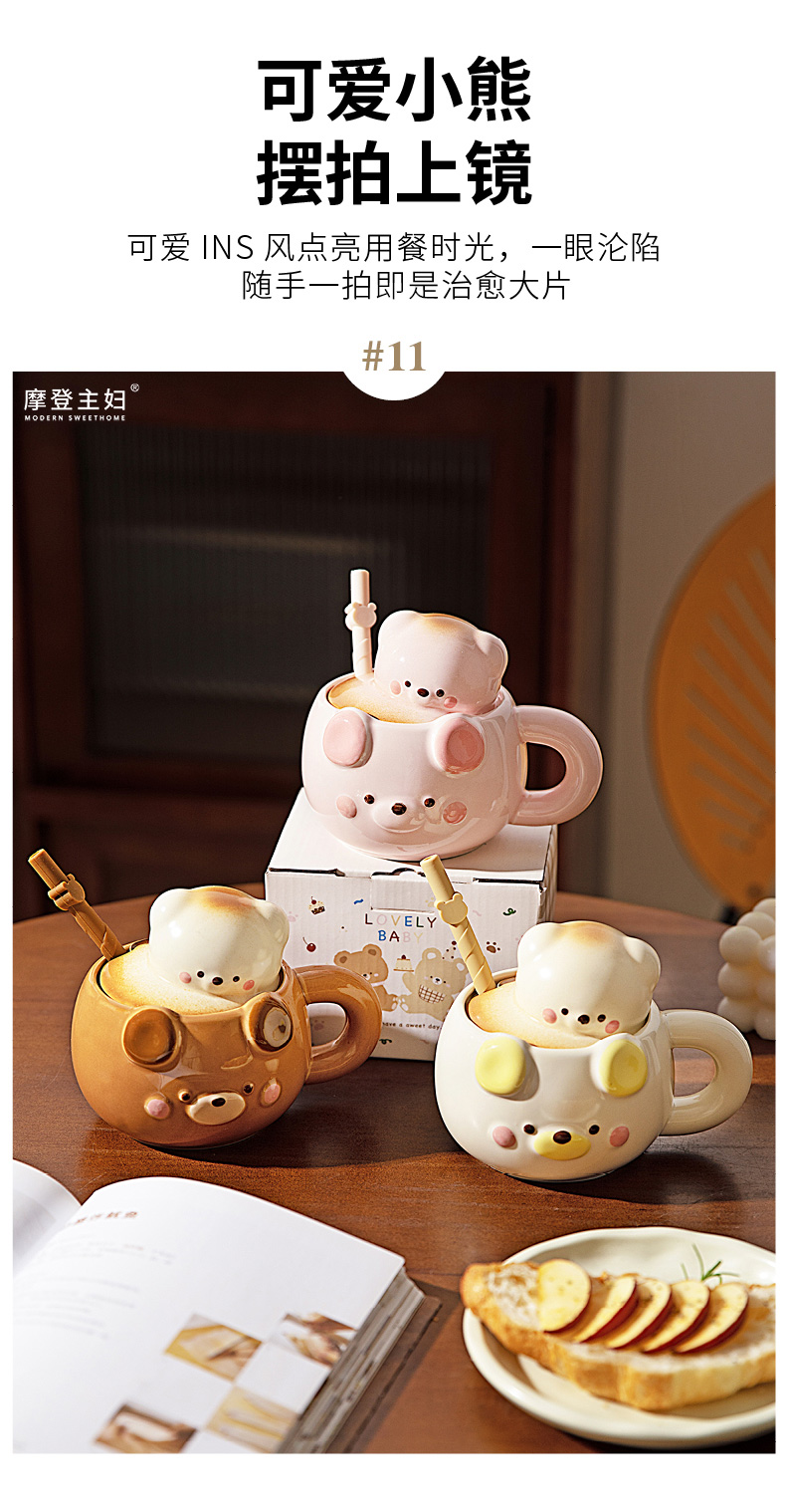 摩登主妇小熊带盖马克杯陶瓷水杯高颜值家用喝水杯吸管杯咖啡杯子