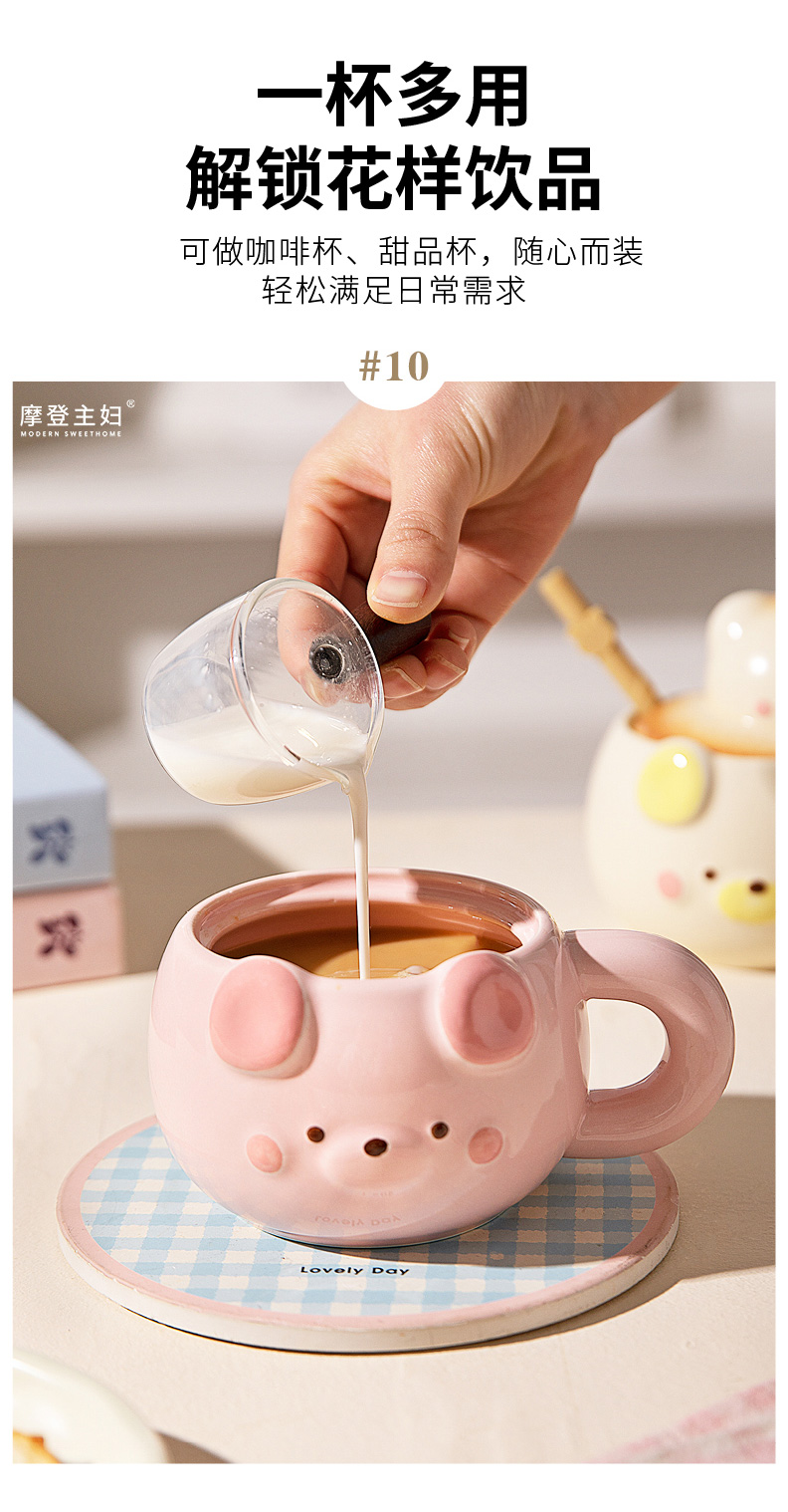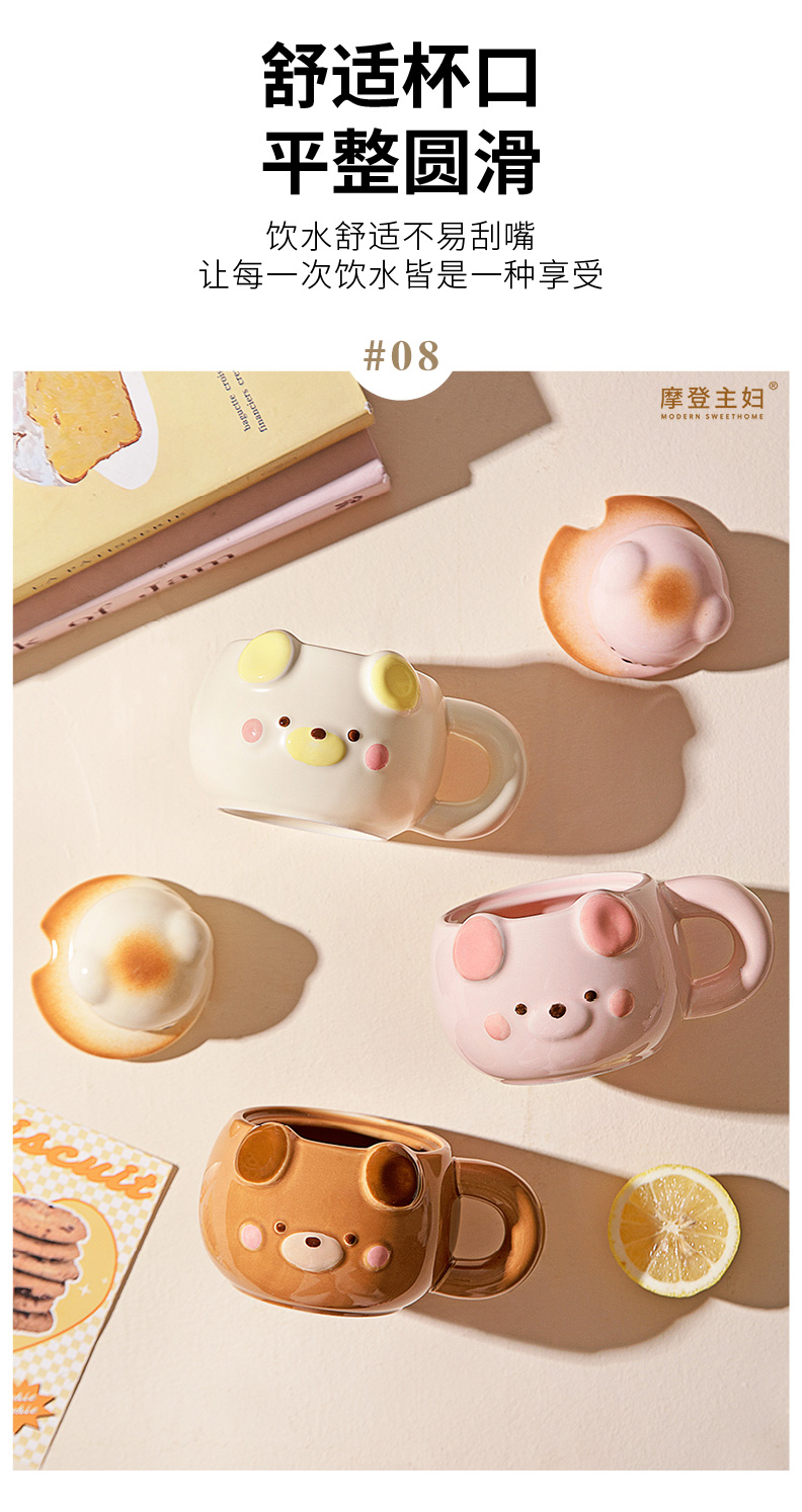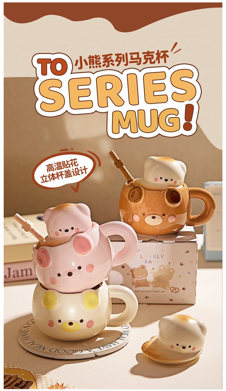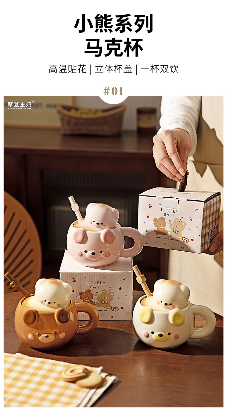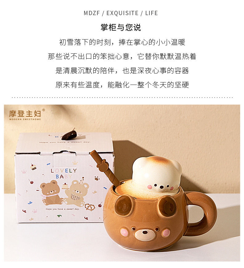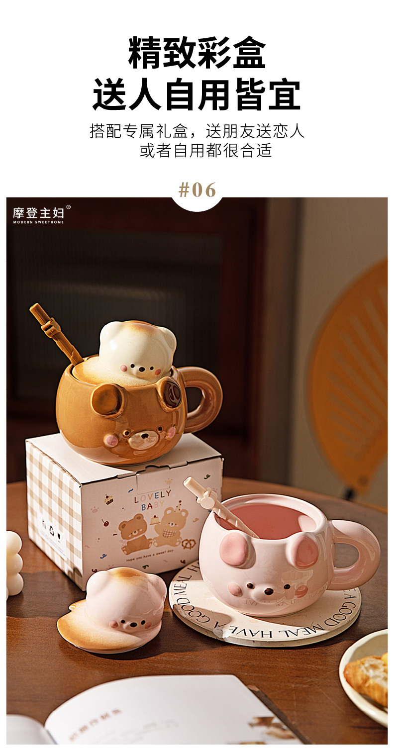 摩登主妇小熊带盖马克杯陶瓷水杯高颜值家用喝水杯吸管杯咖啡杯子