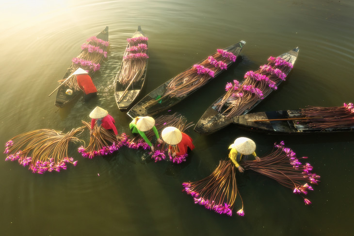 拍摄亮点:船上打莲、雾气晨光、倒影构图、越南奥戴配传统斗笠的柔美水乡场景