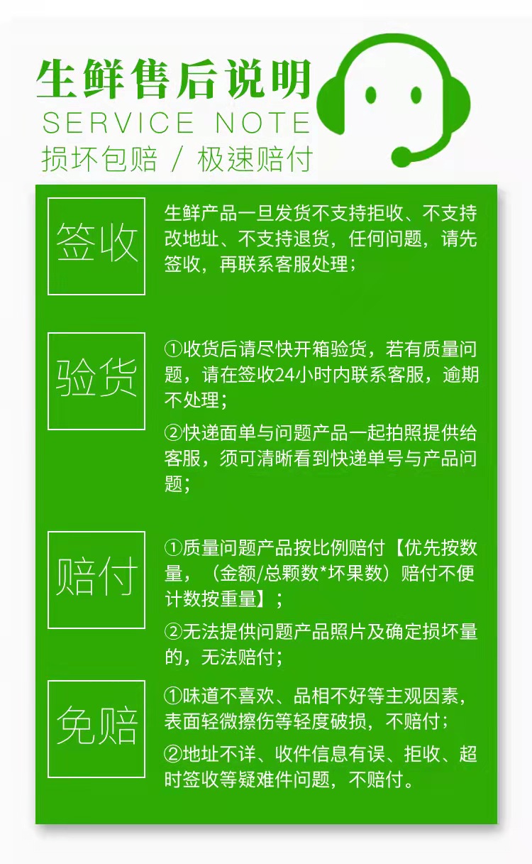 【关于拒收】:口感不好,品相不好,表皮轻微扎破擦伤,挤压伤不影响食用,地址不详,电话错误疑难件,拒收,签收超时,不赔付。