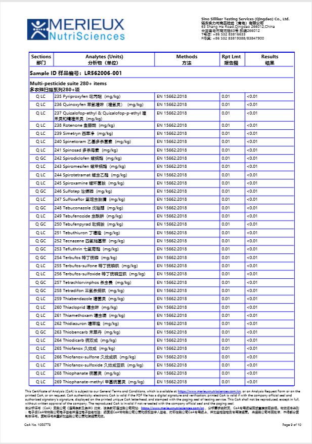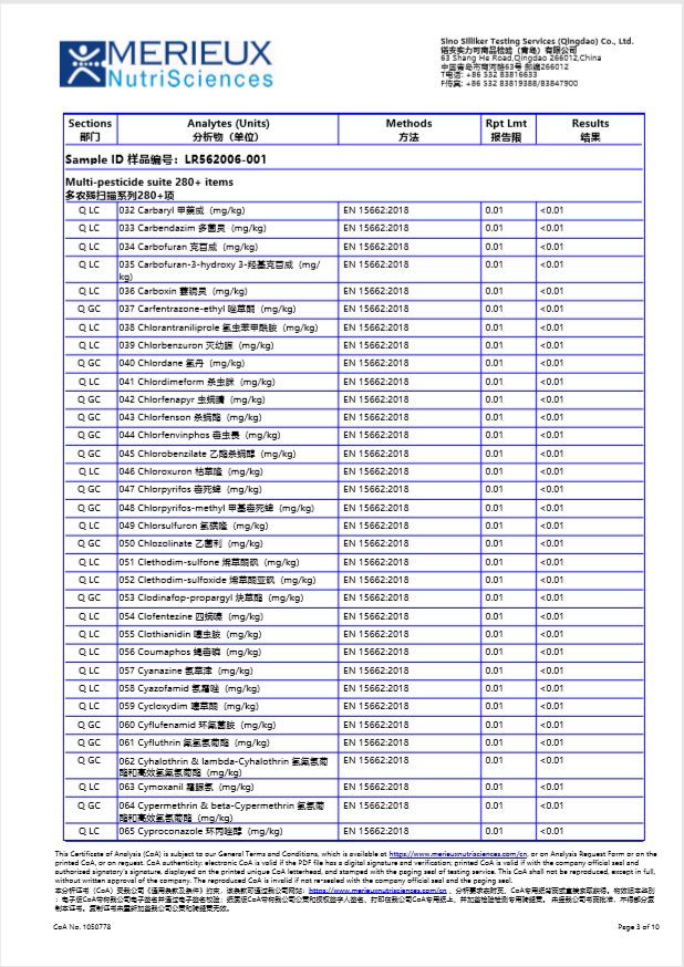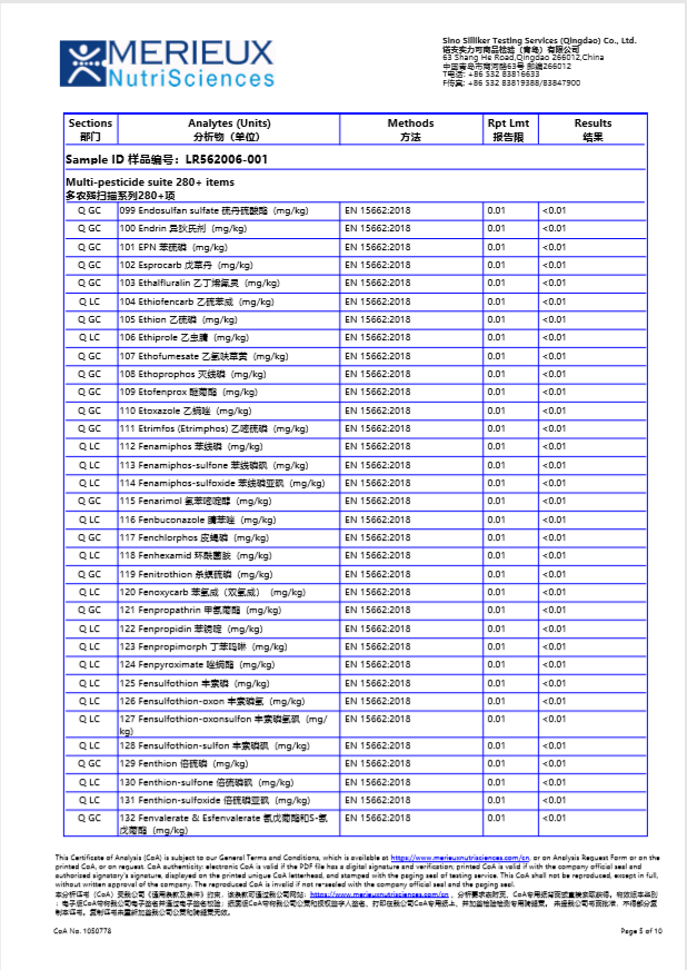 稻米每年会送青岛诺安进行农残与重金属检测,284项农残未检出,六项重金属远低于国标。