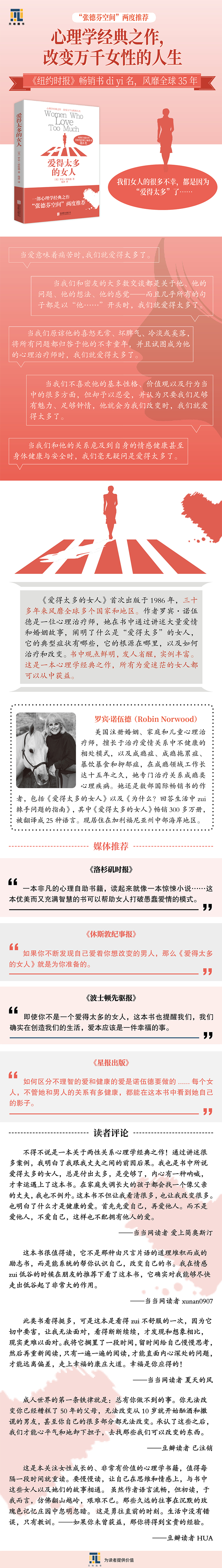 《爱得太多的女人》首次出版于1986年,二十多年来风靡全球多个国家和地区。作者罗宾·诺伍德是一位心理治疗师,她在书中通过讲述大量爱情和婚姻故事,阐明了什么是“爱得太多”的女人,它的典型症状有哪些,它的根源在哪里,以及如何治疗和改变。书中观点鲜明,发人省醒,实例丰富,极富教育性和可读性。