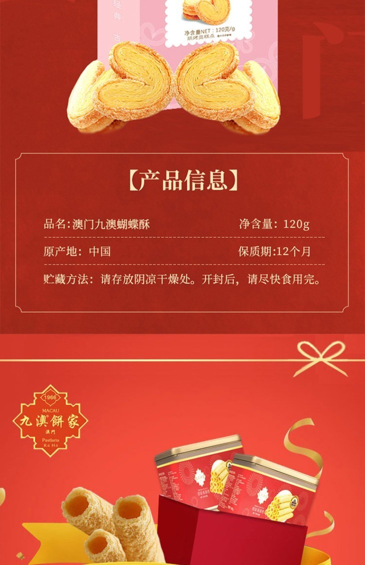 品名:澳门九澳蝴蝶酥 规格1:蝴蝶酥120g/盒*3盒;拍几份发几个包裹,不一定能同时到达,请耐心等待 发货地/产地:福建漳州 包装方式:盒装+独立袋装 物流信息:默认圆通/中通发货,不支持指定快递 发货区域:新疆、西藏、海南内蒙、甘肃、宁夏、青海不发;北京、上海+1元; 物流详情:周六、周日及节假日除外,正常48小时内发货,到货时间约为2~5天,请耐心等待 售后说明:收到货后有质量问题,在24小时内都可以拍照(坏果+快递单面箱子一起拍)上传,申请按坏果比例理赔或联系客服,生鲜性质特殊,因地址错误,手机号联系不上,拒收等造成的损失无法售后,请理解; |